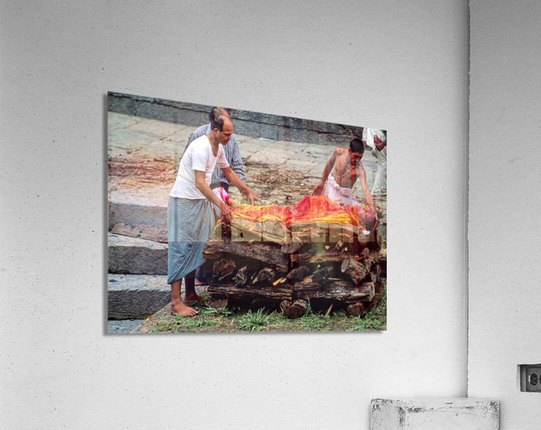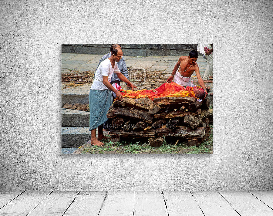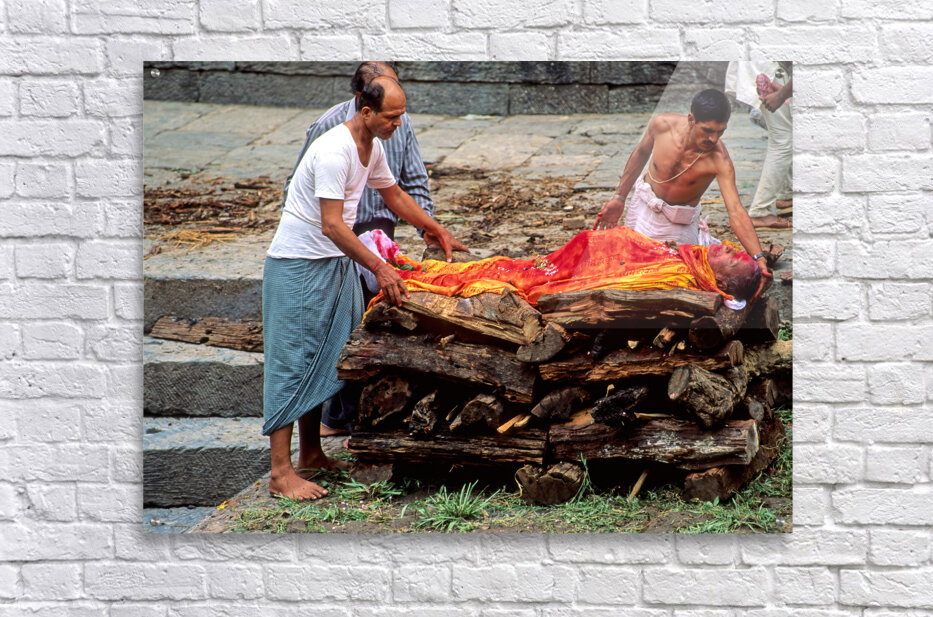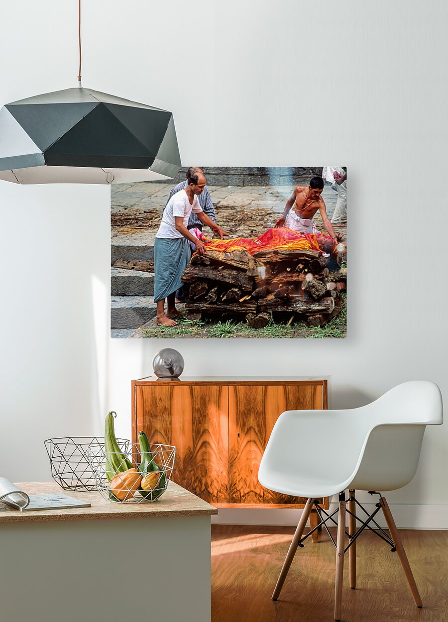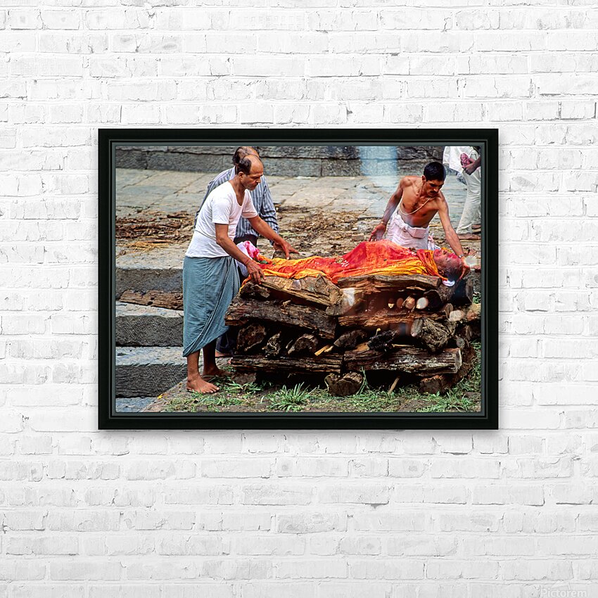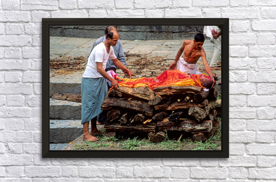 "Nepal. Kathmandu. Cremation in Pashupatinath" in a framed print.