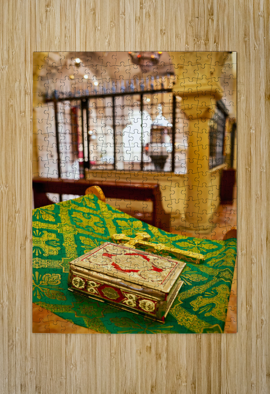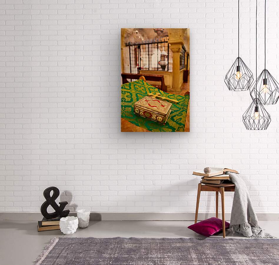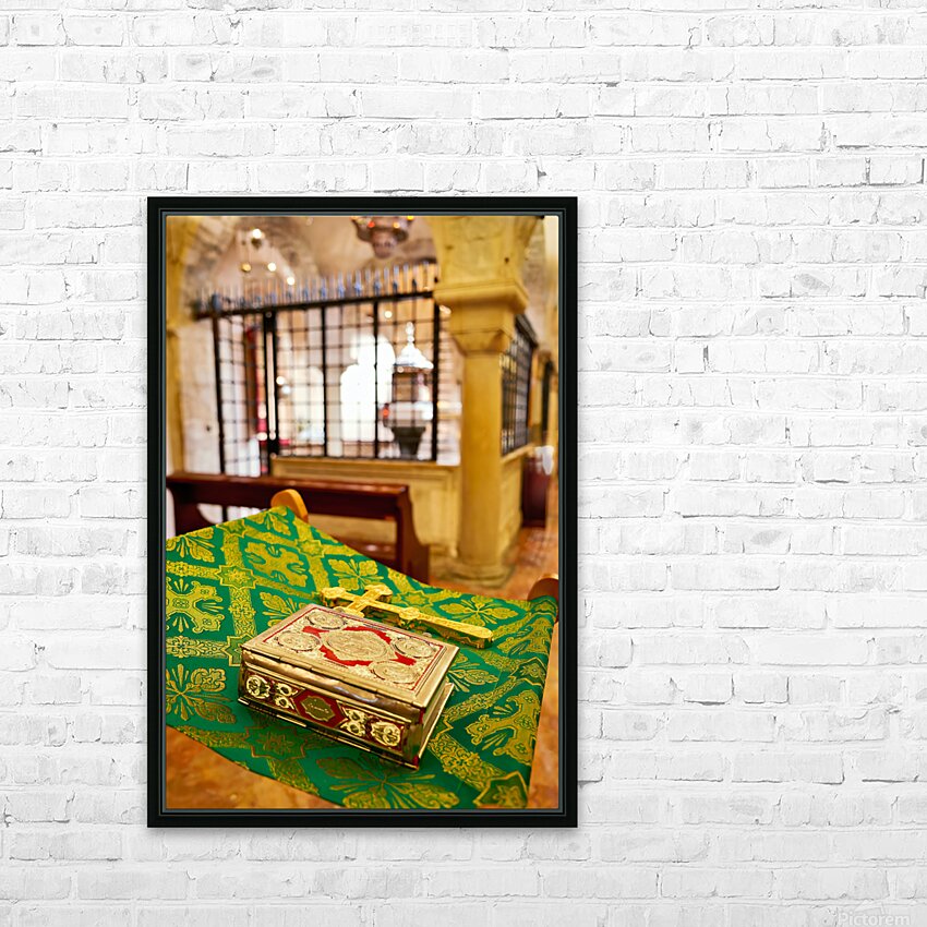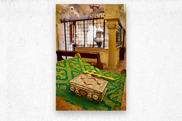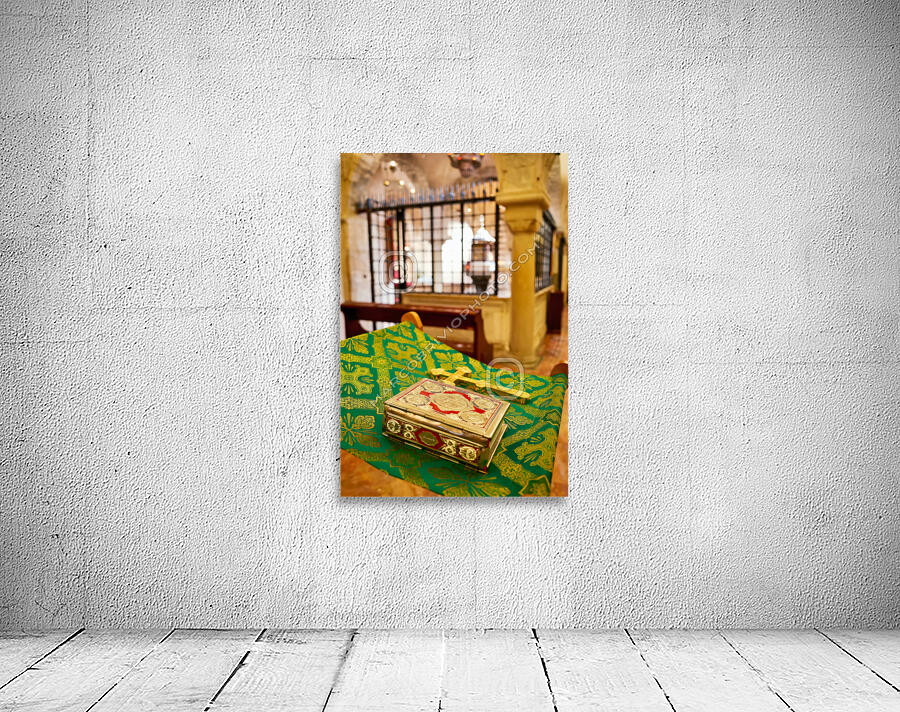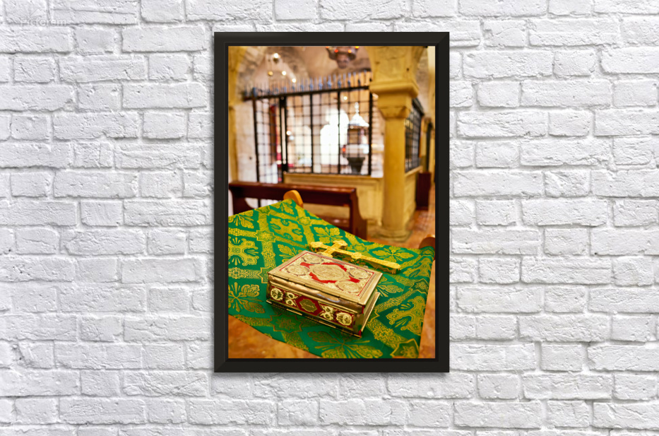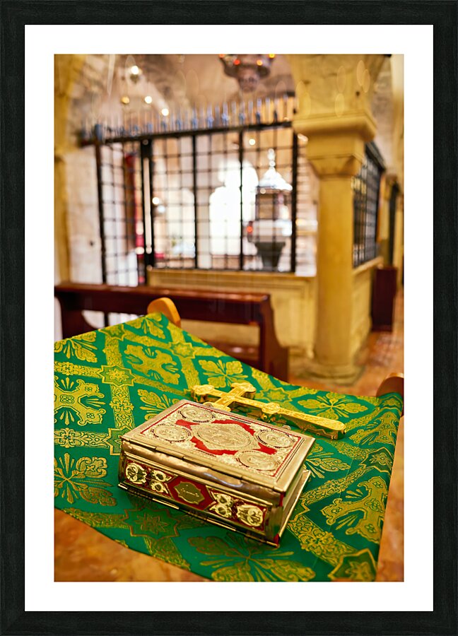 "Apulia Puglia Italy. Bari. The Pontifical Basilica of Saint Nicholas. The Holy Bible" in a framed print.