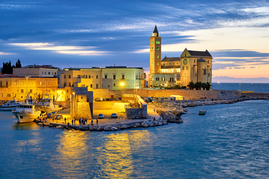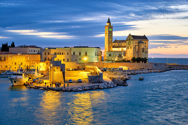 Apulia Puglia Italy. Trani. Basilica Cattedrale Beata Maria Vergine Assunta dedicated to Saint Nicholas at dusk