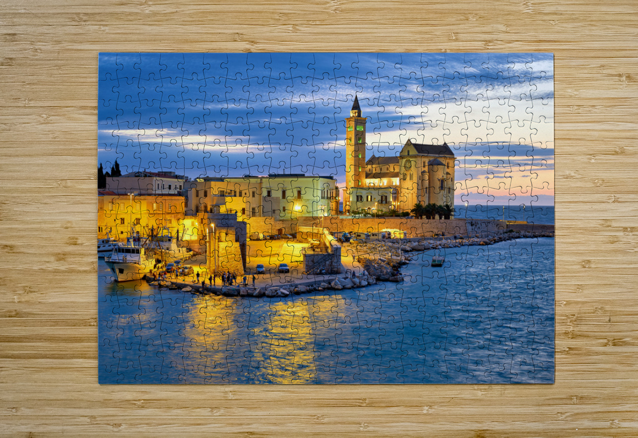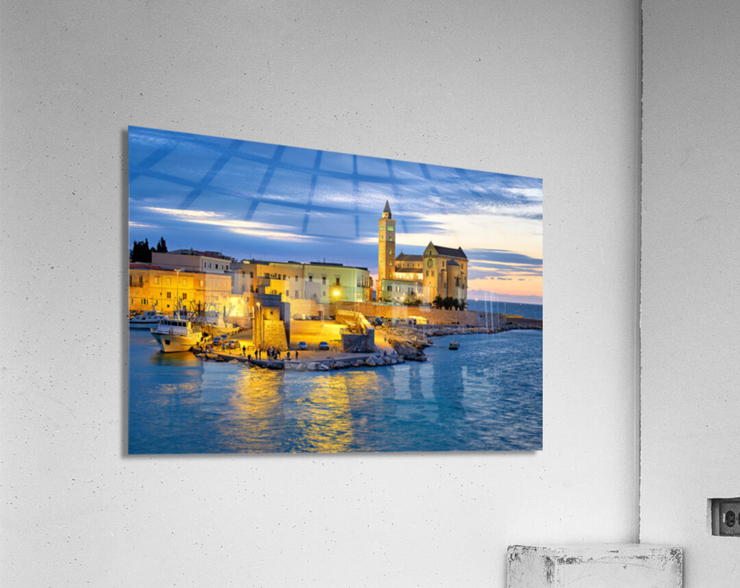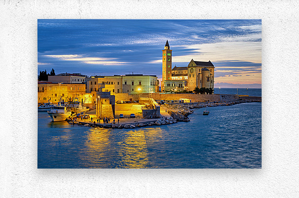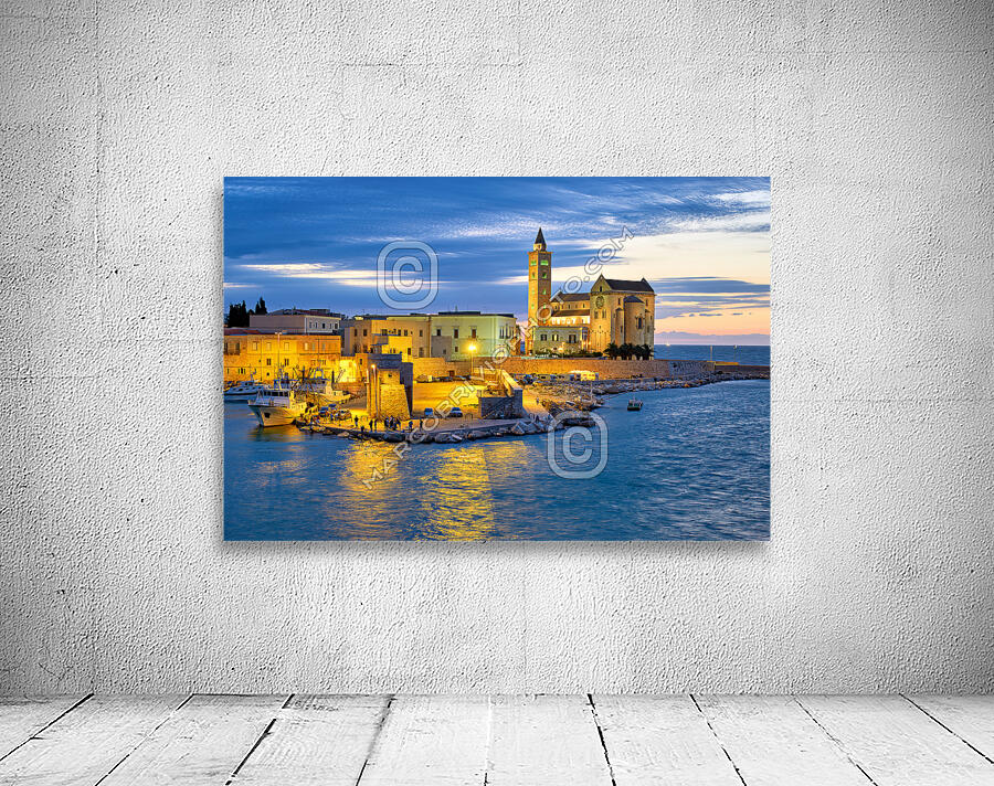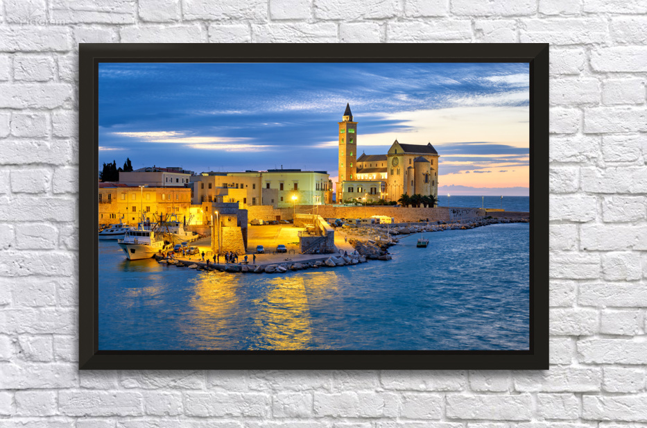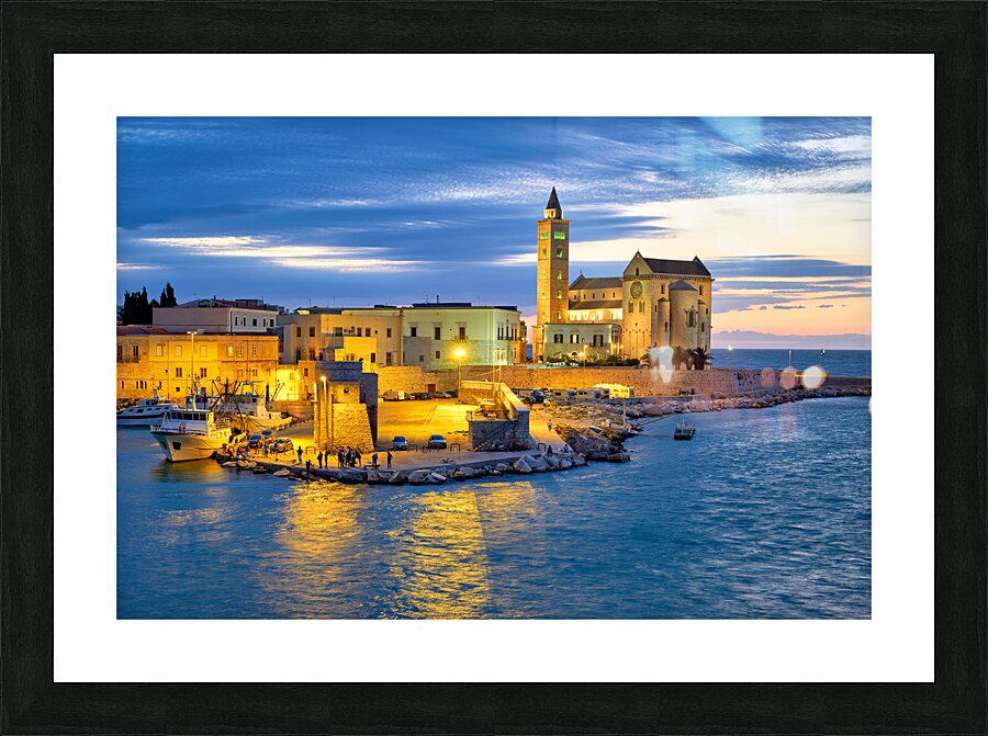 "Apulia Puglia Italy. Trani. Basilica Cattedrale Beata Maria Vergine Assunta dedicated to Saint Nicholas at dusk" in a framed print.