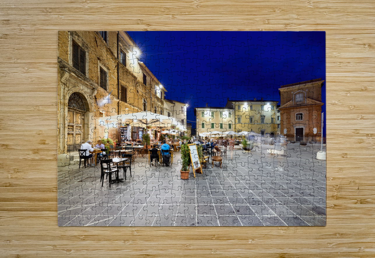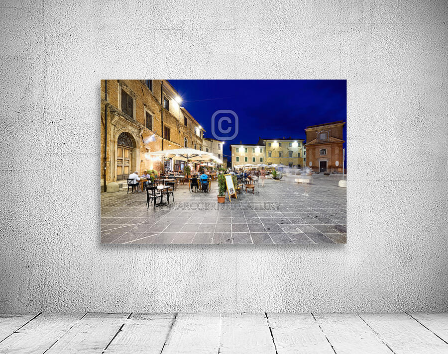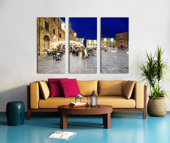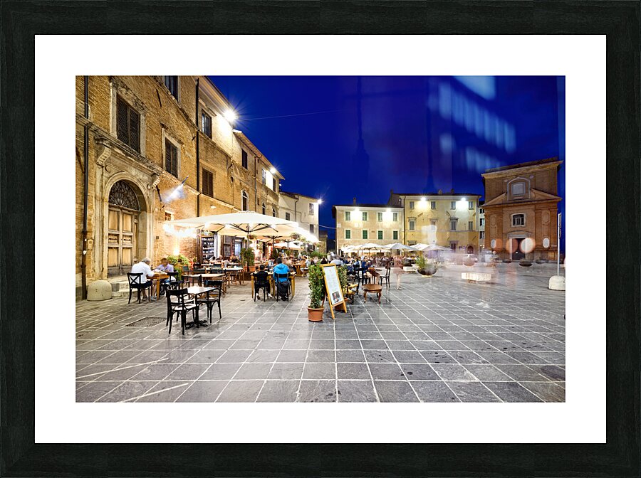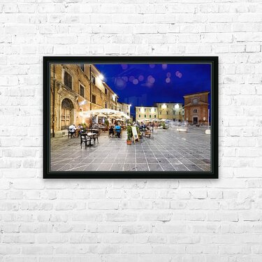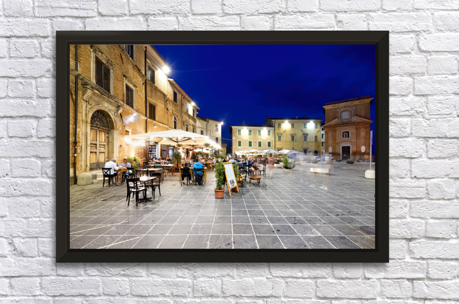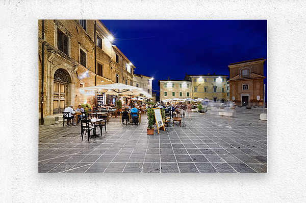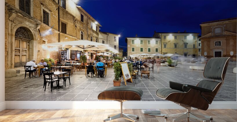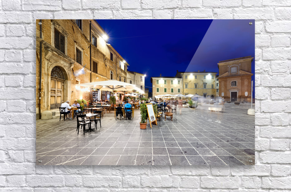 Montefalco Umbria Italy. Piazza del Comune at sunset. People eating out