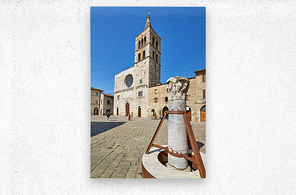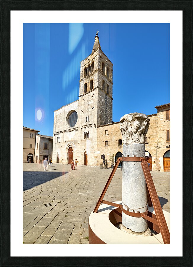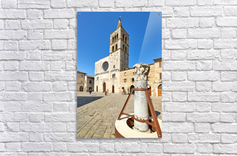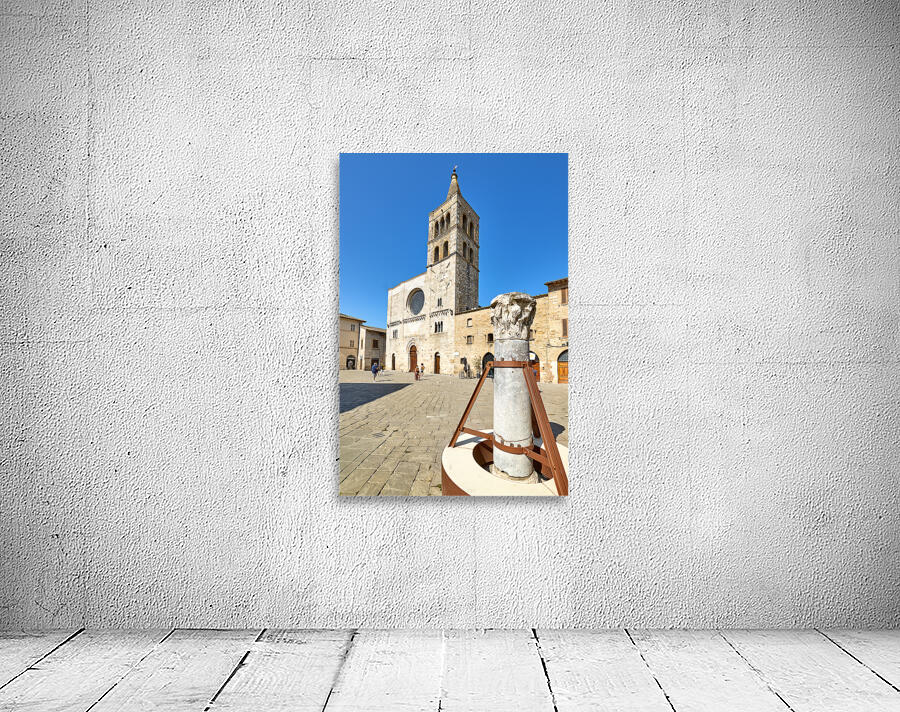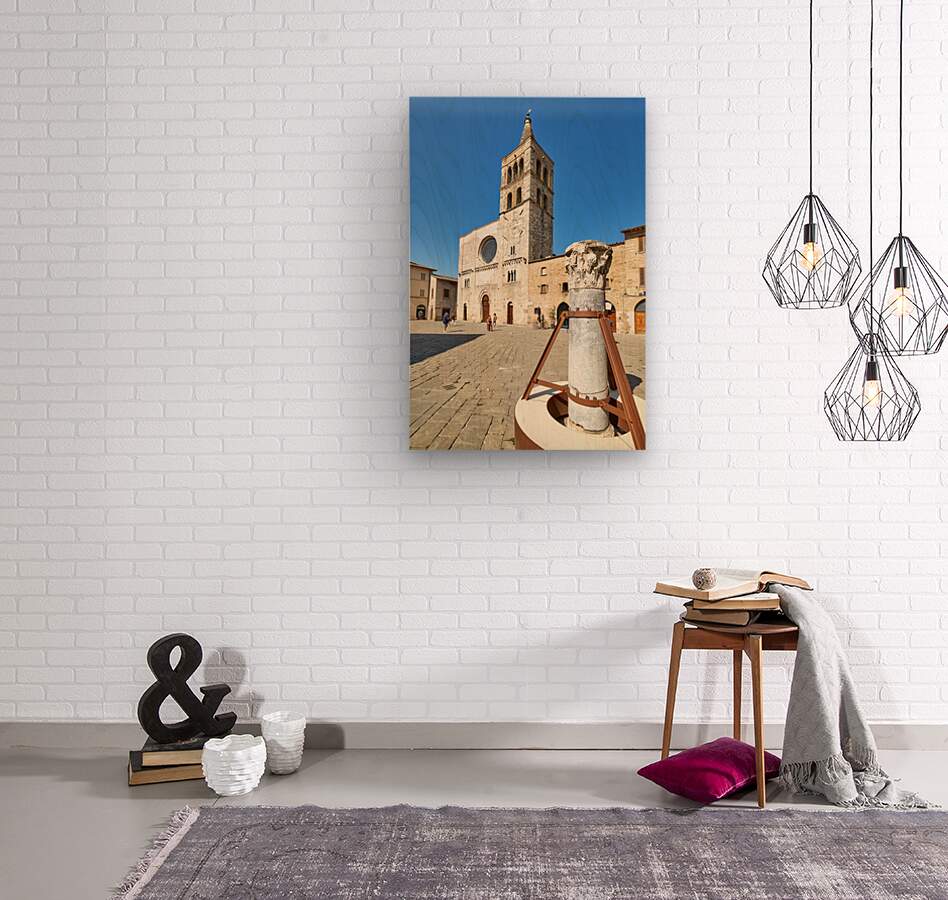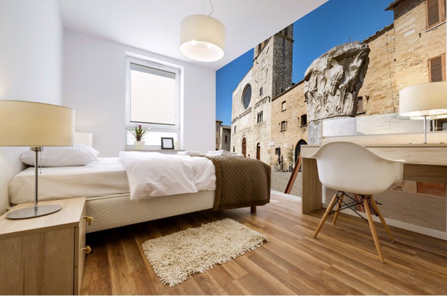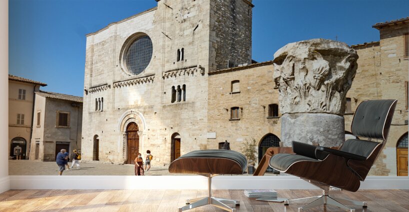 Bevagna Umbria Italy. San Michele Arcangelo church and roman column in San Silvestro square