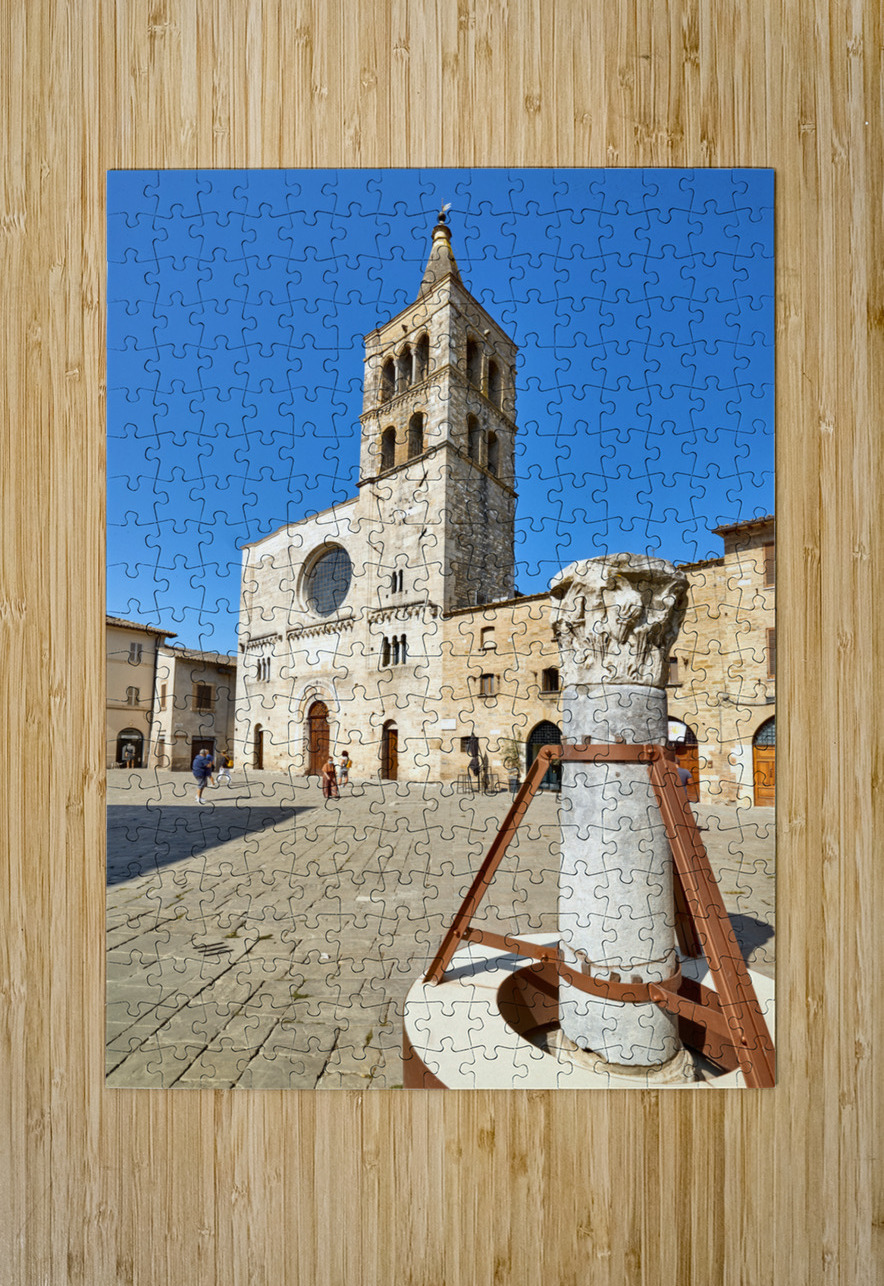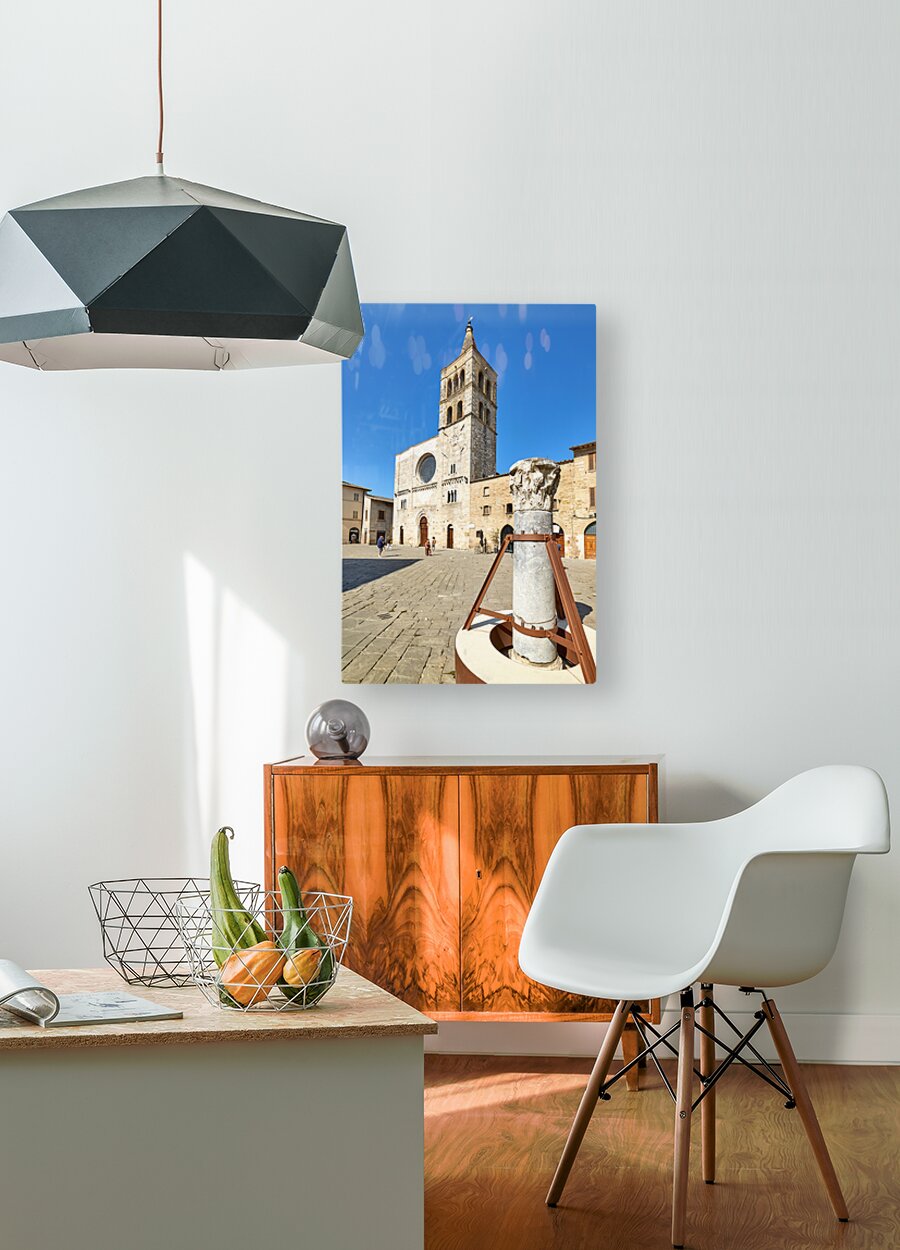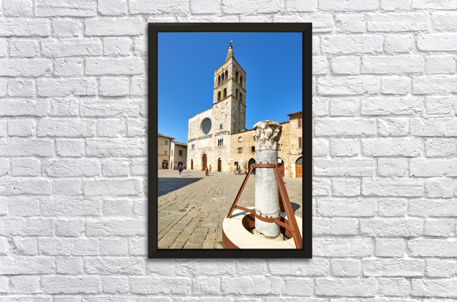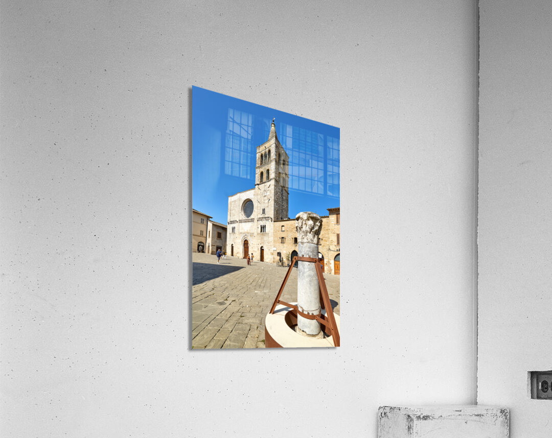 Bevagna Umbria Italy. San Michele Arcangelo church and roman column in San Silvestro square