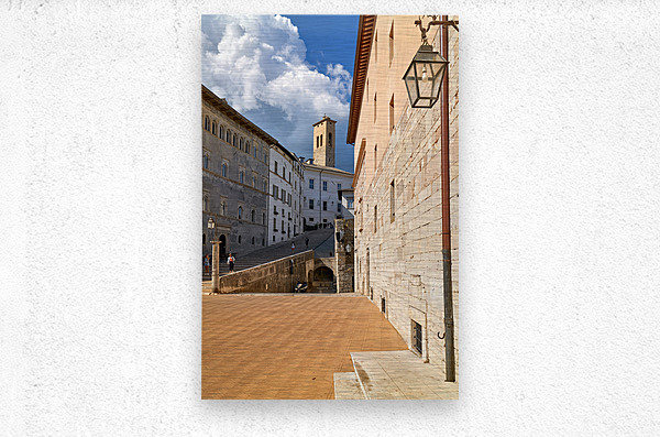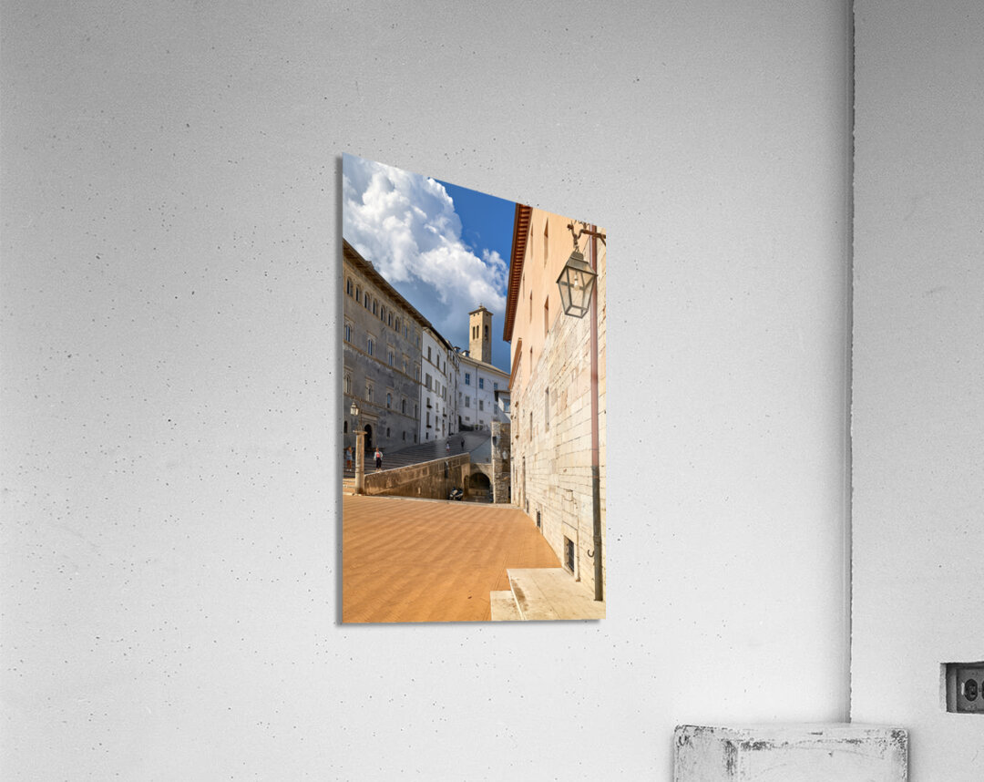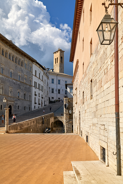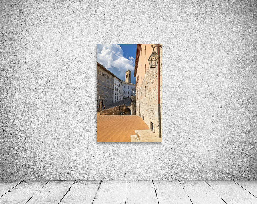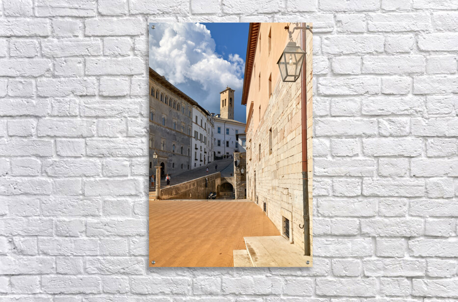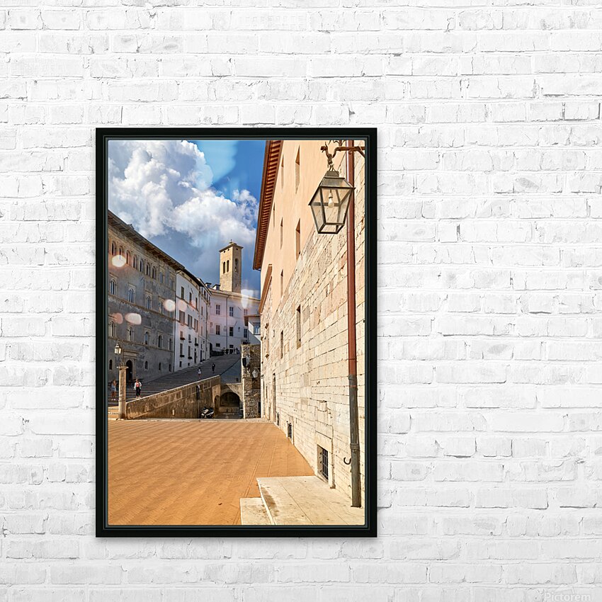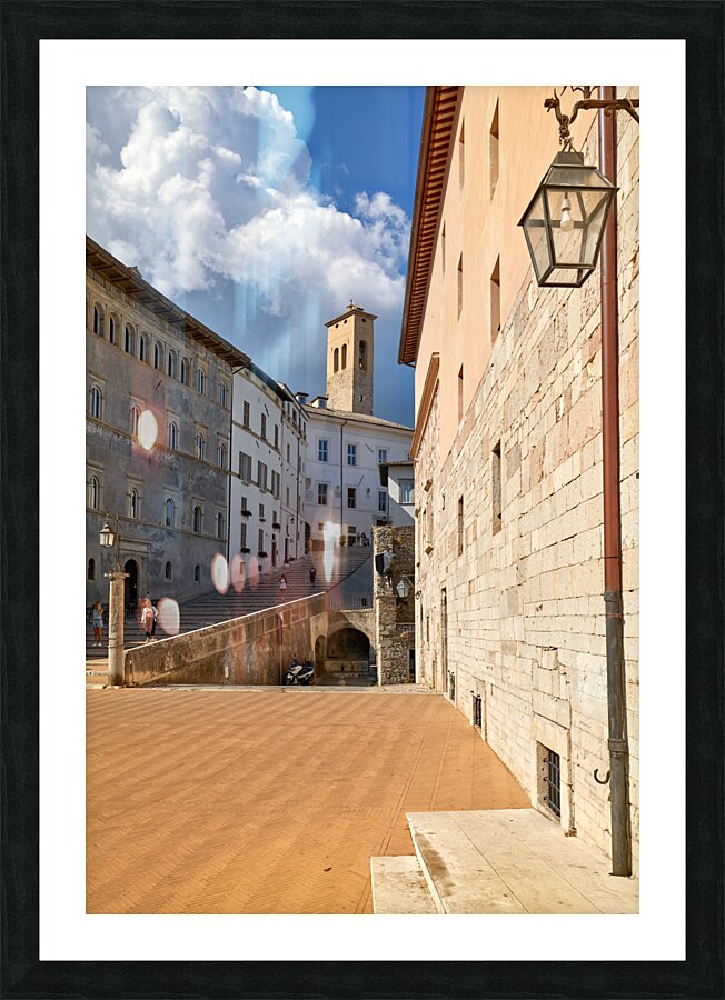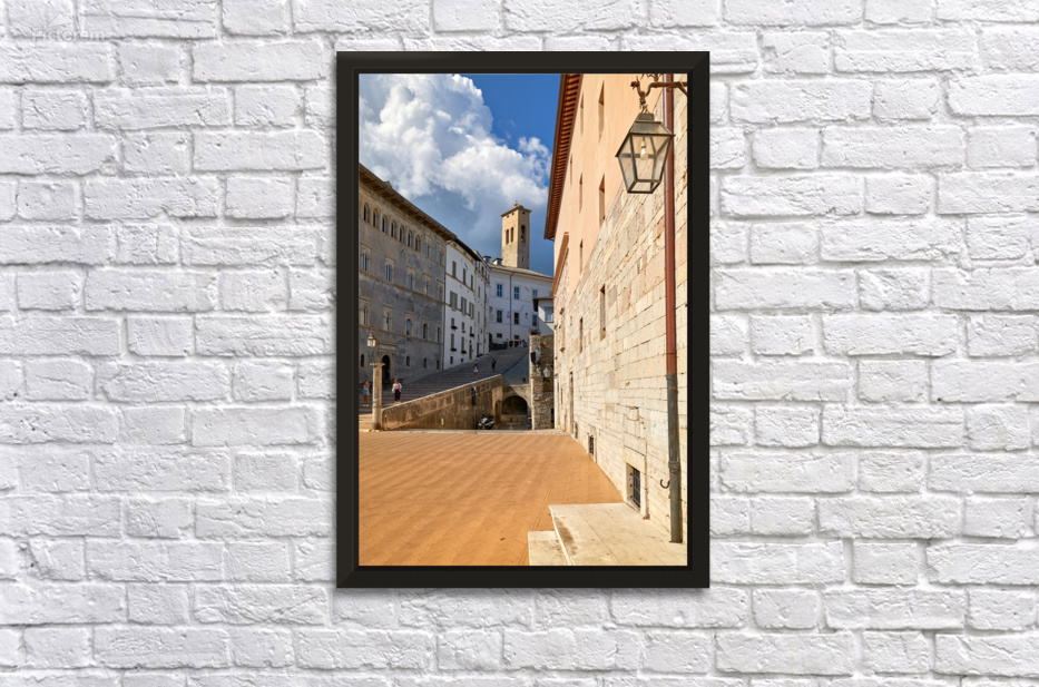 "Spoleto Umbria Italy. Piazza del Duomo the theatre and Chiesa di SantEufemia" in a framed print.