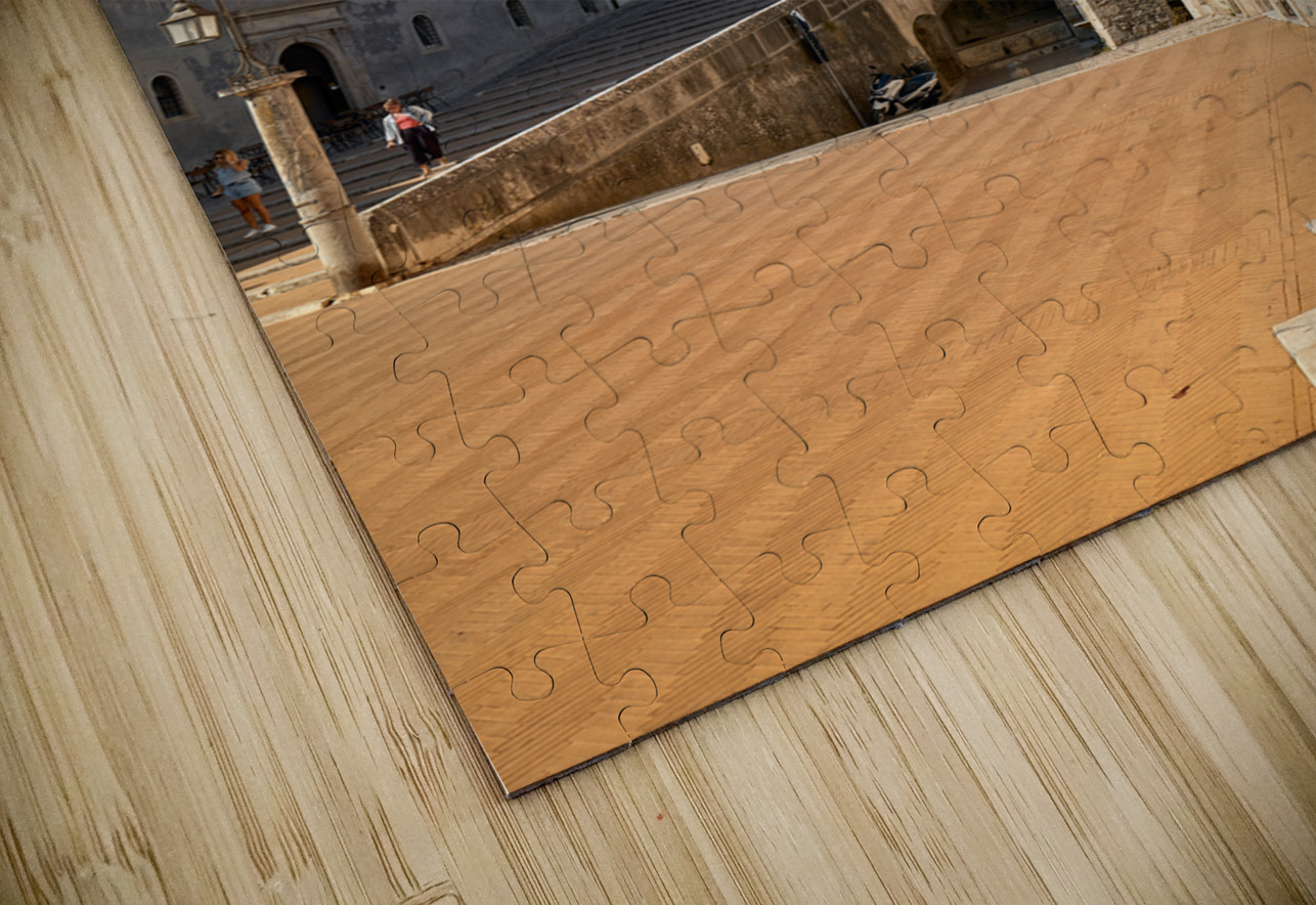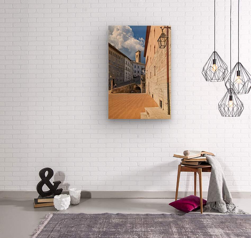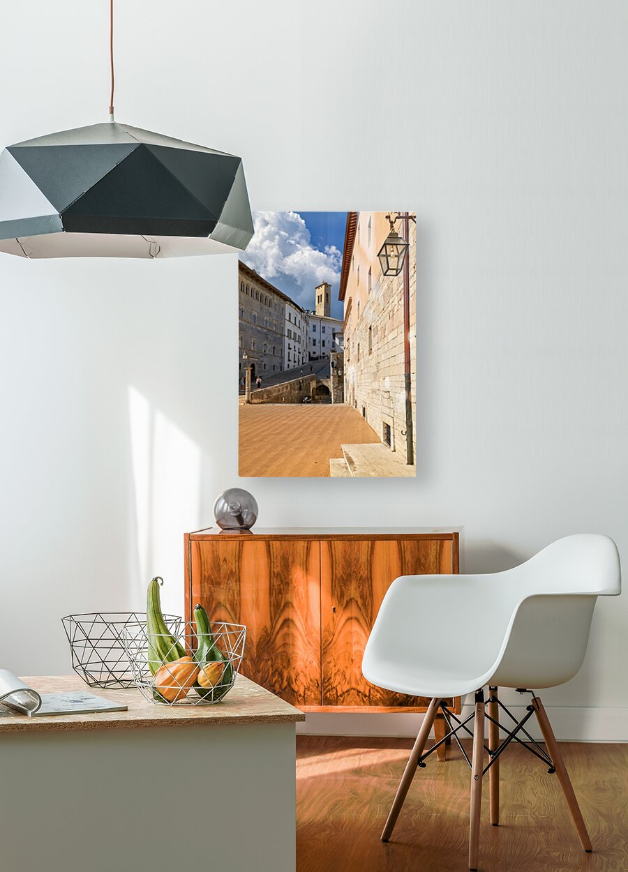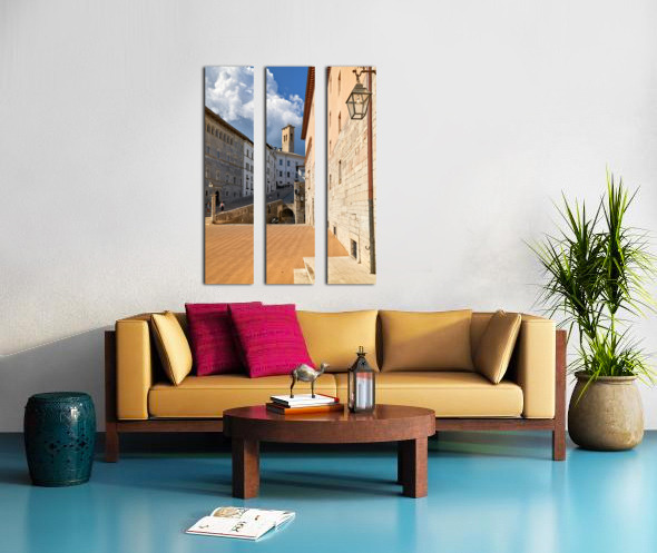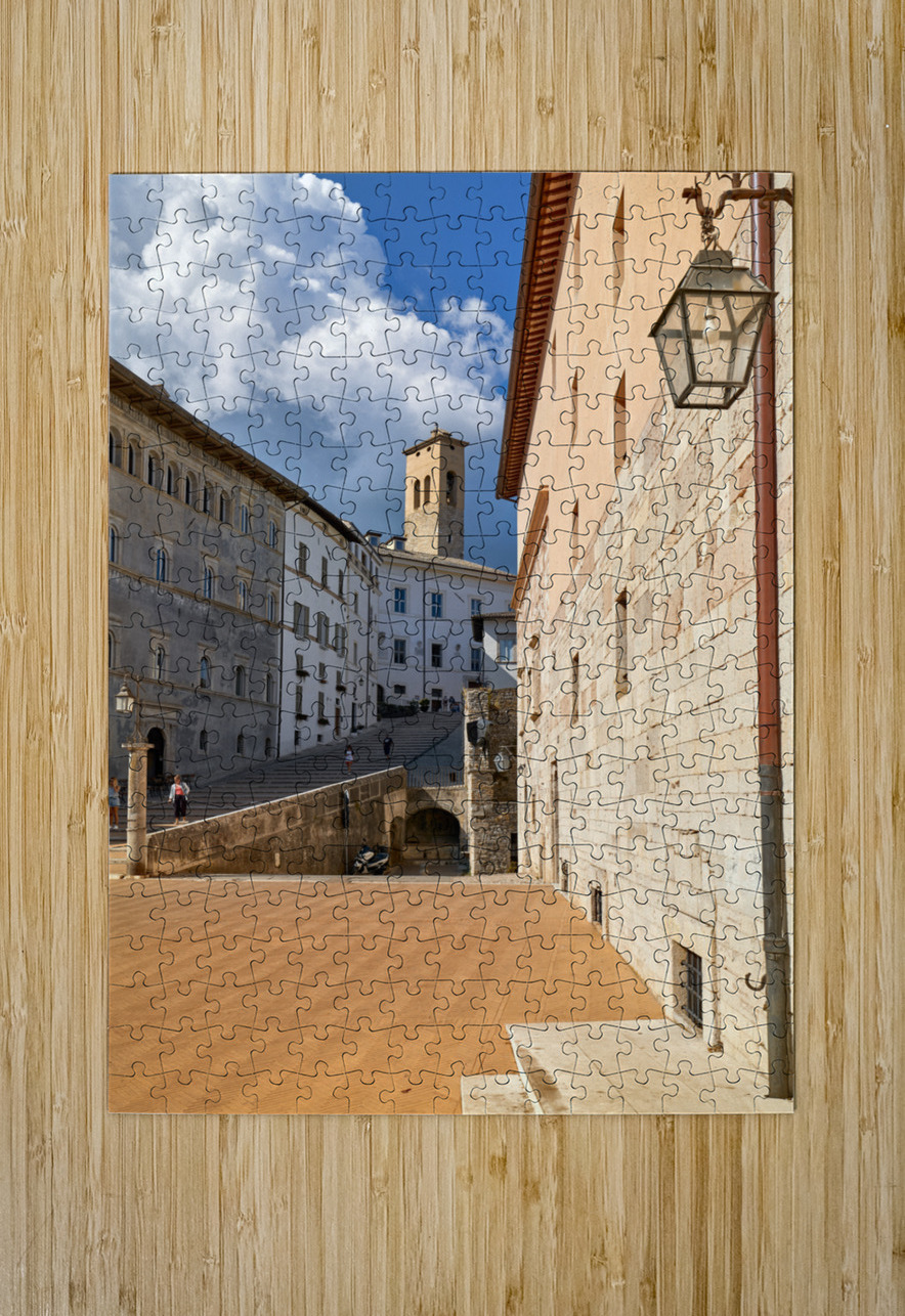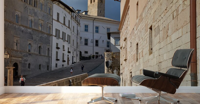 "Spoleto Umbria Italy. Piazza del Duomo the theatre and Chiesa di SantEufemia" in a framed print.