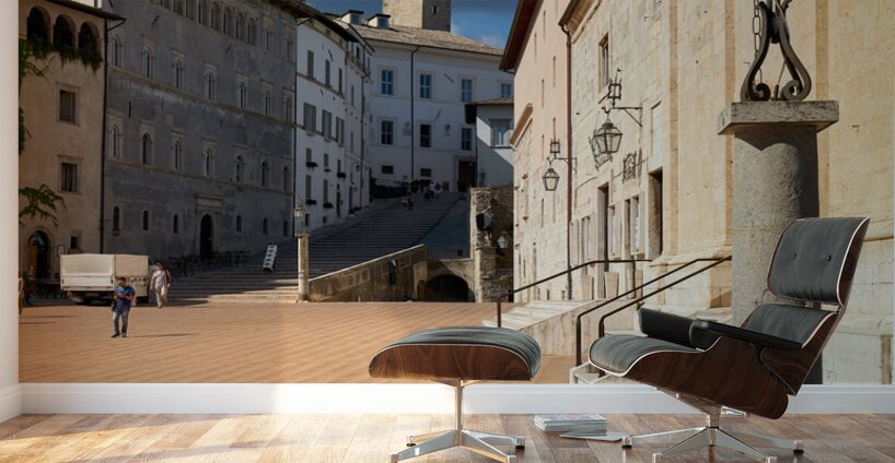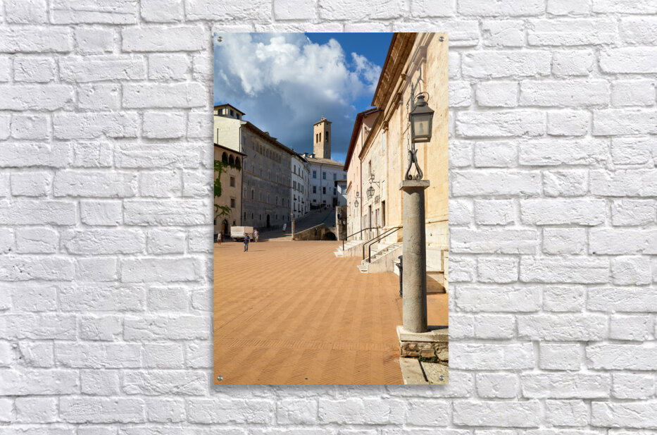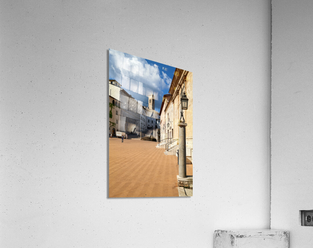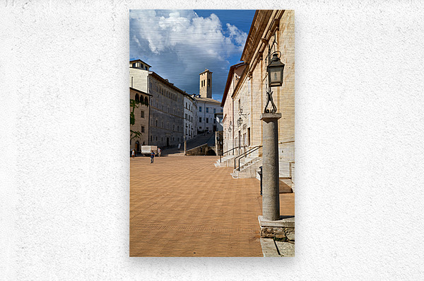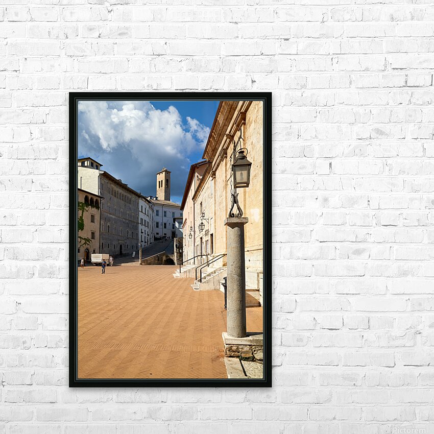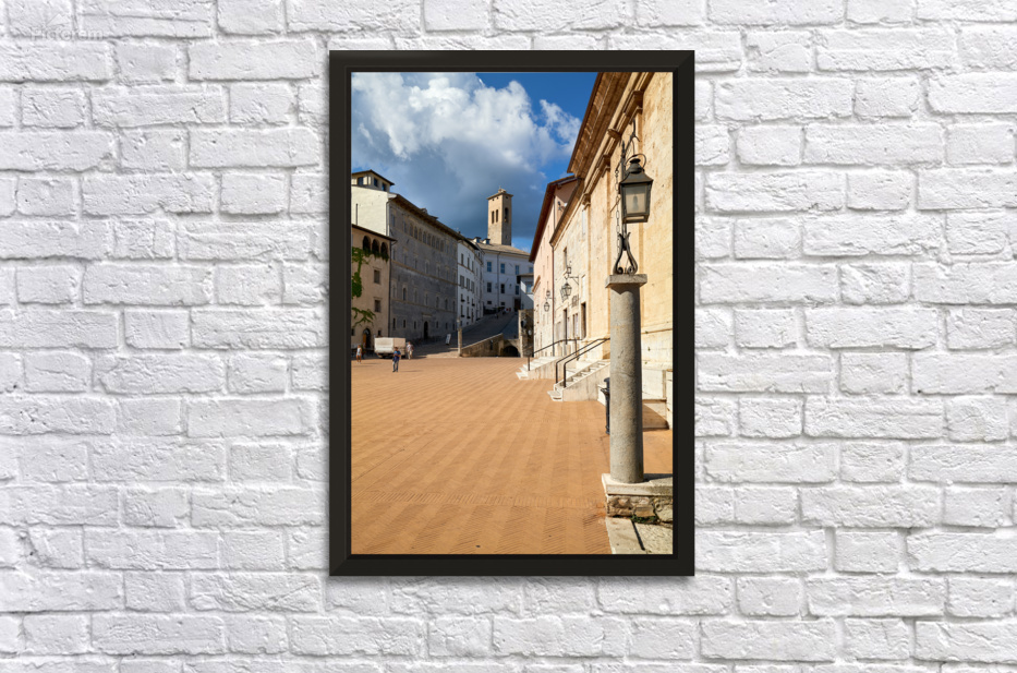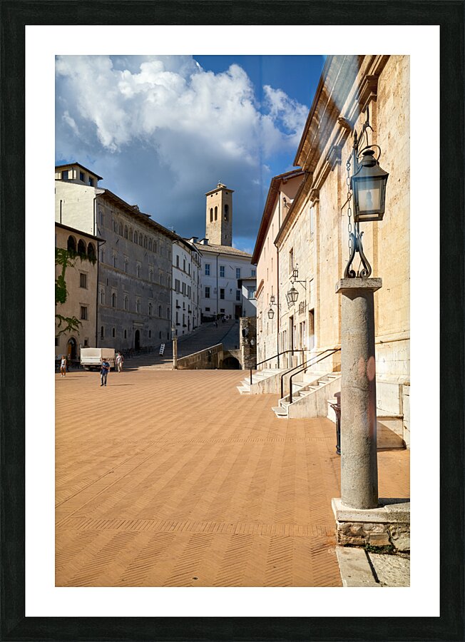"Spoleto Umbria Italy. Piazza del Duomo the theatre and Chiesa di SantEufemia" in a framed print.