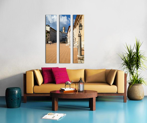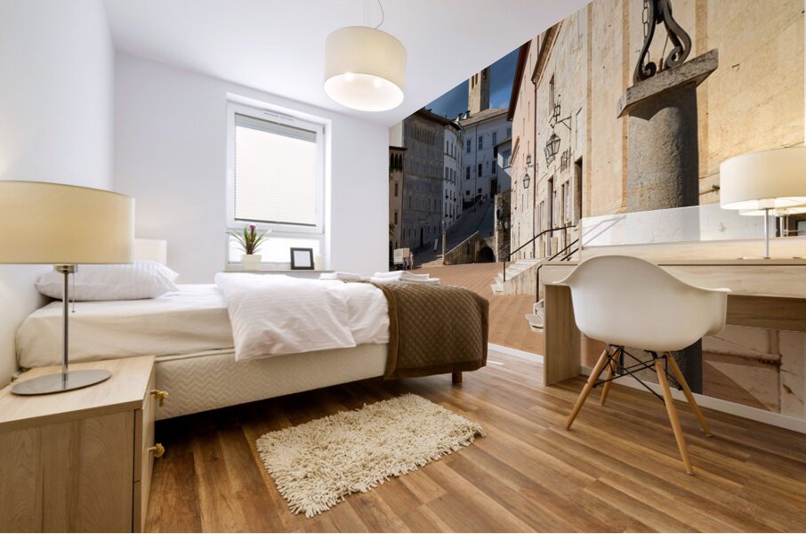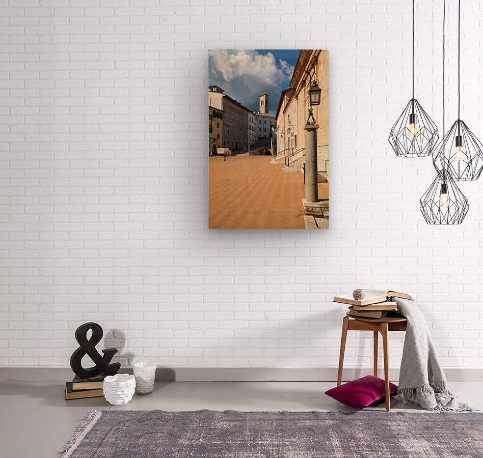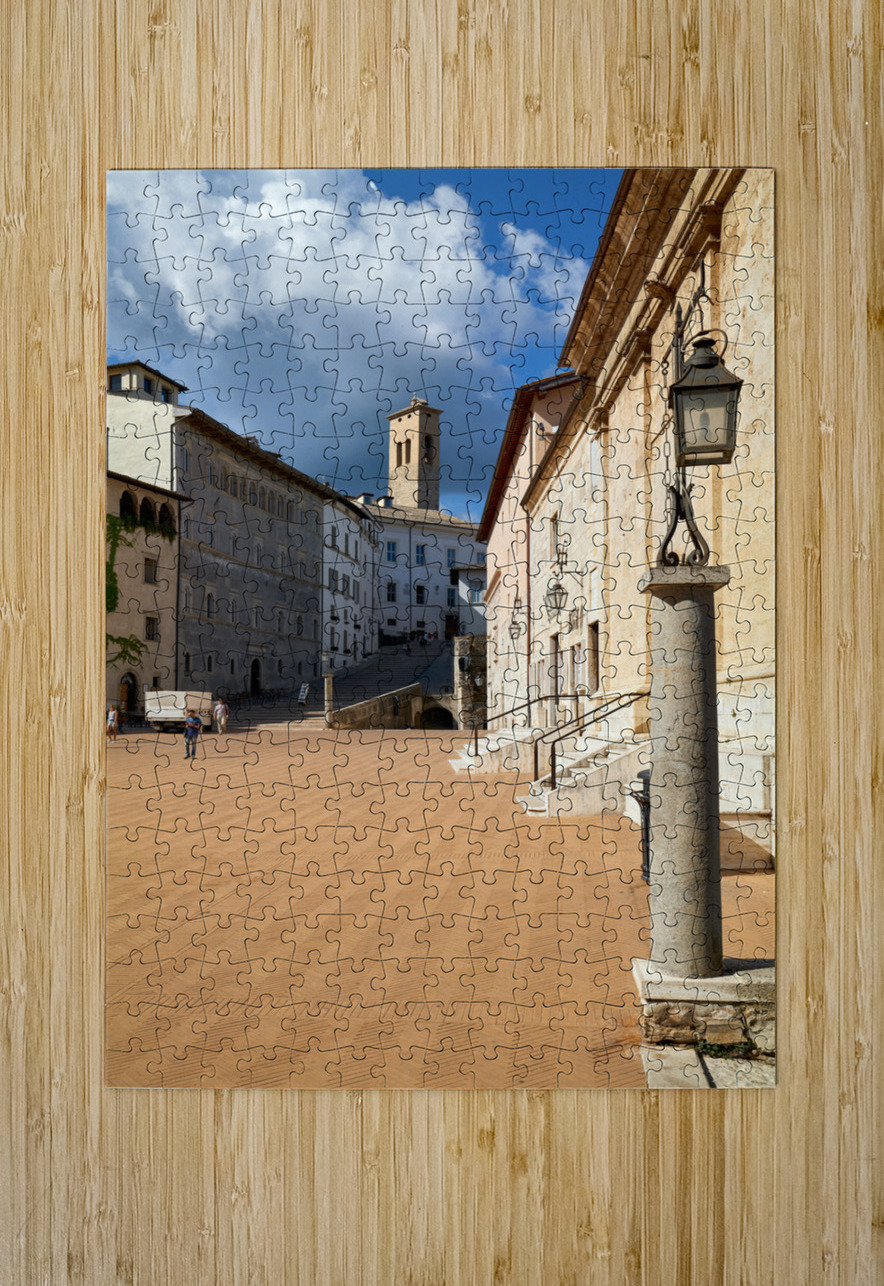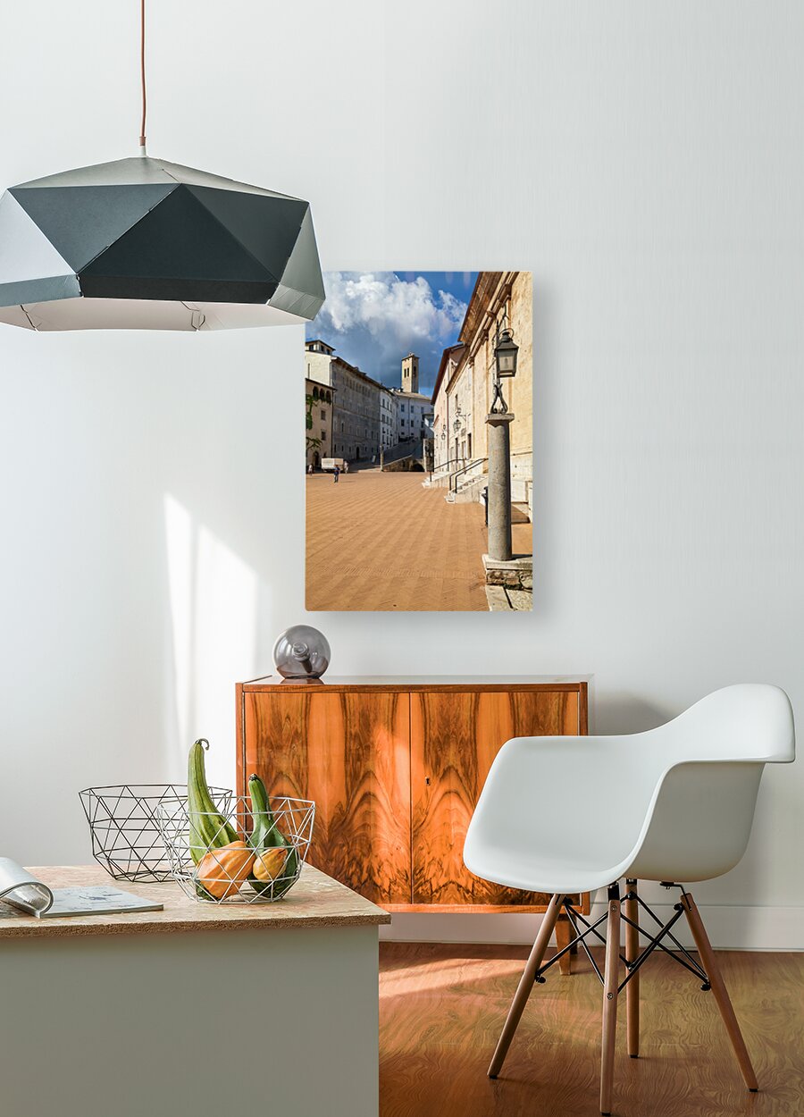 "Spoleto Umbria Italy. Piazza del Duomo the theatre and Chiesa di SantEufemia" in a framed print.