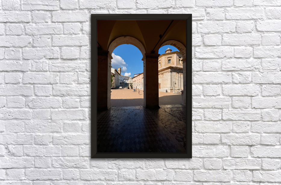 "Spoleto Umbria Italy. Piazza del Duomo the theatre and Chiesa di SantEufemia" in a framed print.
