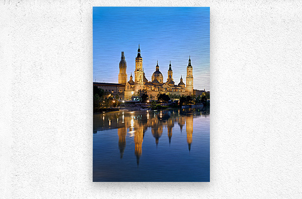 ABOUT THIS ARTWORK: ZARAGOZA. SARAGOSSA. ARAGON. SPAIN. CATHEDRAL BASILICA OF OUR LADY OF THE PILLAR AND RIVER EBRO AT SUNSET