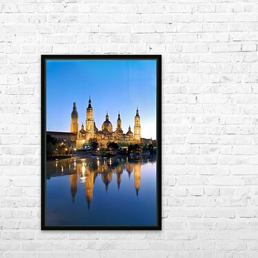 Zaragoza. Saragossa. Aragon. Spain. Cathedral Basilica of Our Lady of the Pillar and river Ebro at sunset Frame print