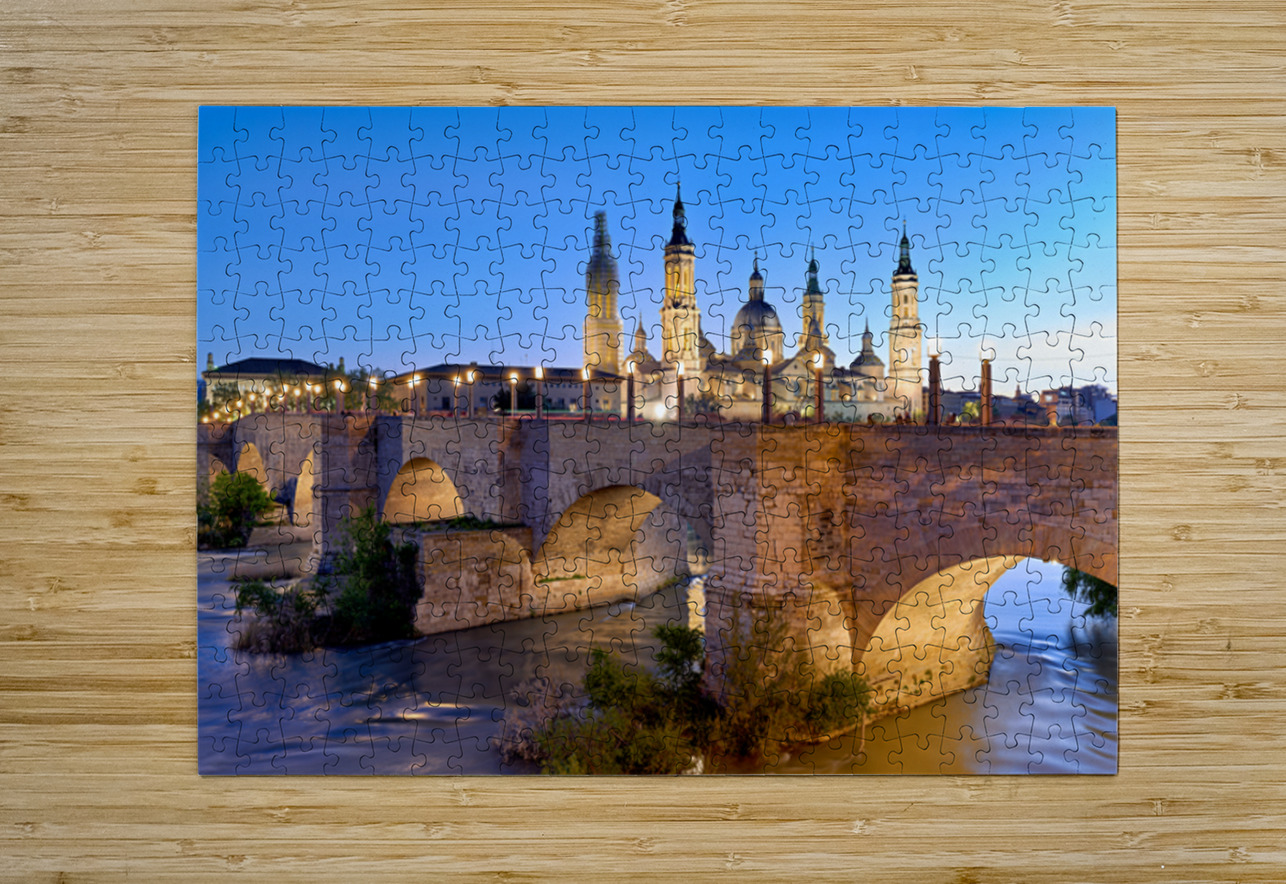 Zaragoza. Saragossa. Aragon. Spain. Cathedral Basilica of Our Lady of the Pillar and river Ebro at sunset Marco Brivio Puzzle printing