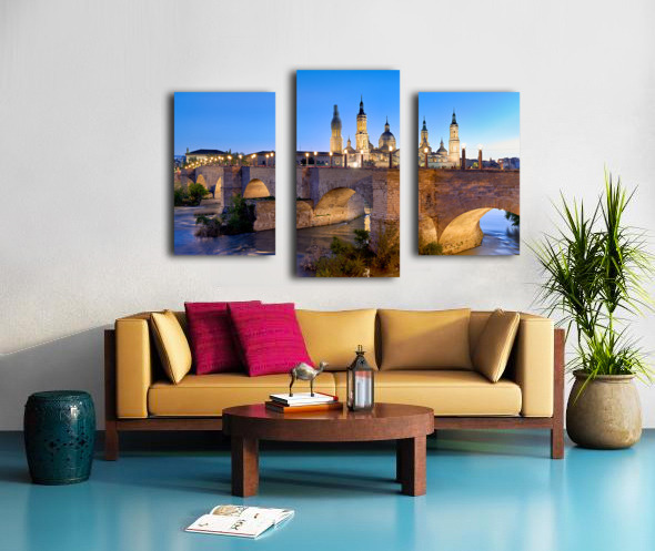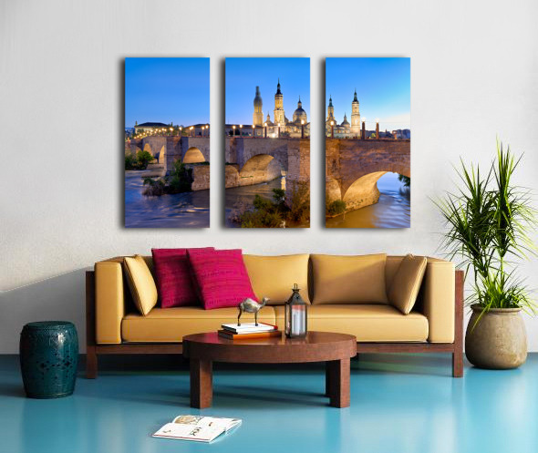 Zaragoza. Saragossa. Aragon. Spain. Cathedral Basilica of Our Lady of the Pillar and river Ebro at sunset Canvas print