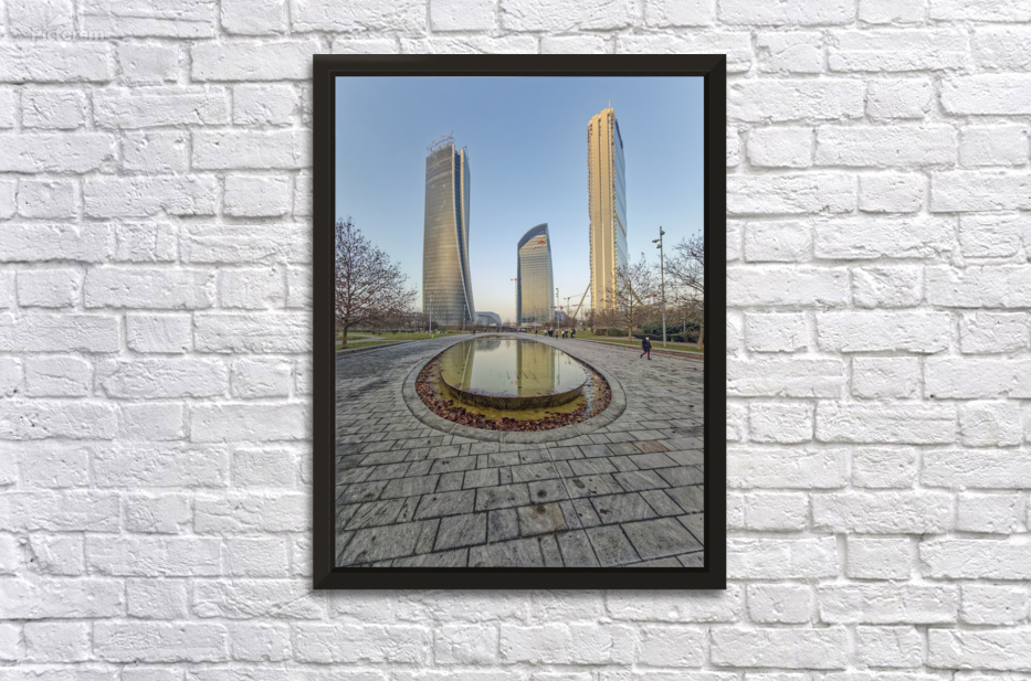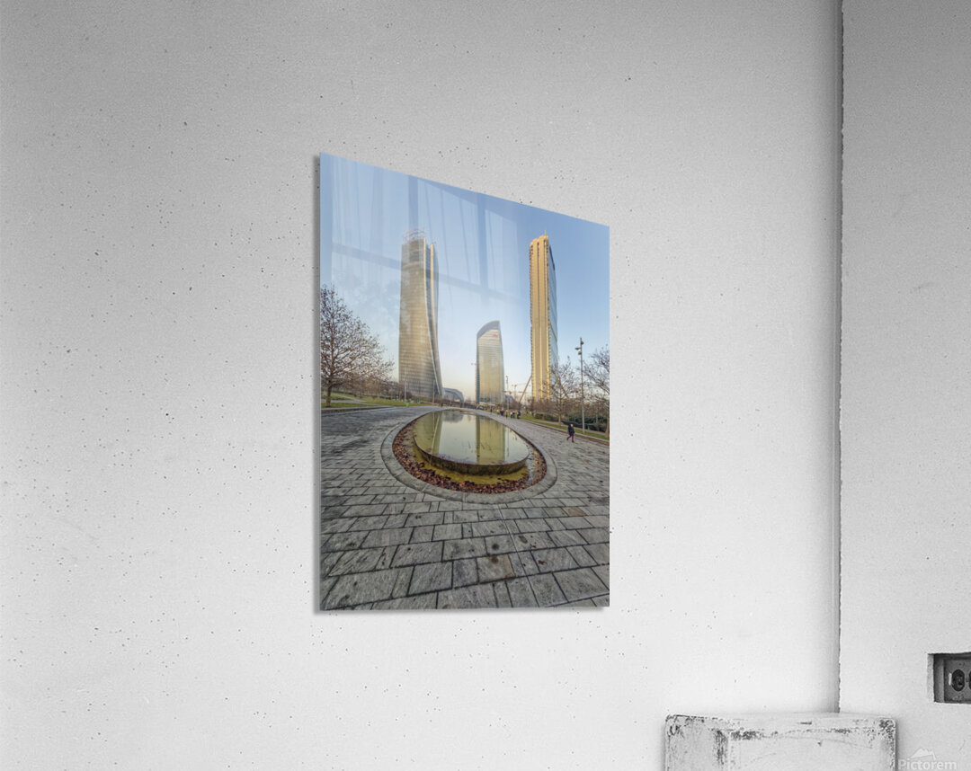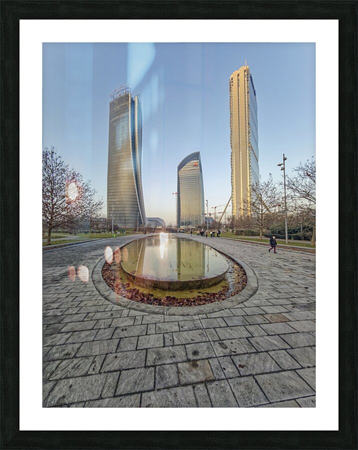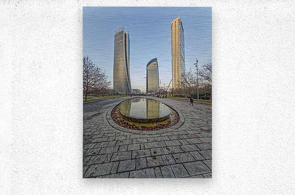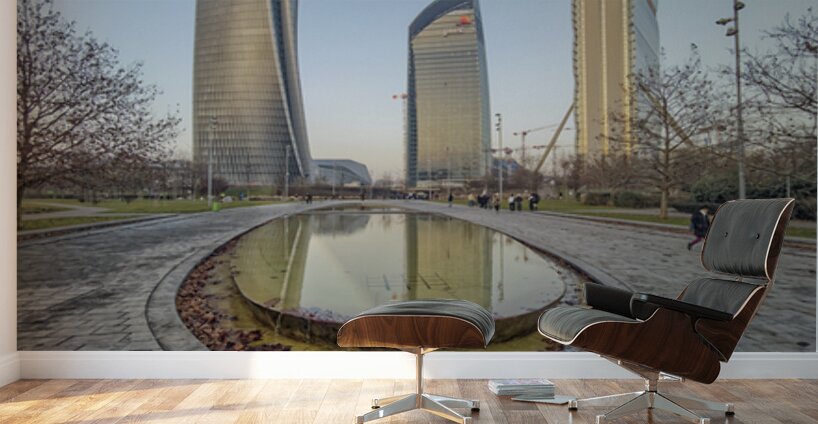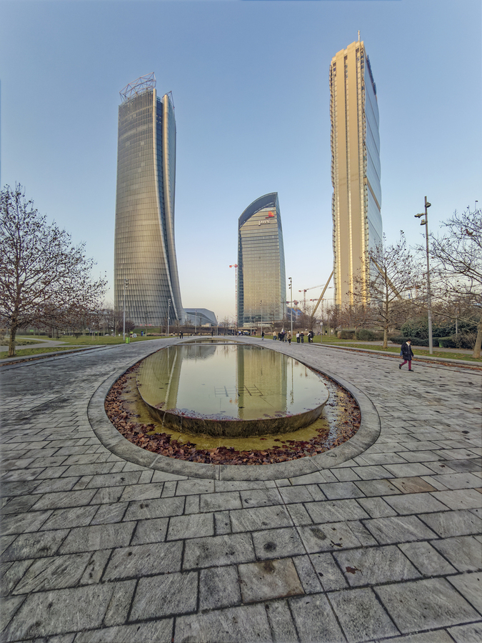 Milan Italy. Citylife district. Three contemporary glass towers rise above a serene park with a shallow oval-shaped fountain reflecting the sky and bu