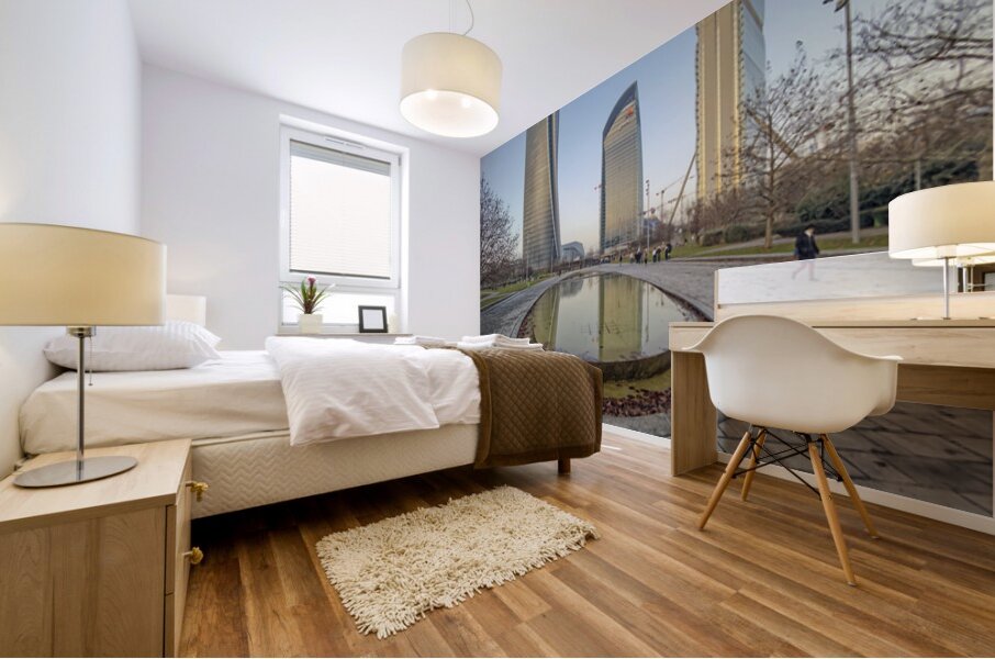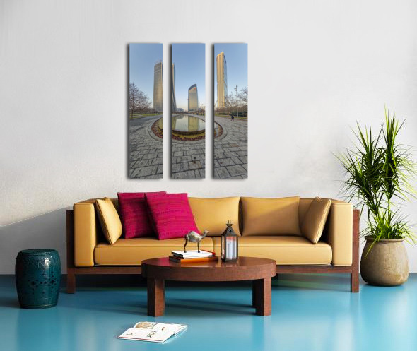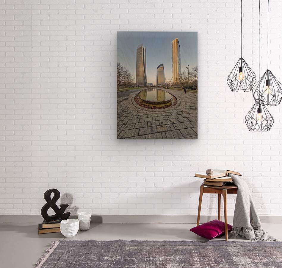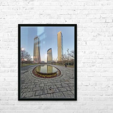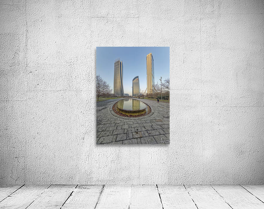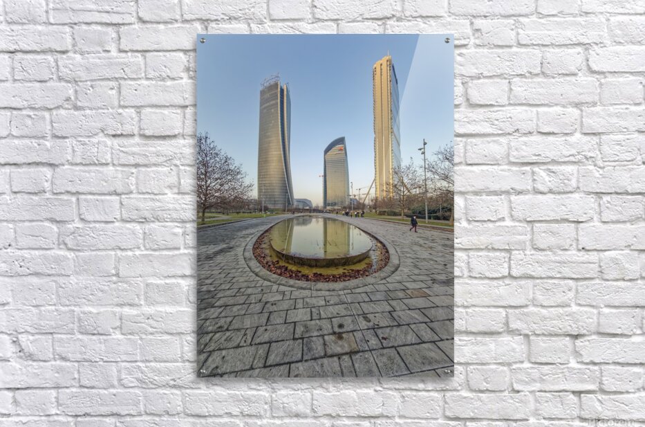 Milan Italy. Citylife district. Three contemporary glass towers rise above a serene park with a shallow oval-shaped fountain reflecting the sky and bu