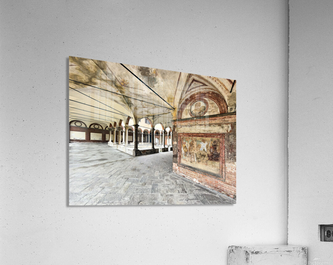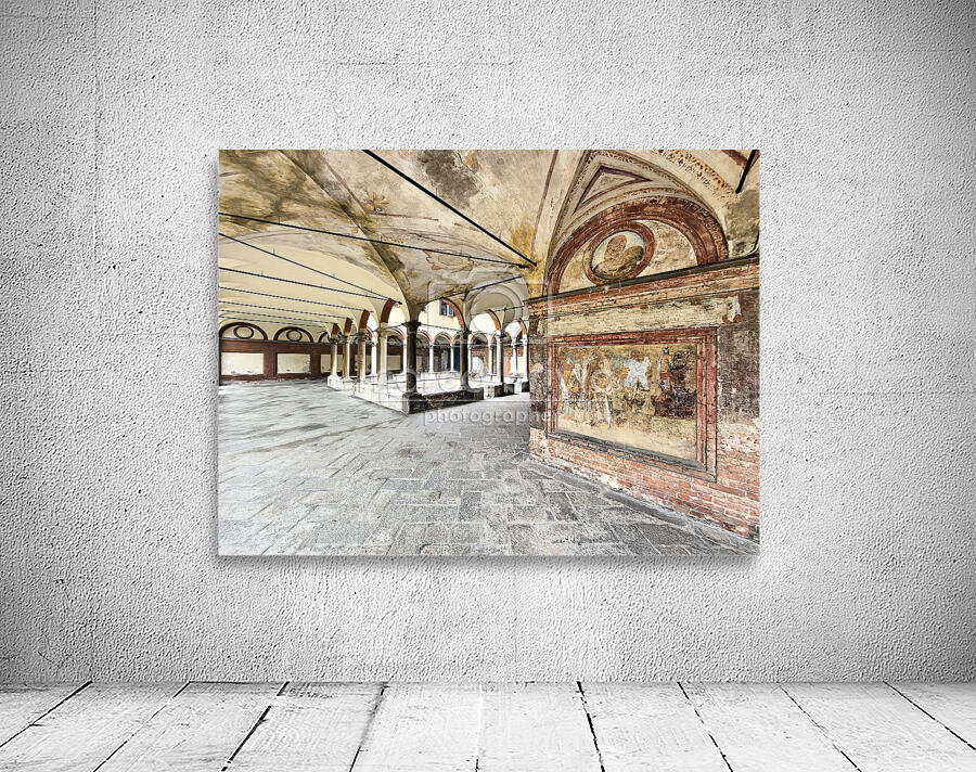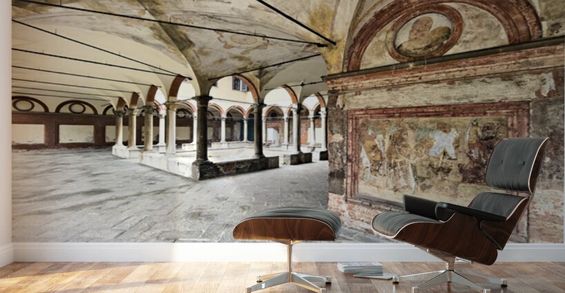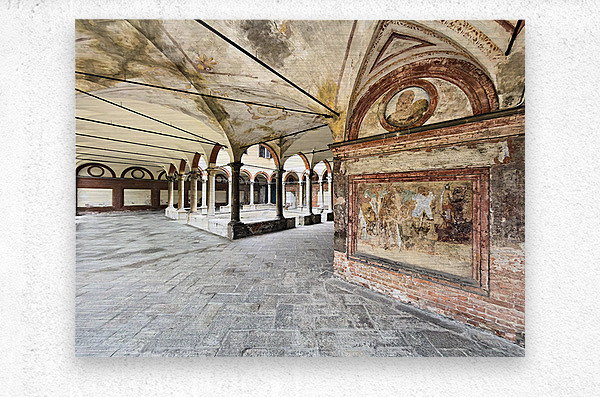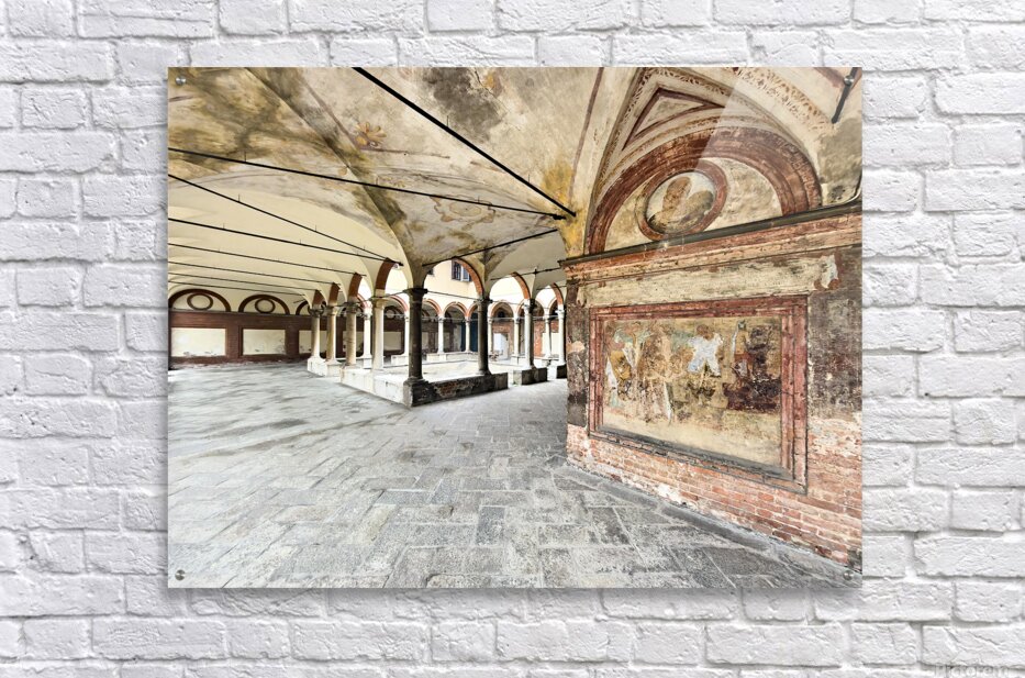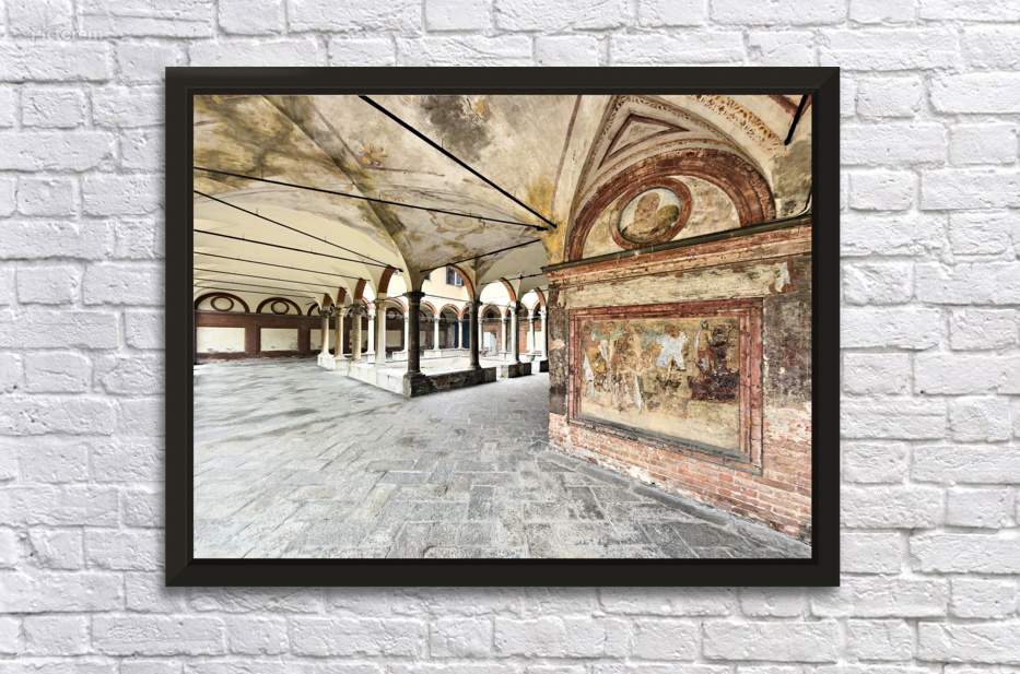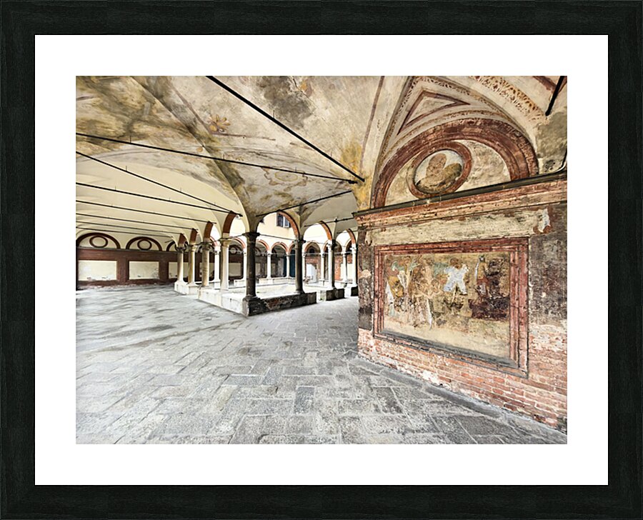 The historic cloister of Santa Maria alla Fontana church in Milan Italy features a colonnade with stone pillars and brick arches surrounding a courtya