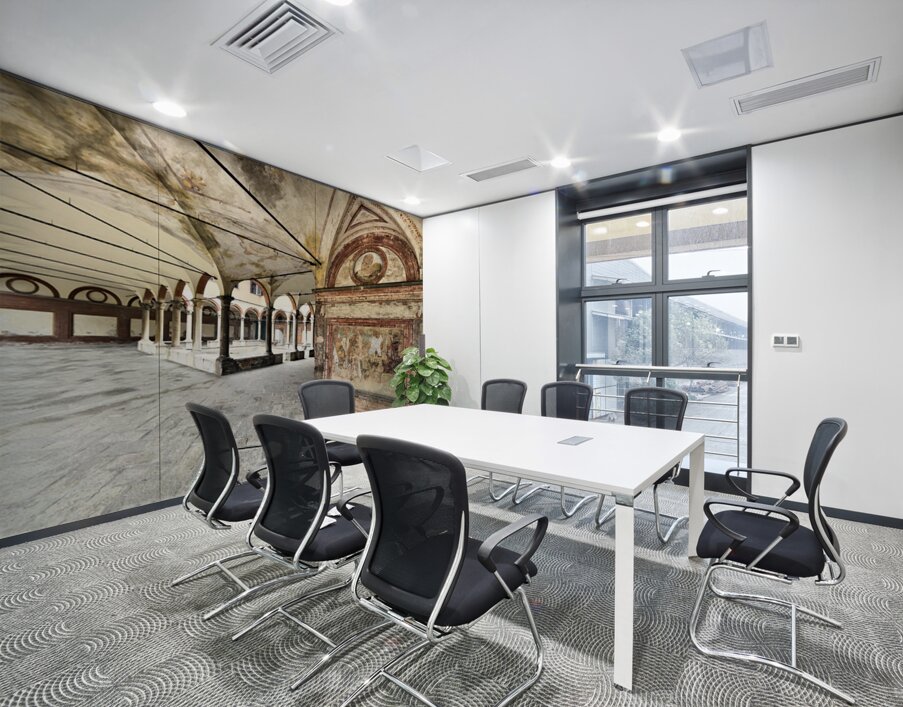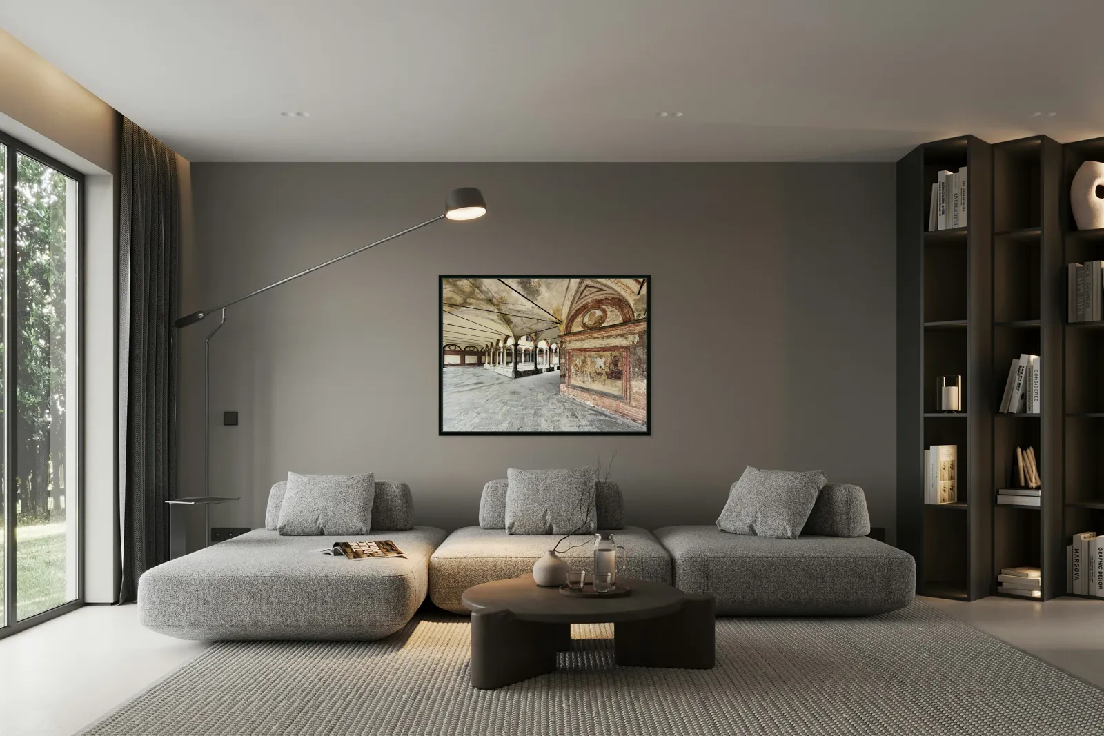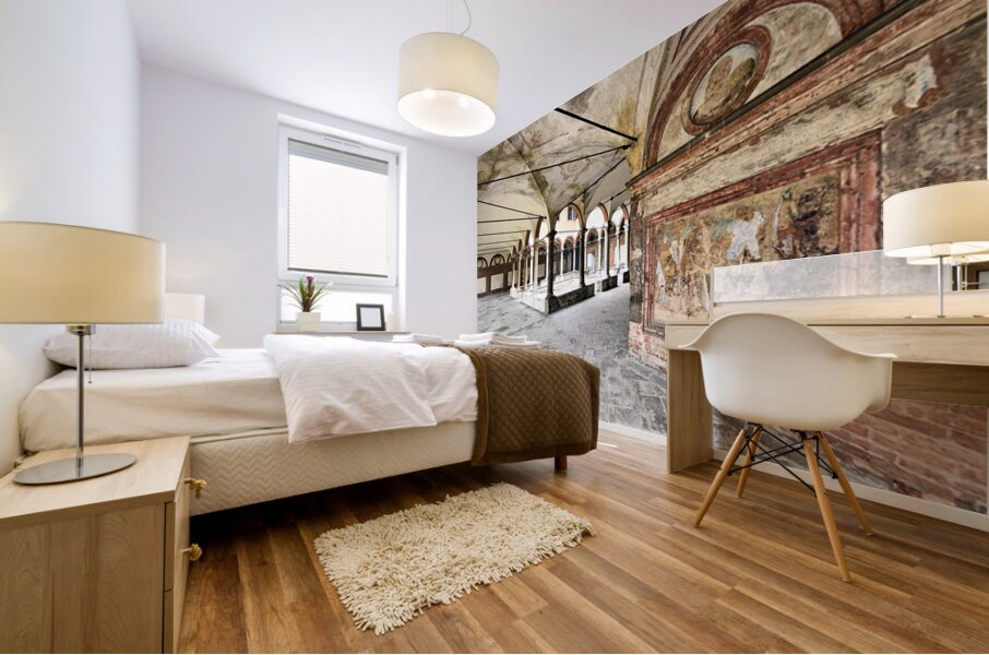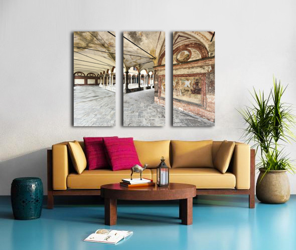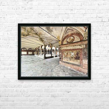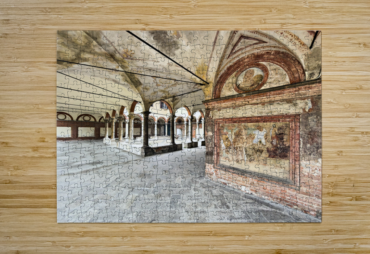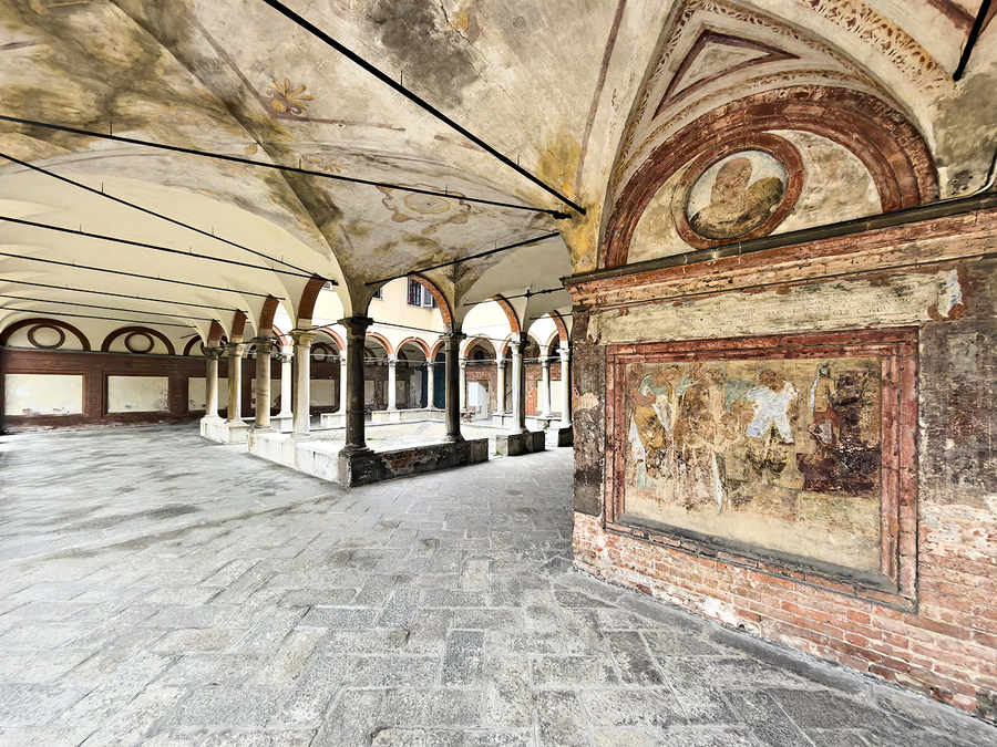 The historic cloister of Santa Maria alla Fontana church in Milan Italy features a colonnade with stone pillars and brick arches surrounding a courtya