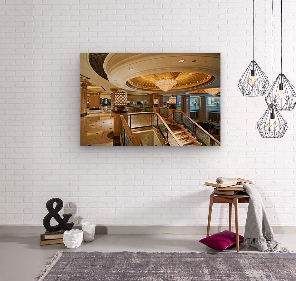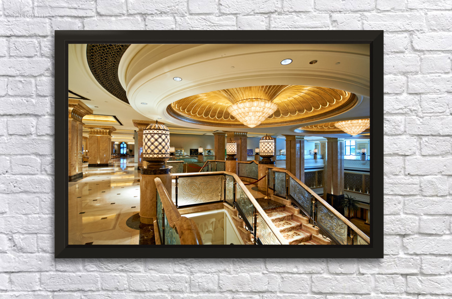"Opulent hotel lobby with grand staircase and golden chandeliers." in a framed print.