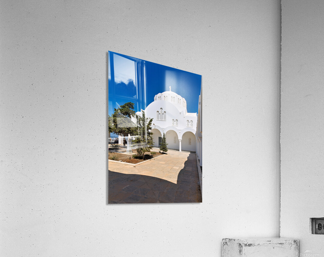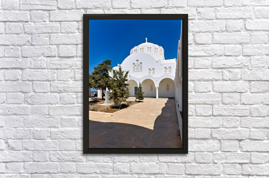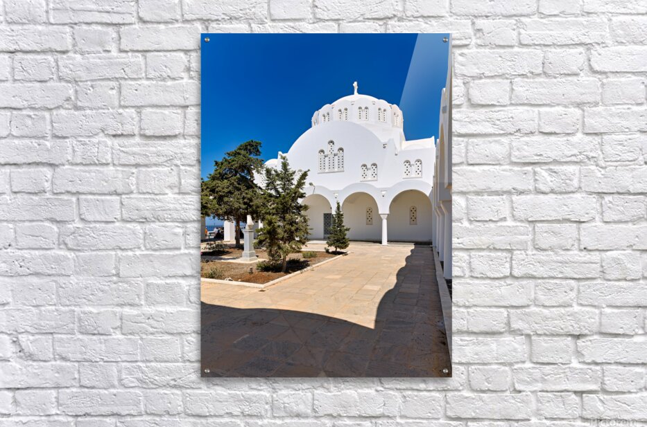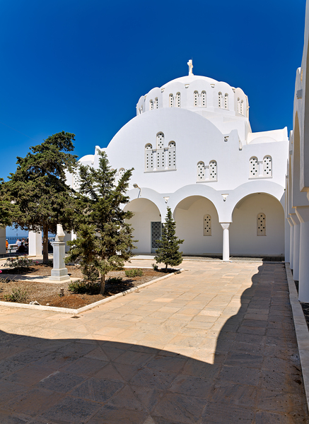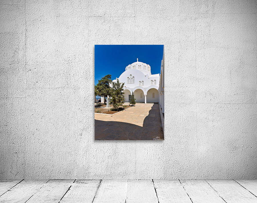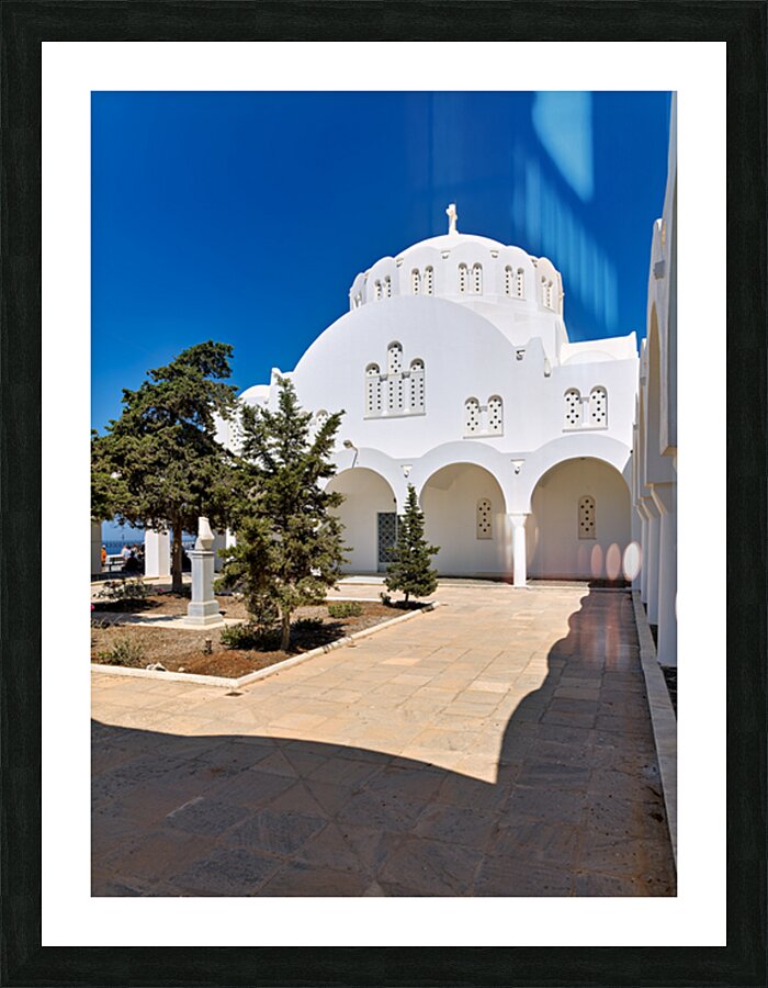 The Metropolitan Cathedral of Ypapanti Fira Santorini Greece a striking white church with a dome and cross welcomes visitors under a bright blue sky.