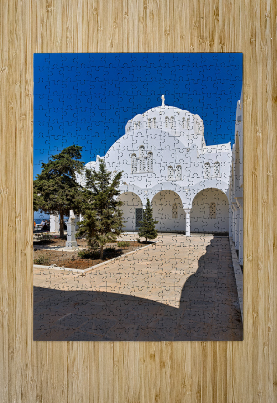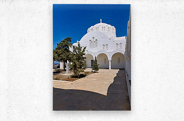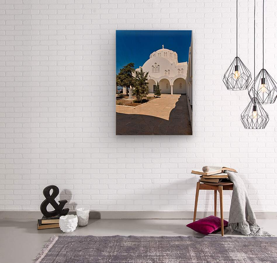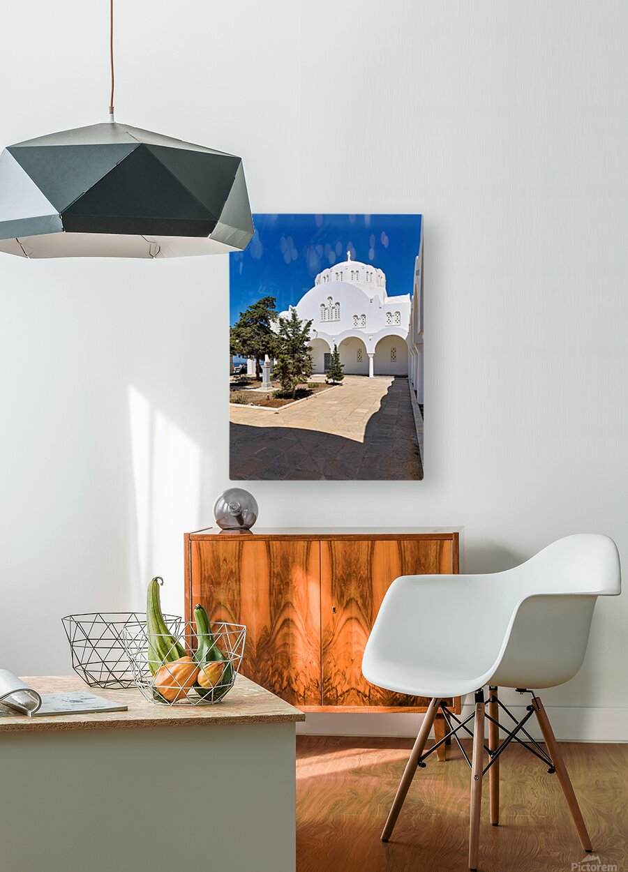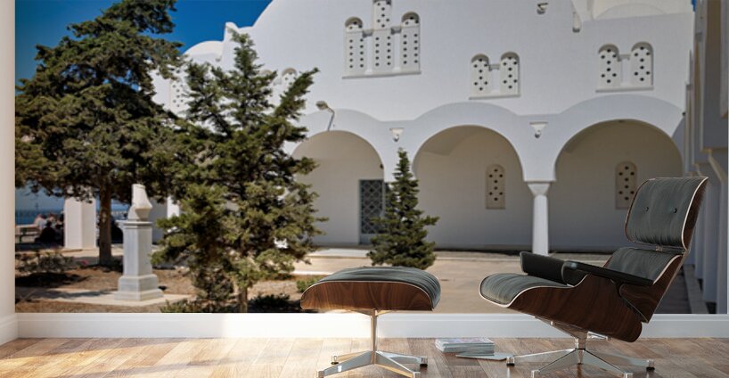 The Metropolitan Cathedral of Ypapanti Fira Santorini Greece a striking white church with a dome and cross welcomes visitors under a bright blue sky.