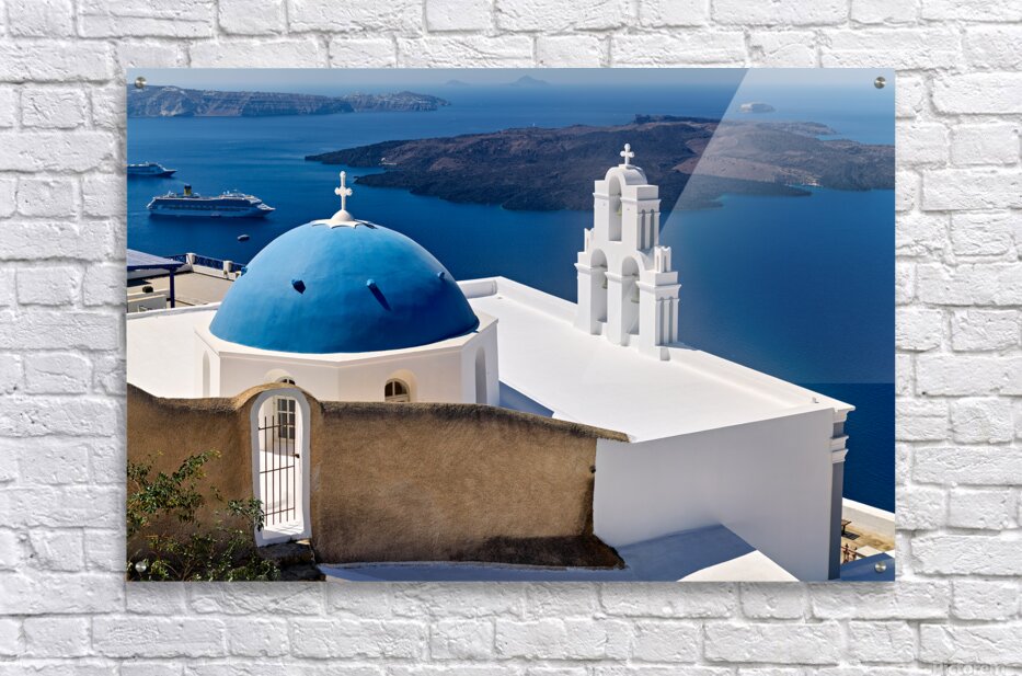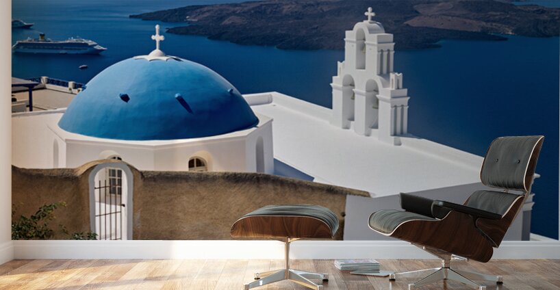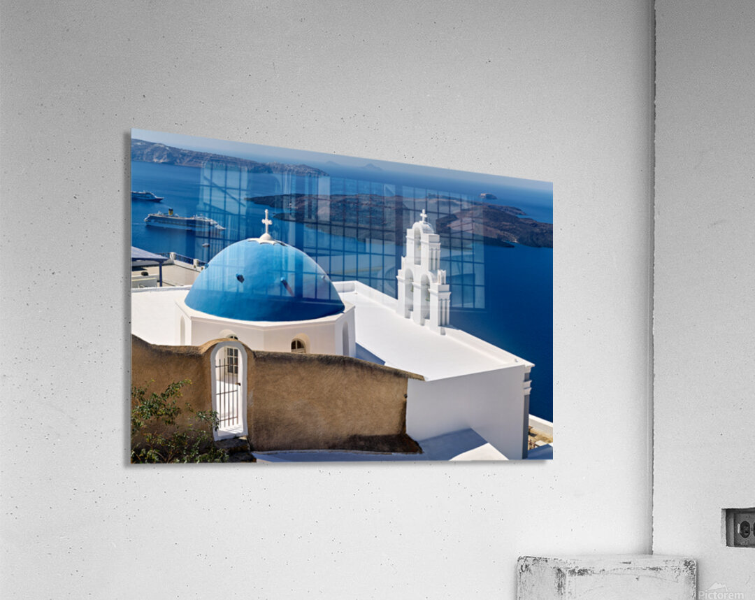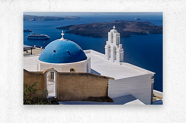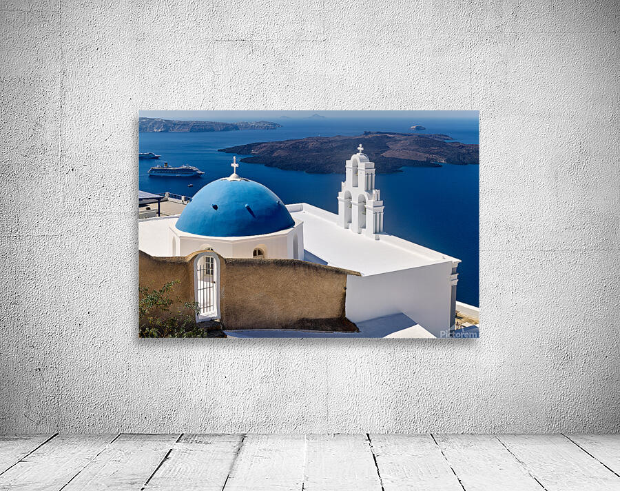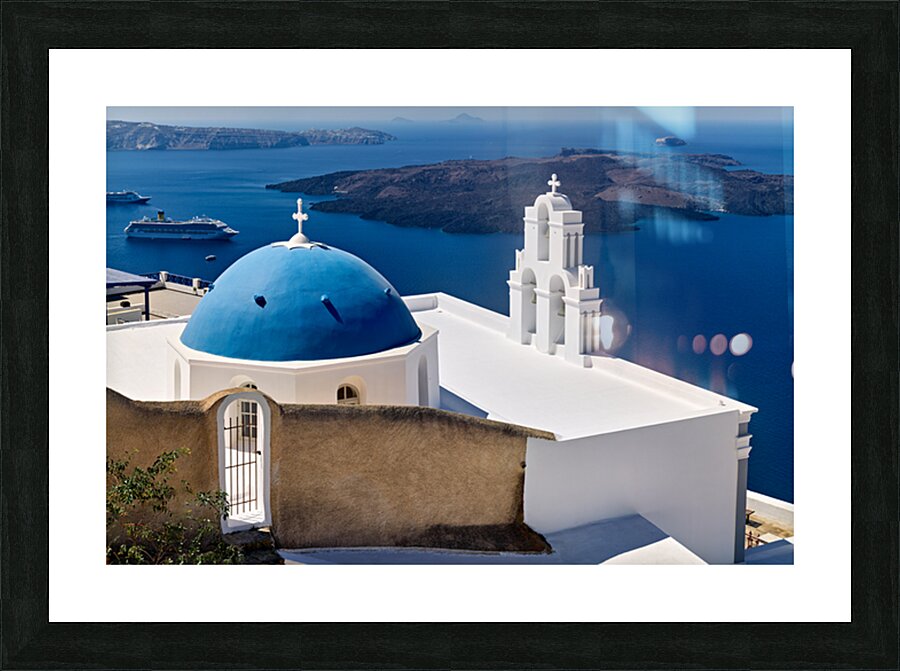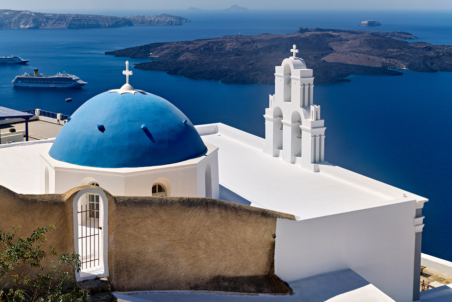 Iconic blue-domed church and white bell tower overlooking the caldera with cruise ships in Santorini Greece showcasing its stunning beauty.