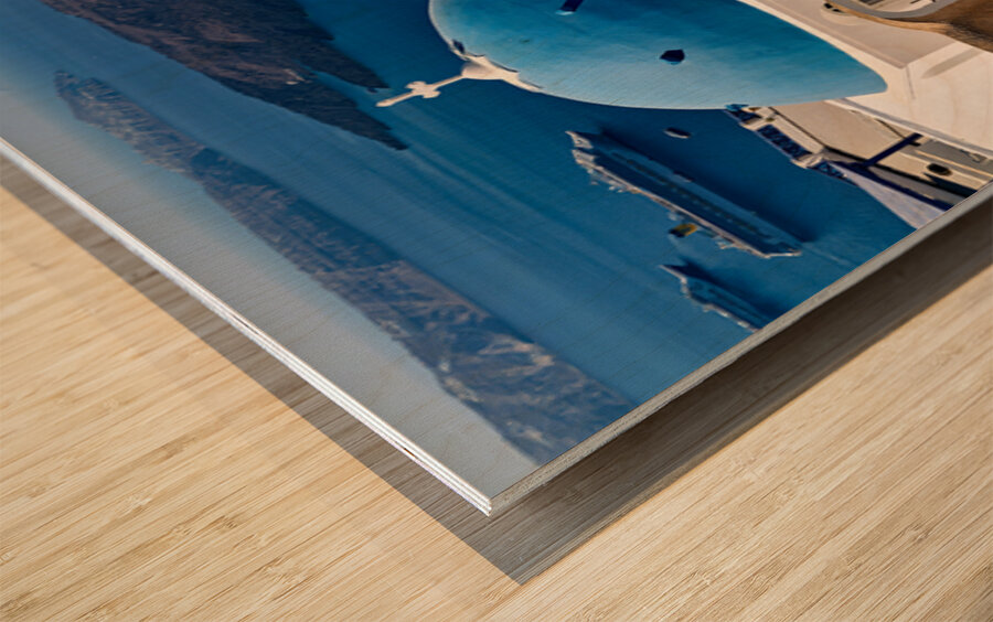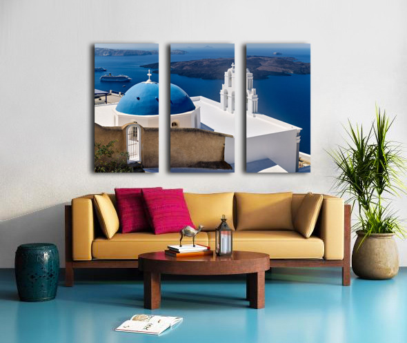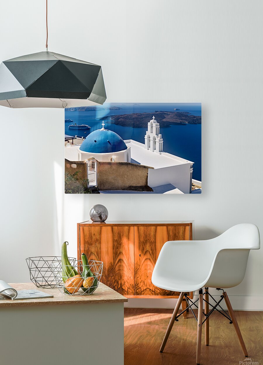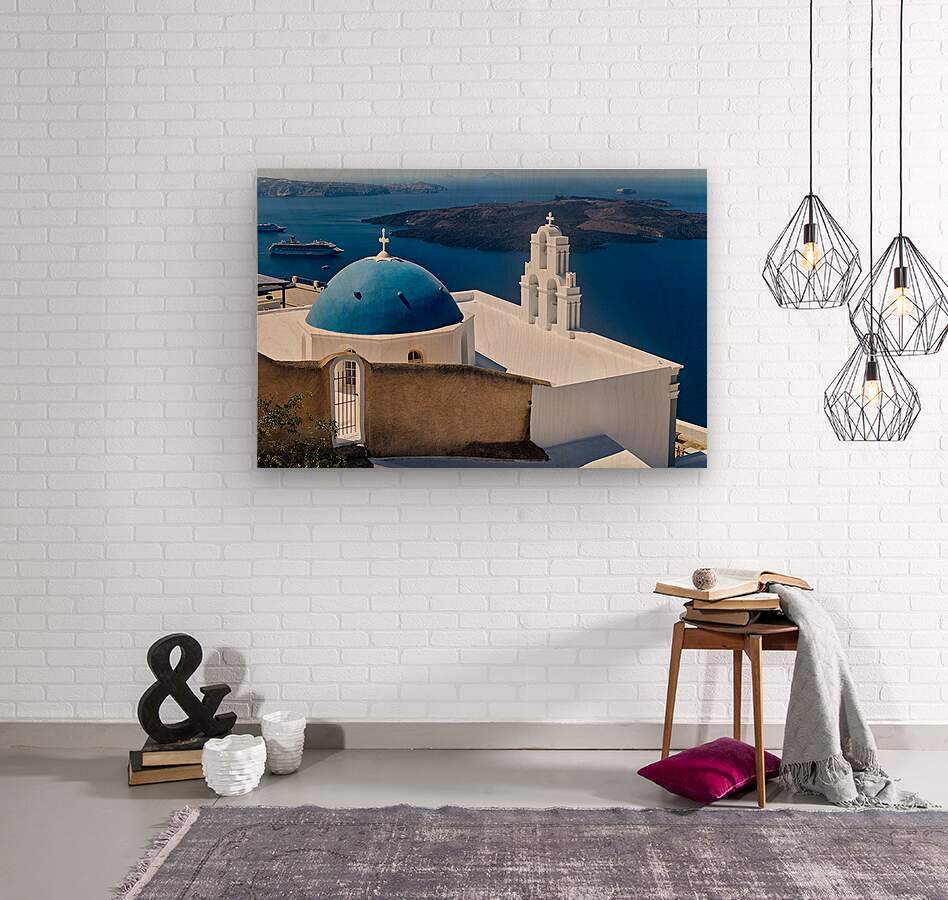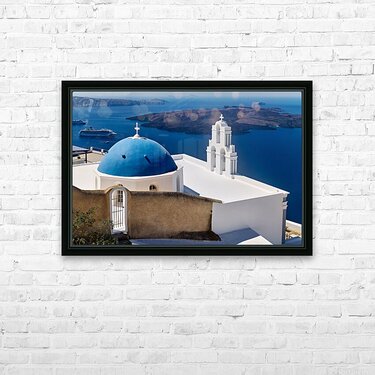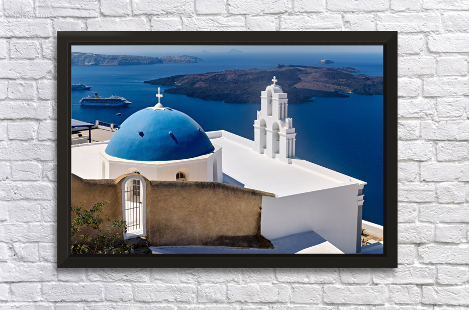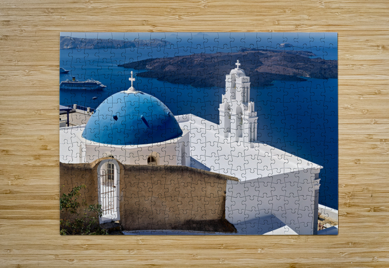 Iconic blue-domed church and white bell tower overlooking the caldera with cruise ships in Santorini Greece showcasing its stunning beauty.