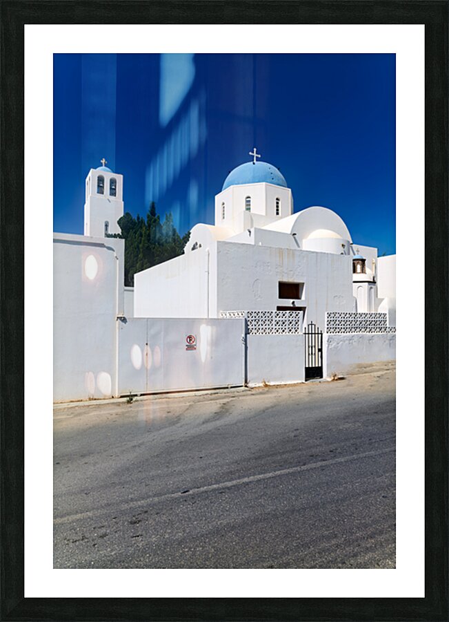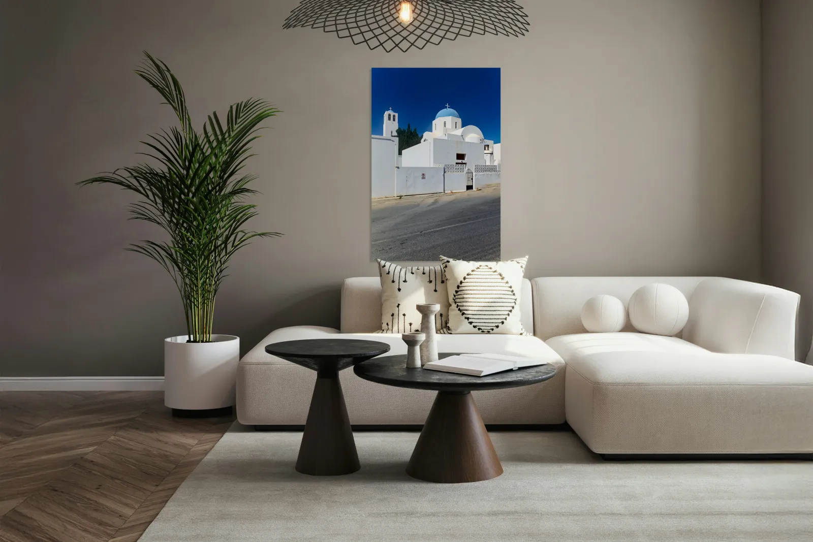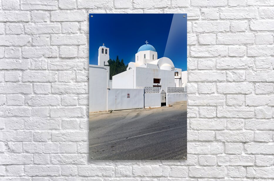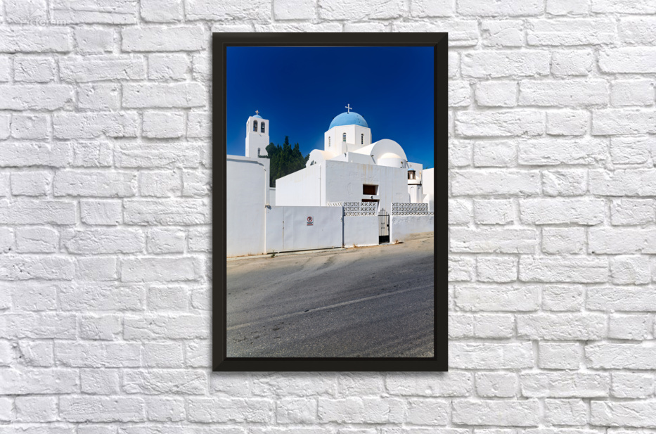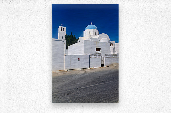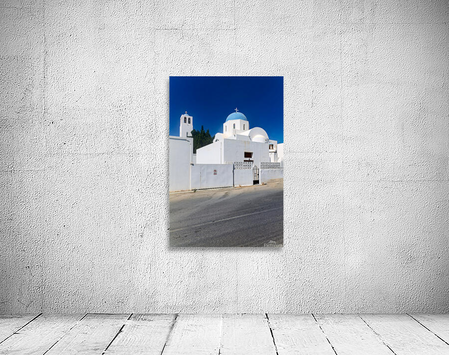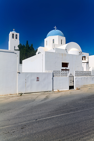 A traditional white Greek Orthodox church with a blue dome and bell tower under a clear sky characteristic of the stunning architecture on Greek islan