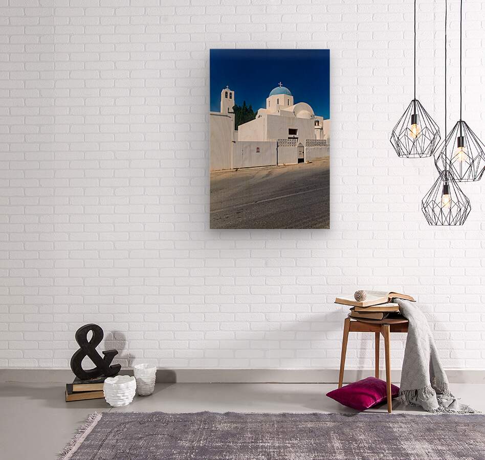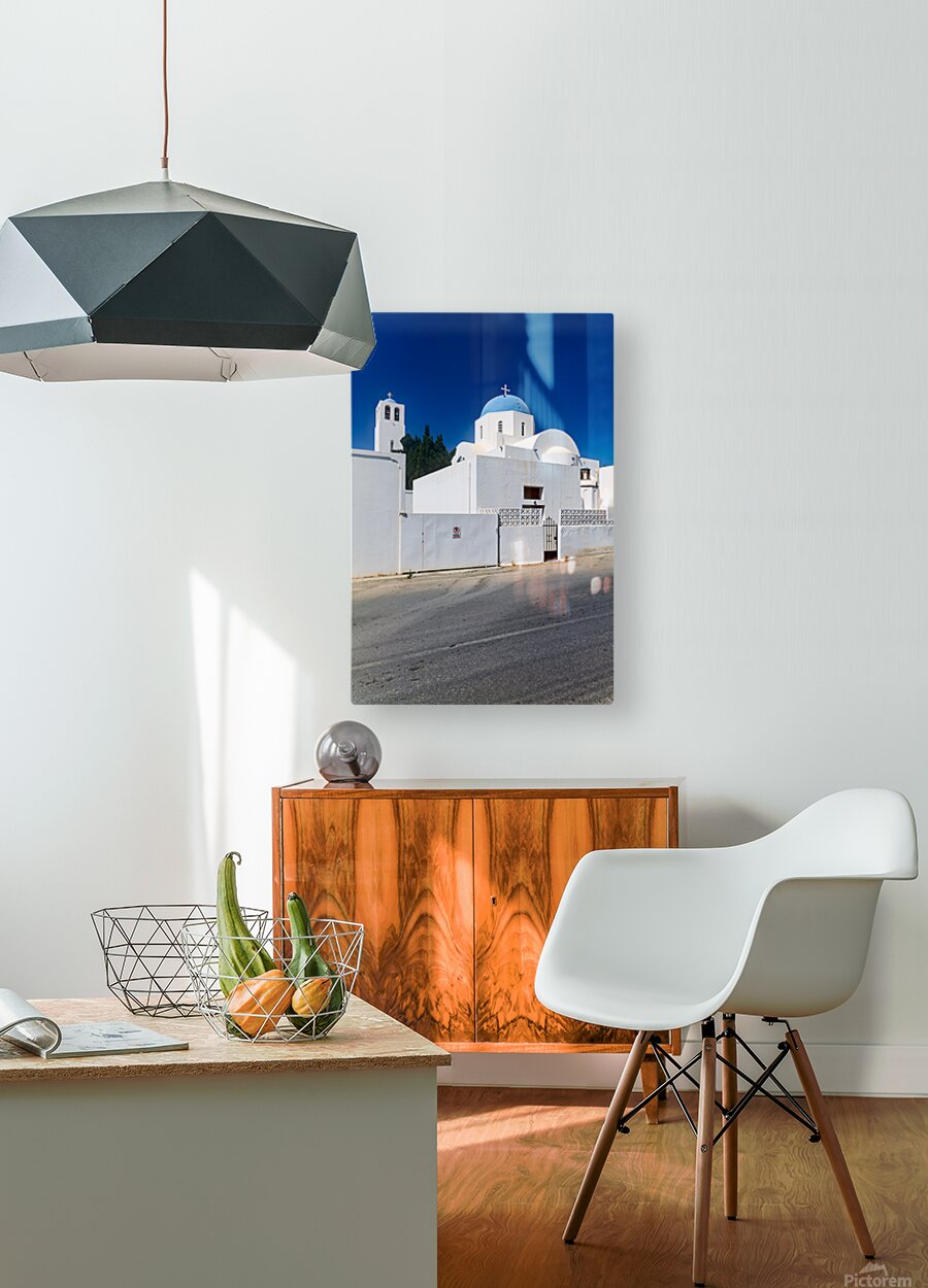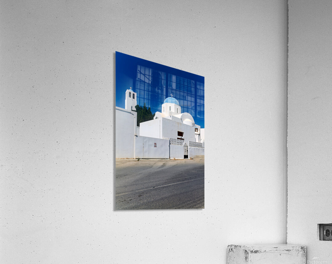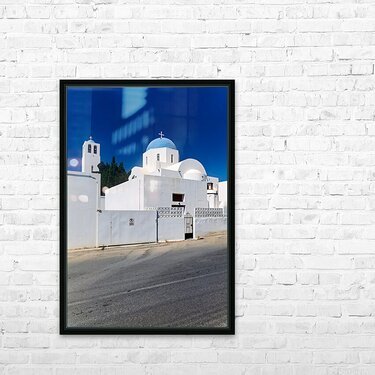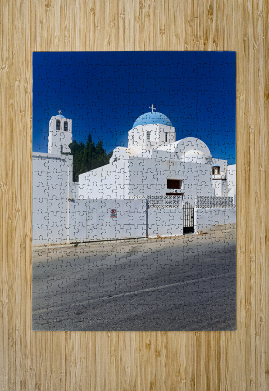 A traditional white Greek Orthodox church with a blue dome and bell tower under a clear sky characteristic of the stunning architecture on Greek islan