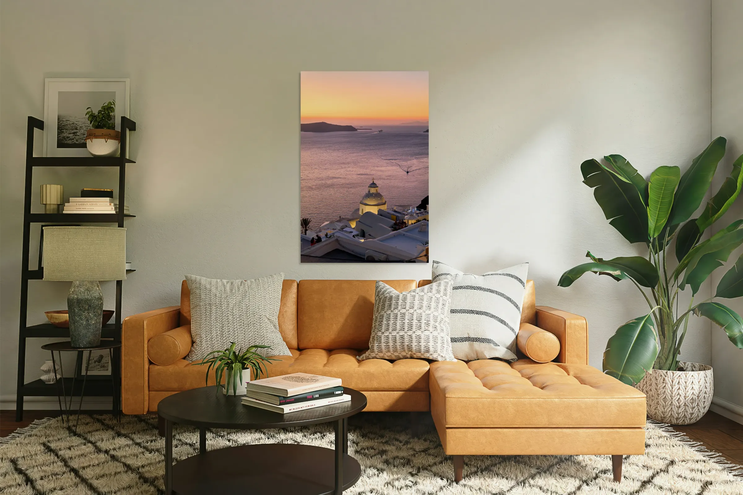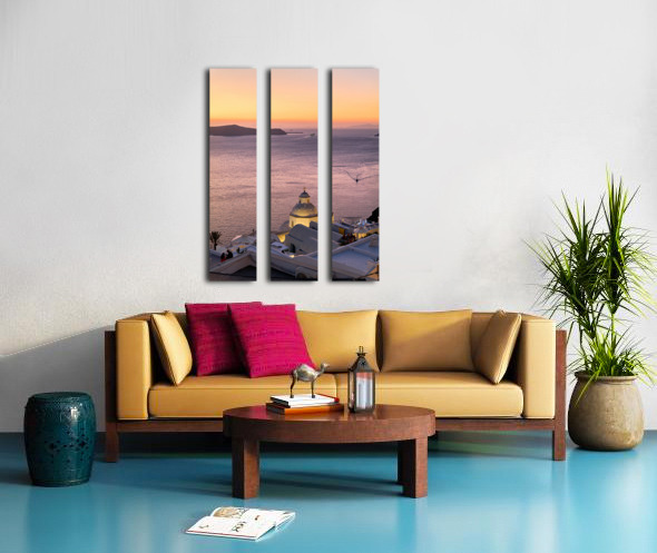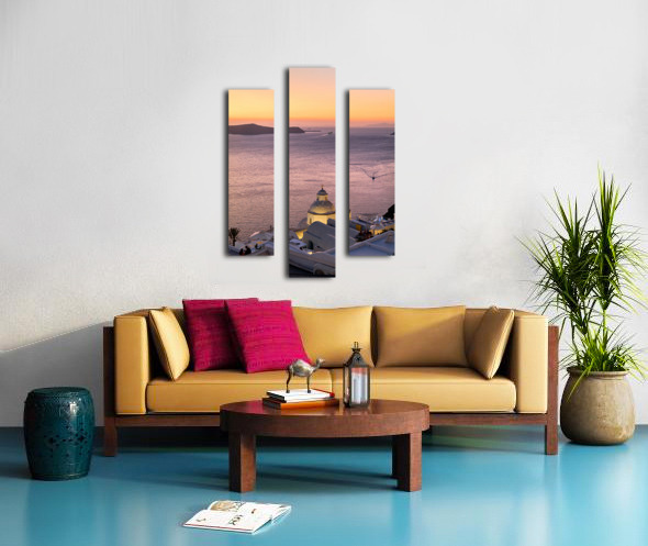 ABOUT THIS ARTWORK: SUNSET OVER SANTORINI CALDERA WITH CHURCH AND BOATS.