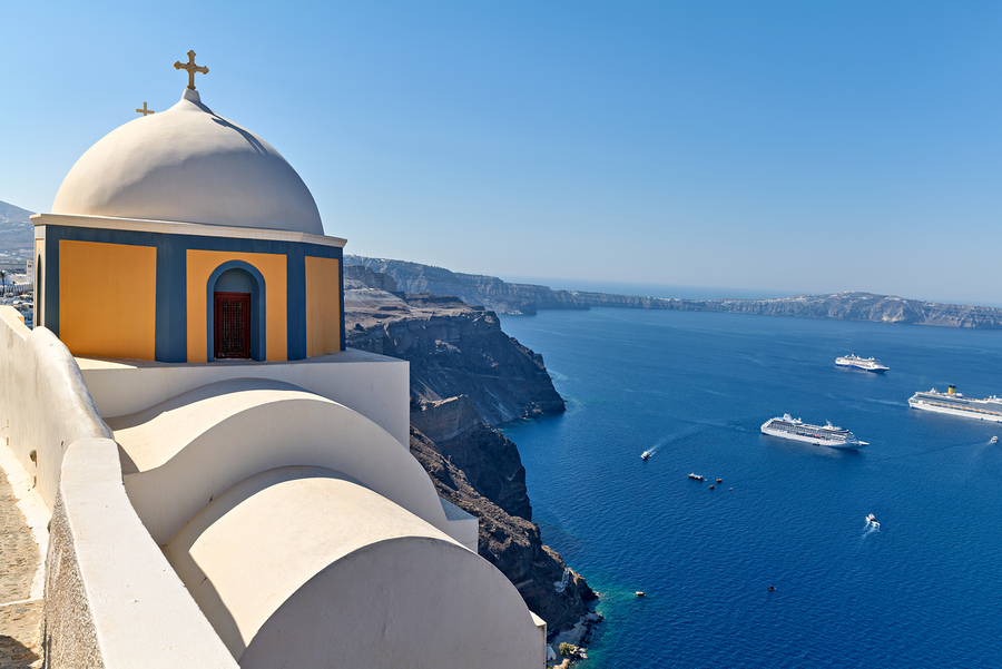 Iconic white-domed church in Santorini Greece overlooking the caldera with cruise ships and boats. Tourists visit for the stunning views.
