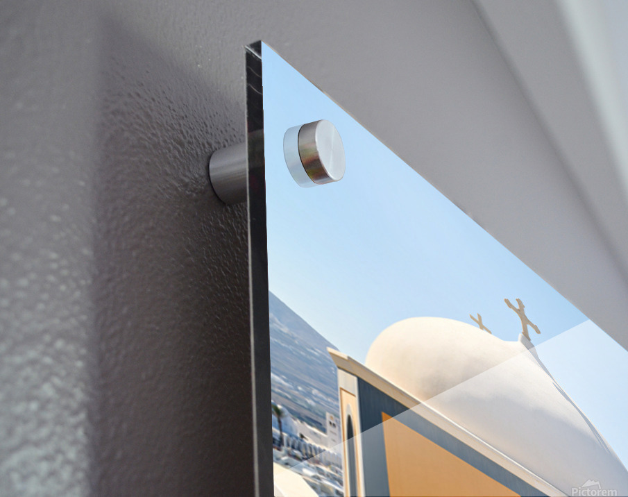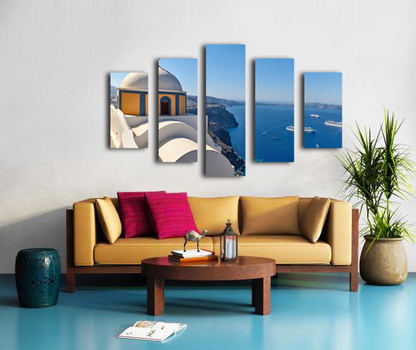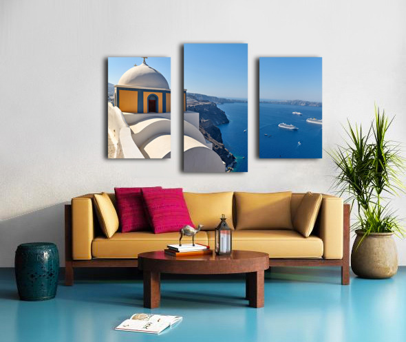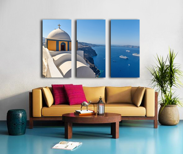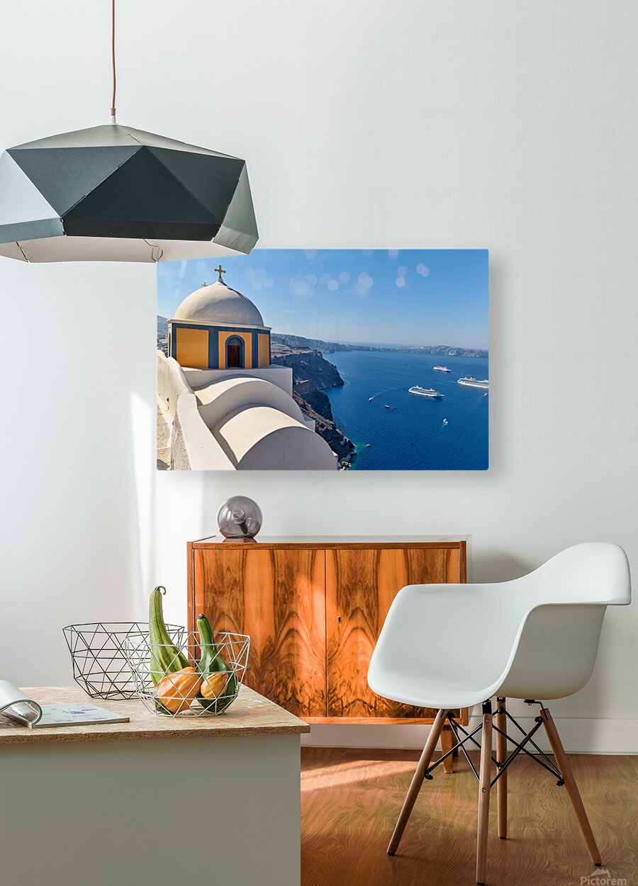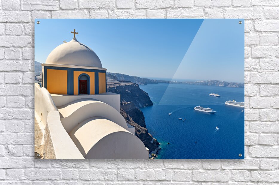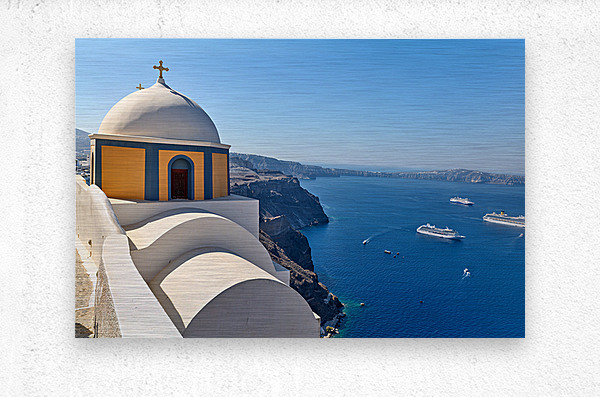 ABOUT THIS ARTWORK: SANTORINIS ICONIC CHURCH AND CALDERA WITH SHIPS.