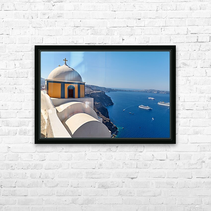 Santorinis iconic church and caldera with ships. Picture Frame Printing