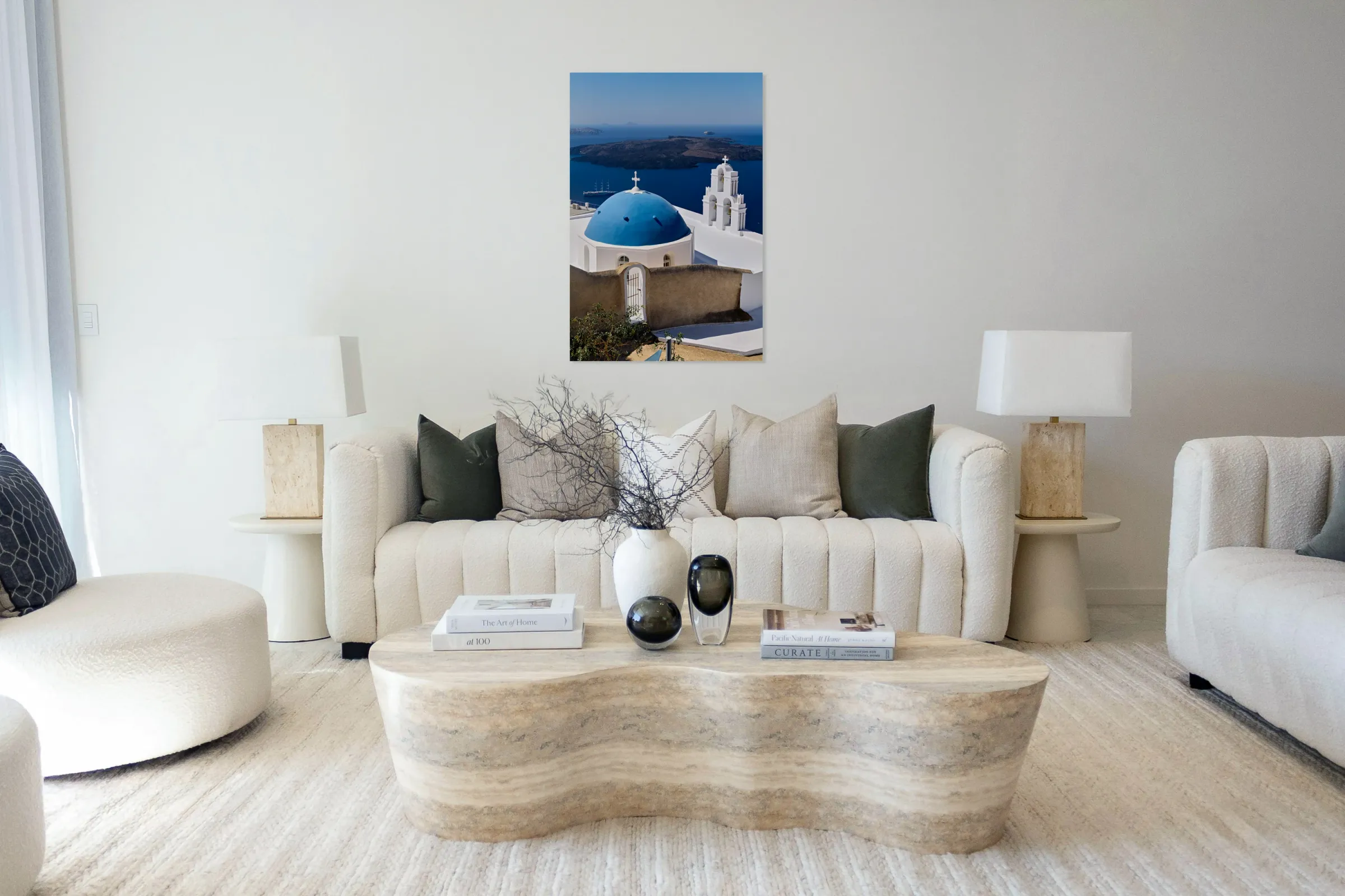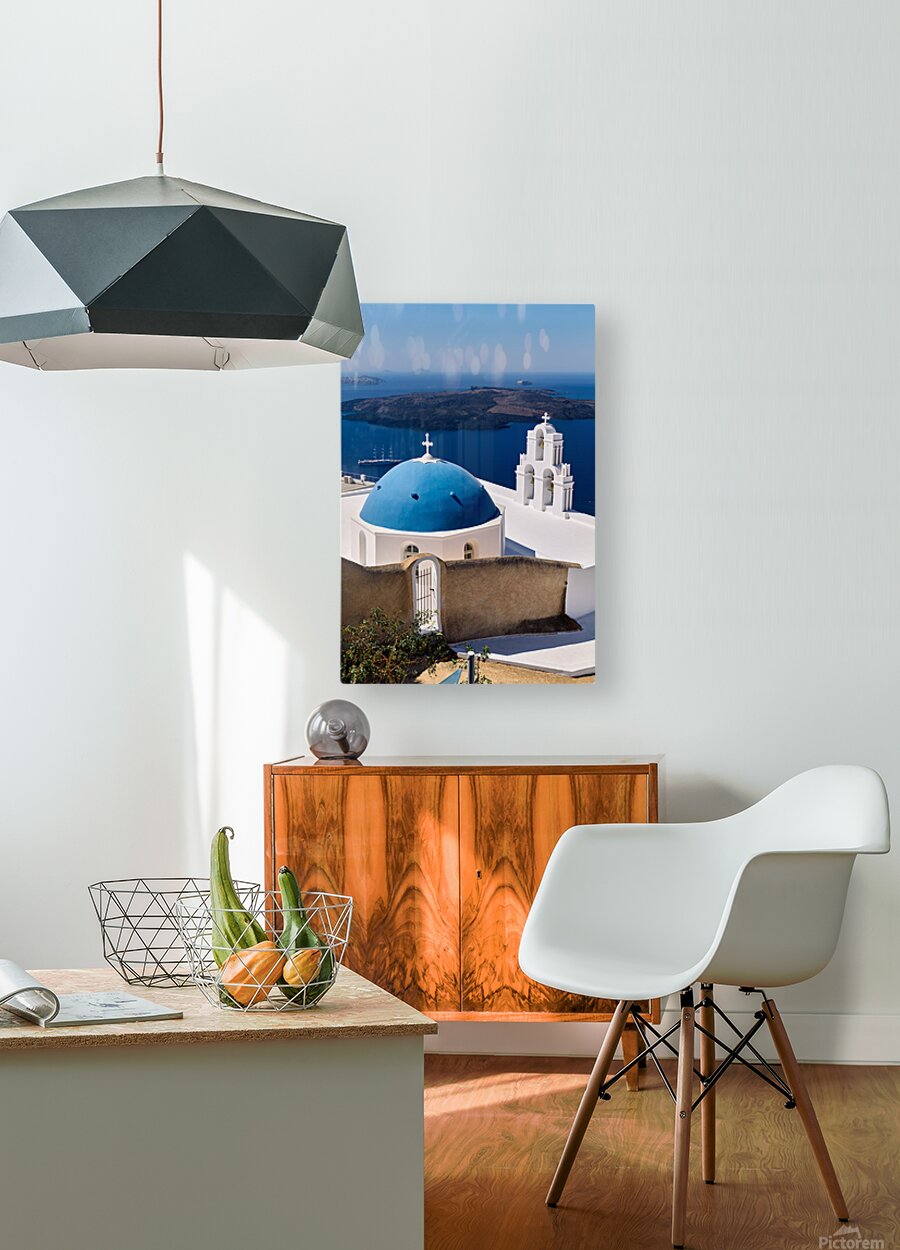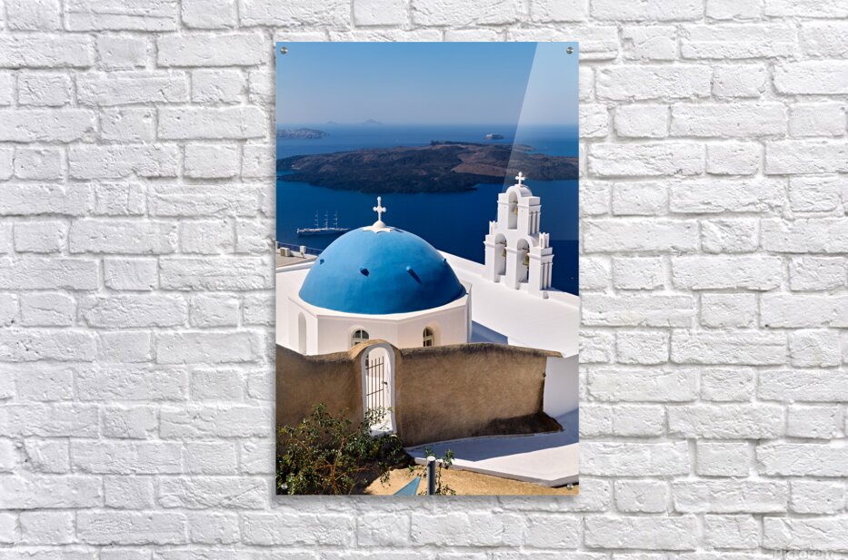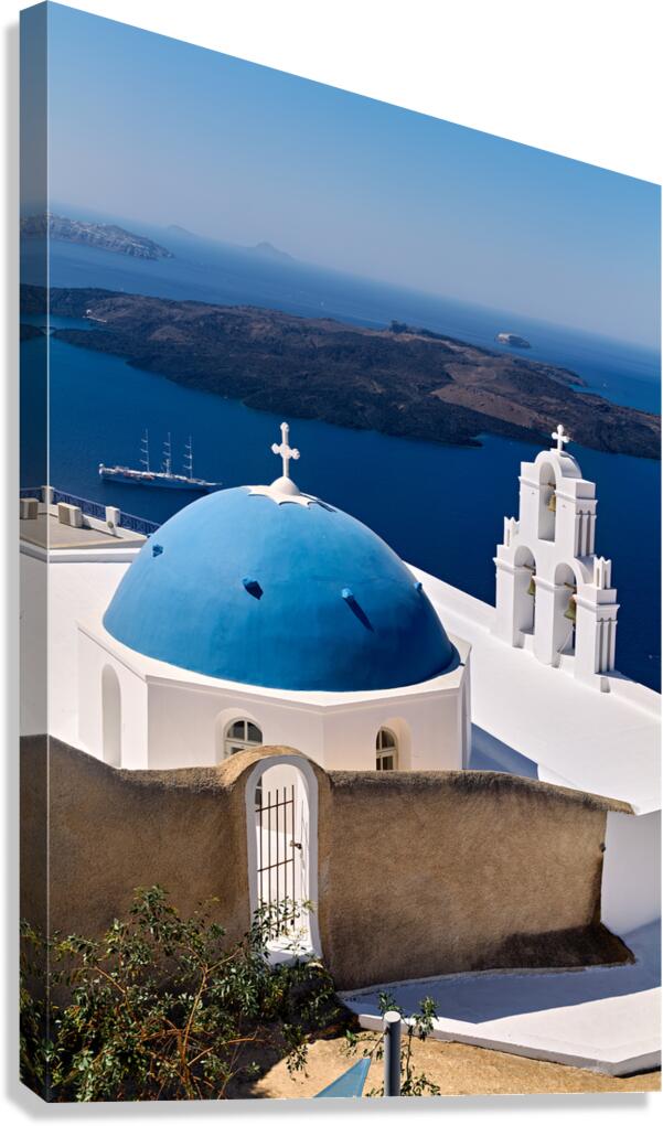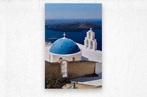 ABOUT THIS ARTWORK: SANTORINIS ICONIC BLUE DOME CHURCH AND CALDERA SEASCAPE.