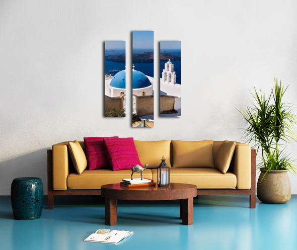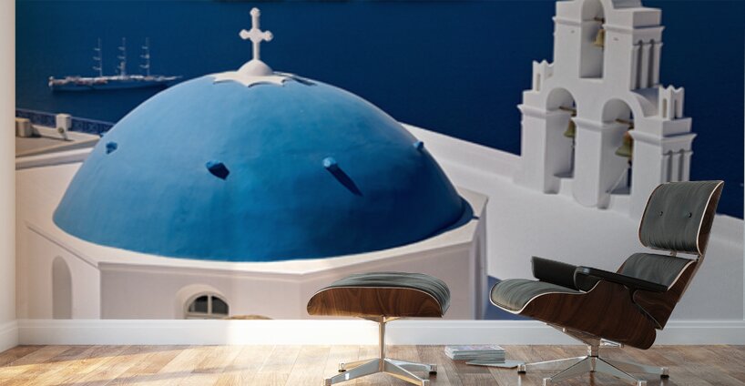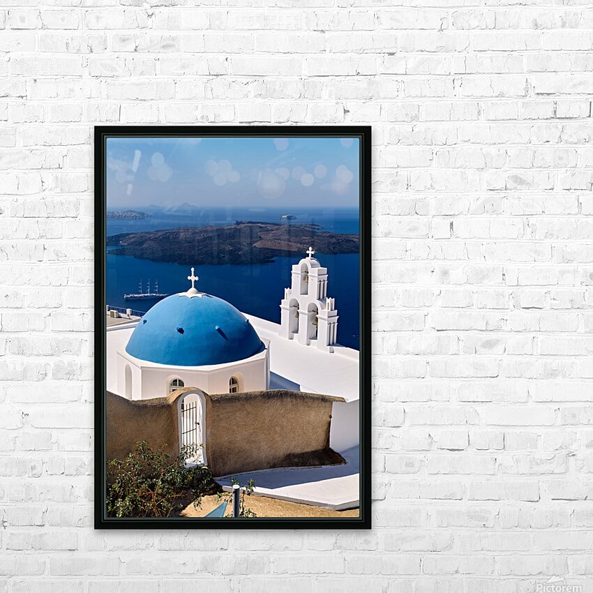 Santorinis iconic blue dome church and caldera seascape. Frame print