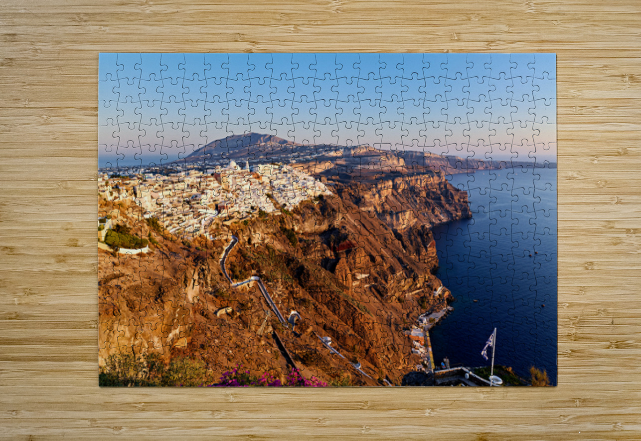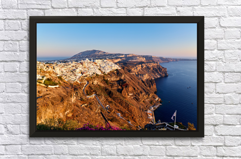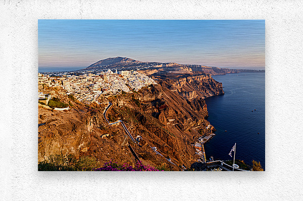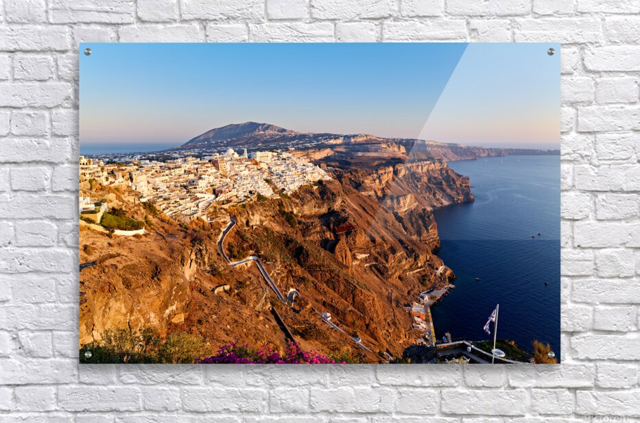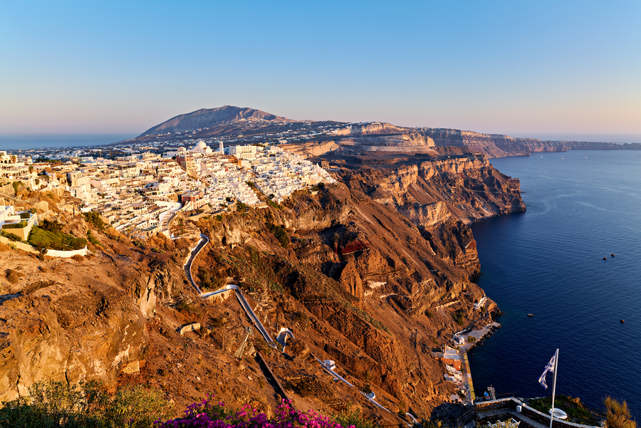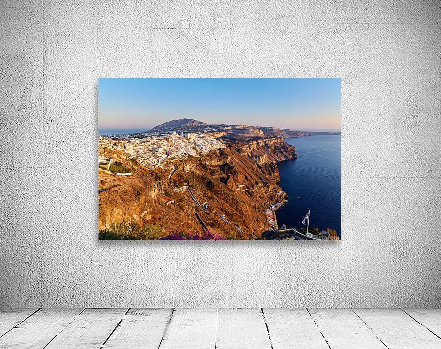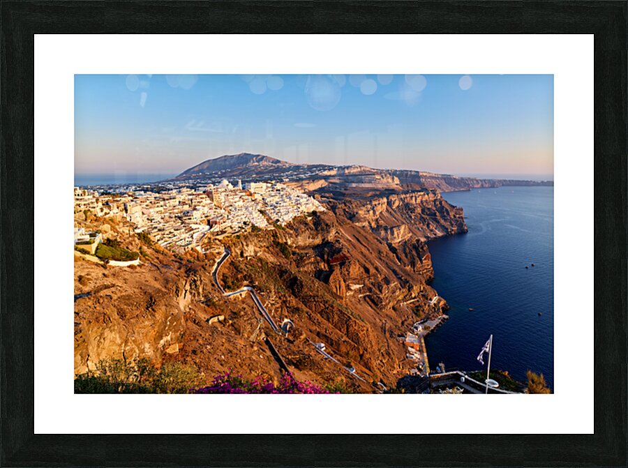Fira Santorini Greece: Iconic white buildings cascade down volcanic cliffs overlooking the Aegean Sea a popular destination for travelers enjoying the