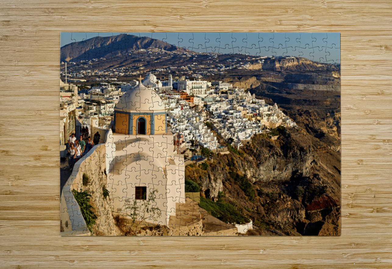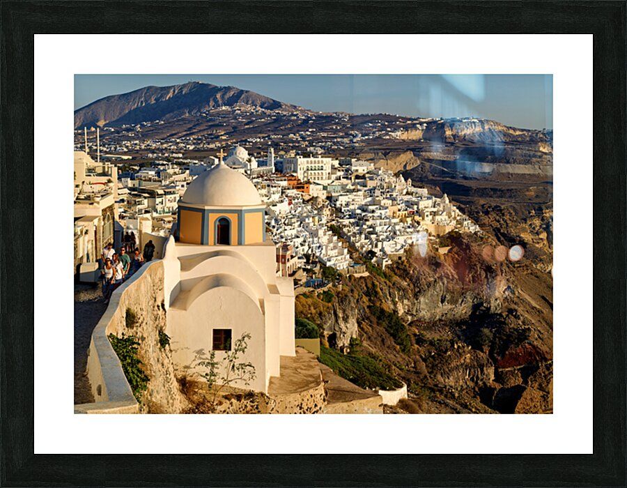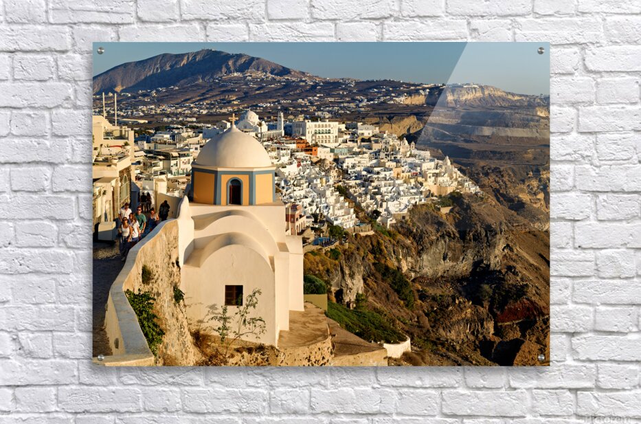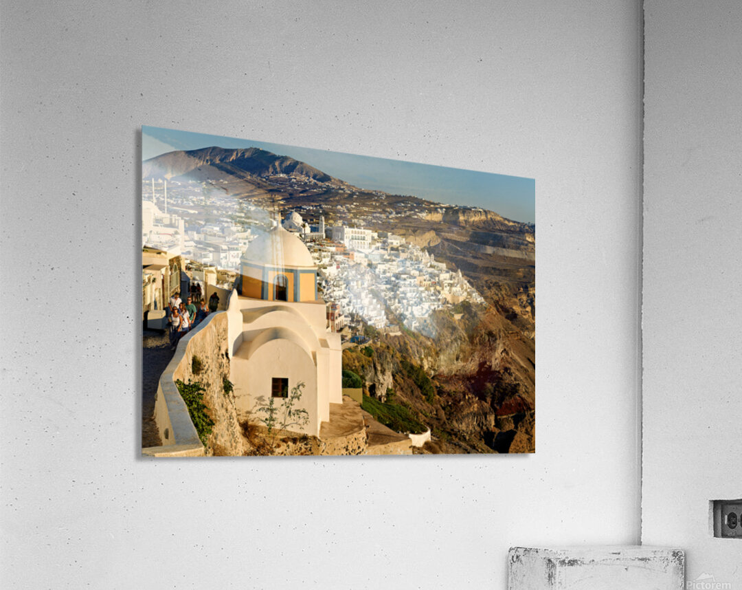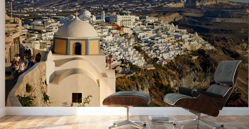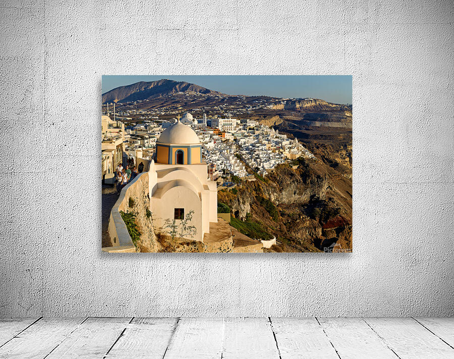 Tourists walk past a church in Fira Santorini Greece enjoying the iconic caldera views and white-washed architecture.