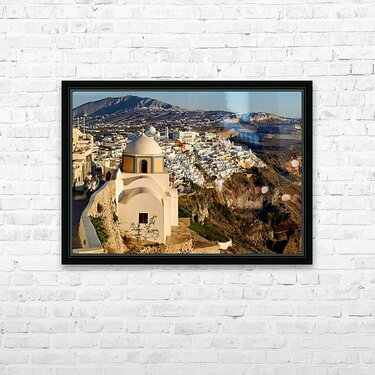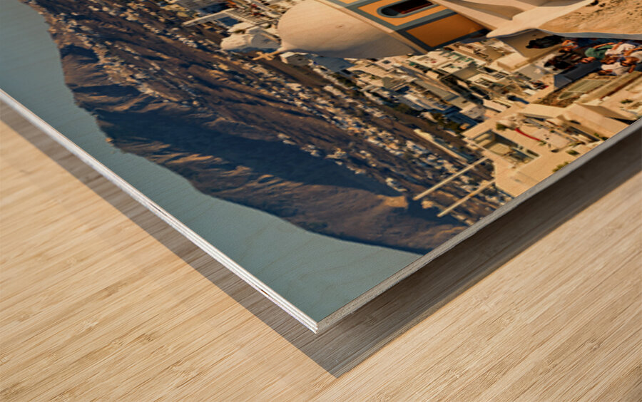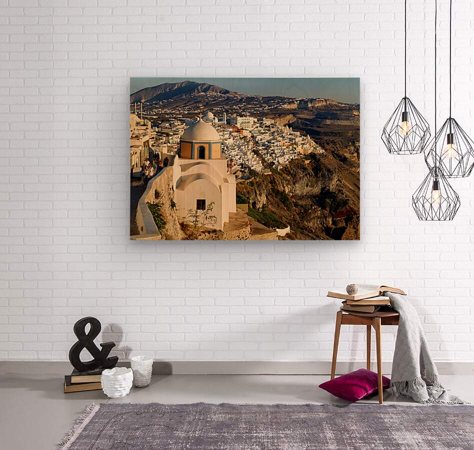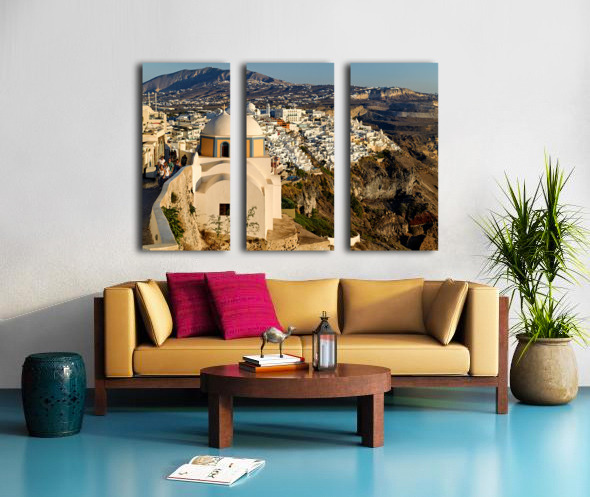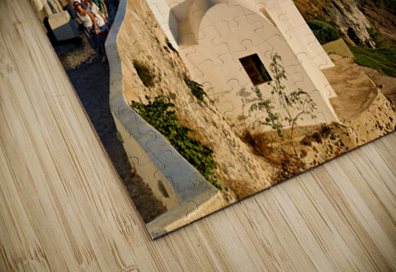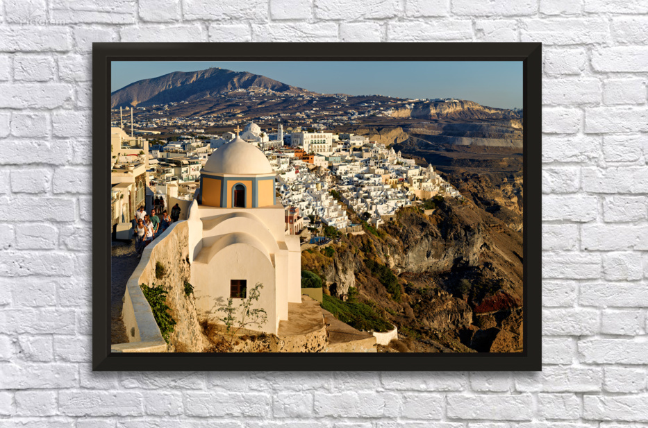 Tourists walk past a church in Fira Santorini Greece enjoying the iconic caldera views and white-washed architecture.