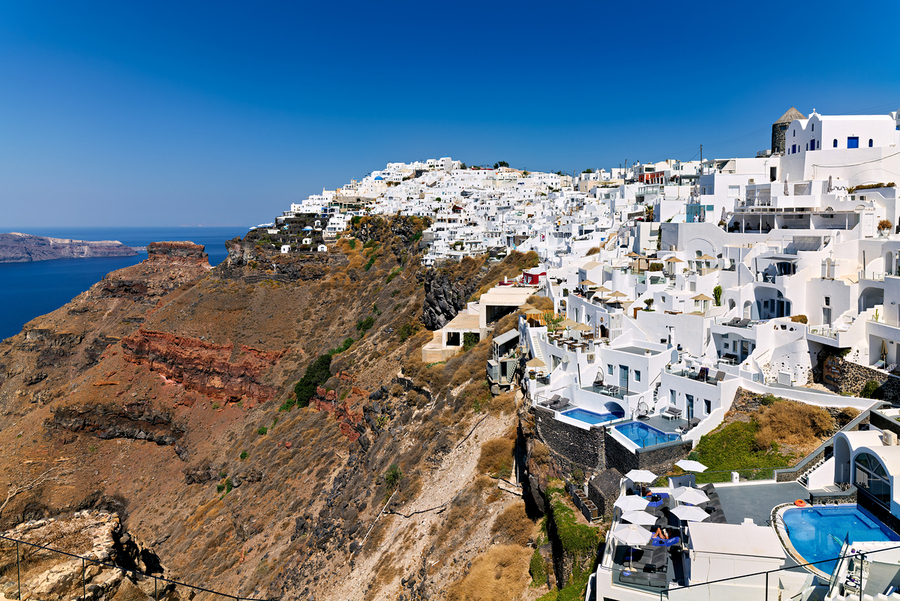 SANTORINI: WHITE CLIFFSIDE VILLAGE BLUE SEA CLEAR SKY.