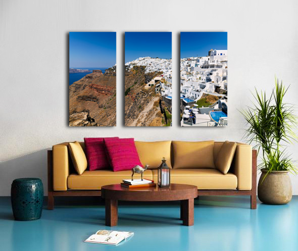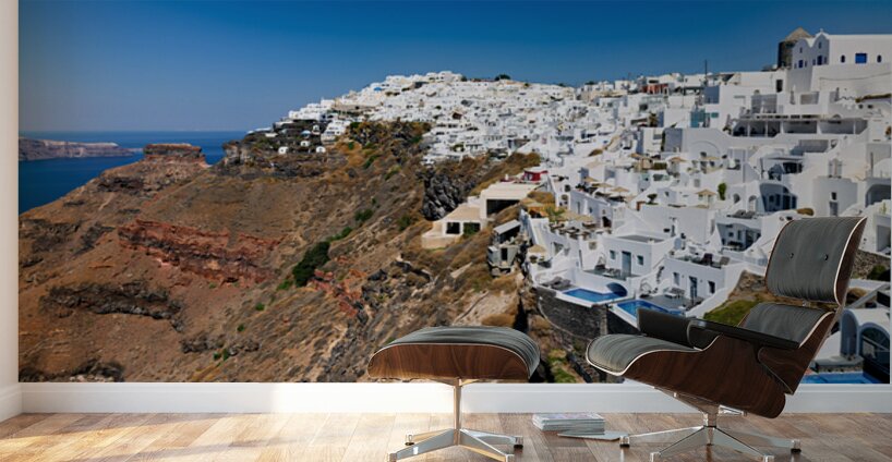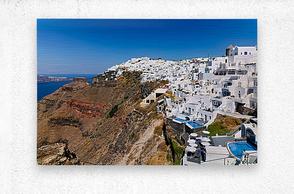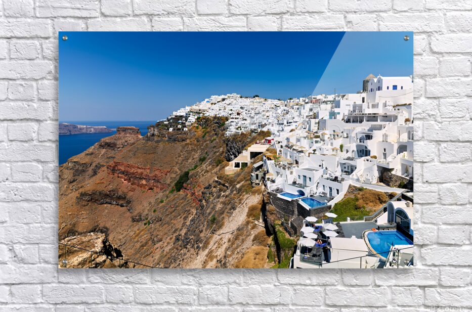 ABOUT THIS ARTWORK: SANTORINI: WHITE CLIFFSIDE VILLAGE BLUE SEA CLEAR SKY.