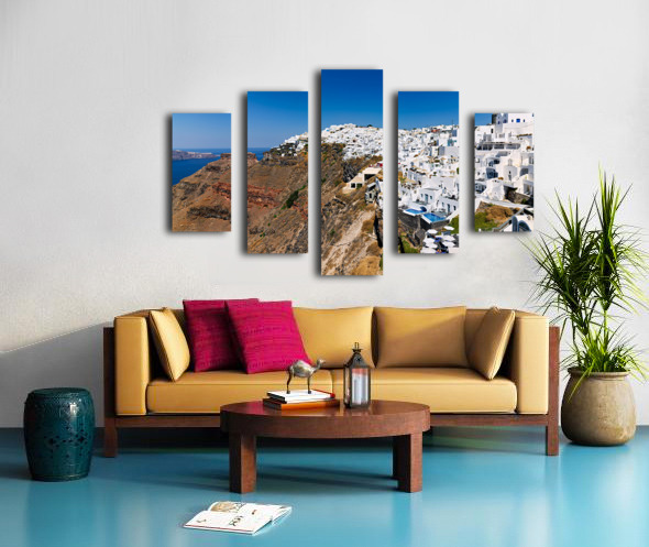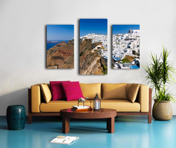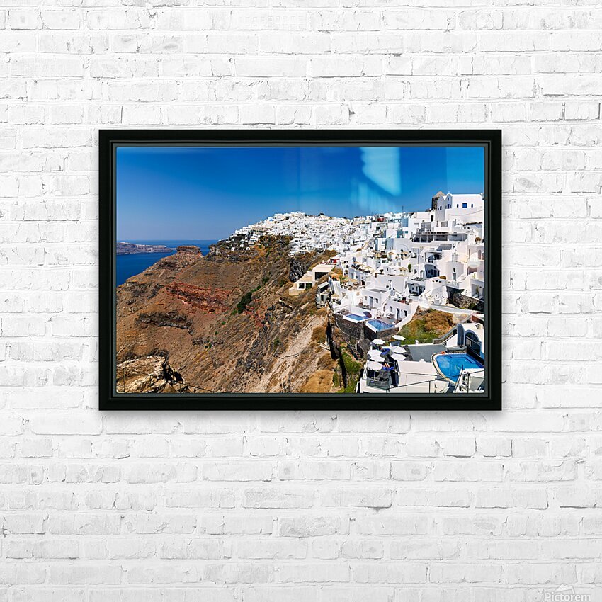 Santorini: White cliffside village blue sea clear sky. Frame print