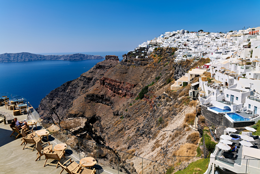 SANTORINIS WHITE CLIFFSIDE VILLAGE AND CALDERA VIEW.