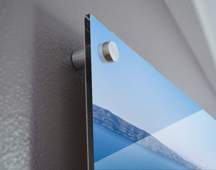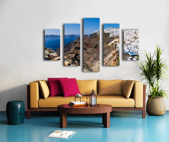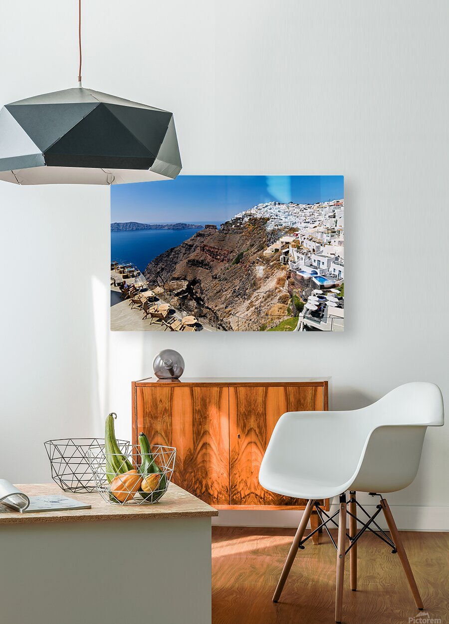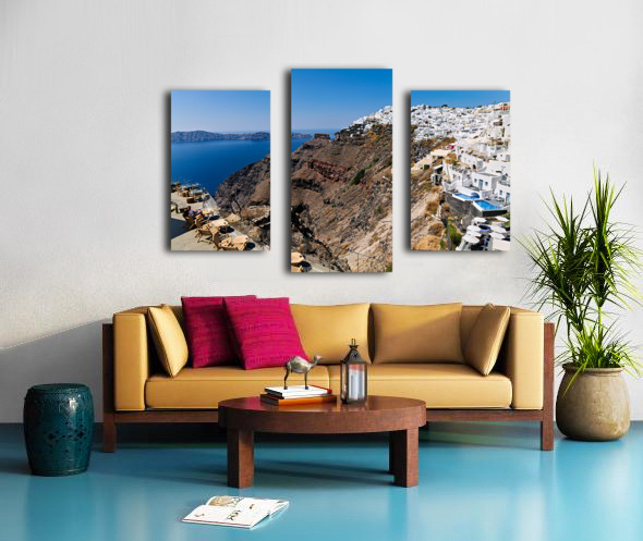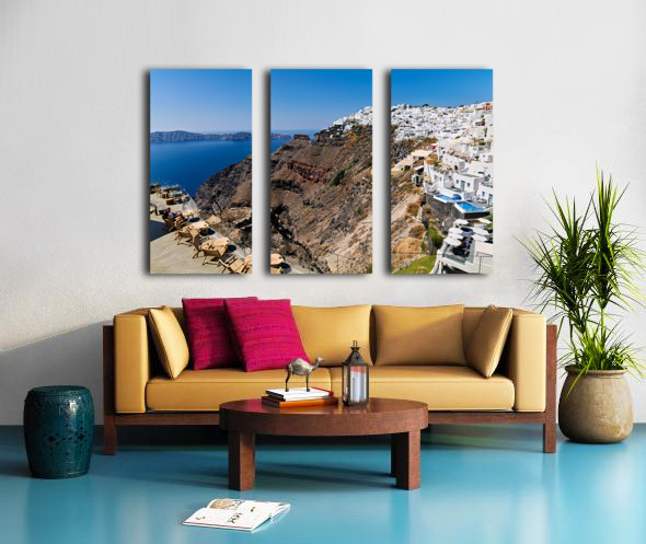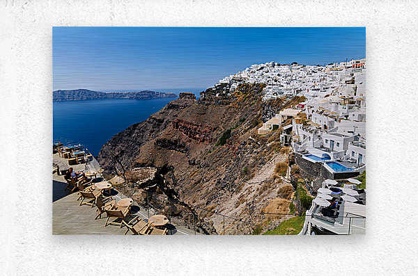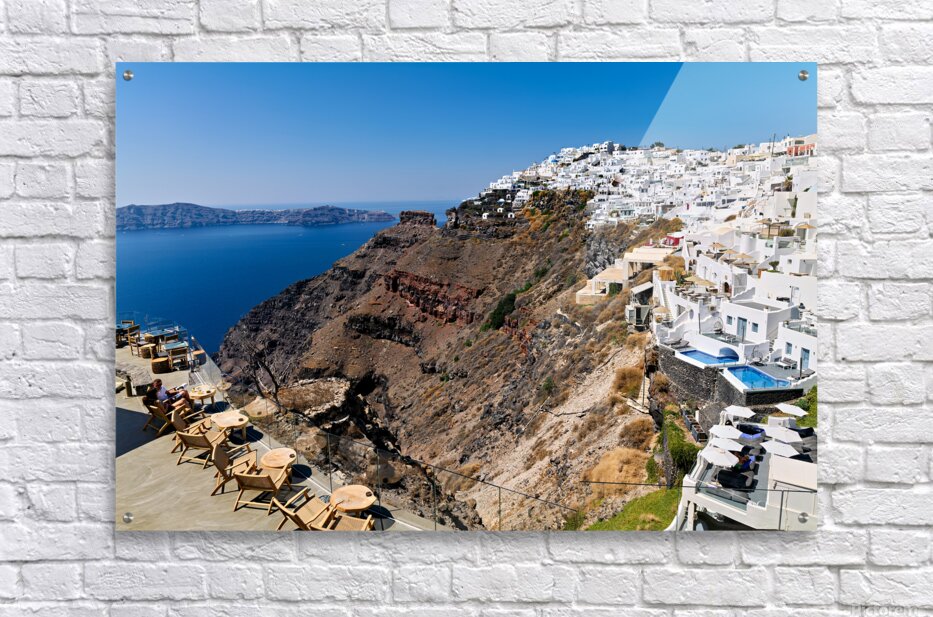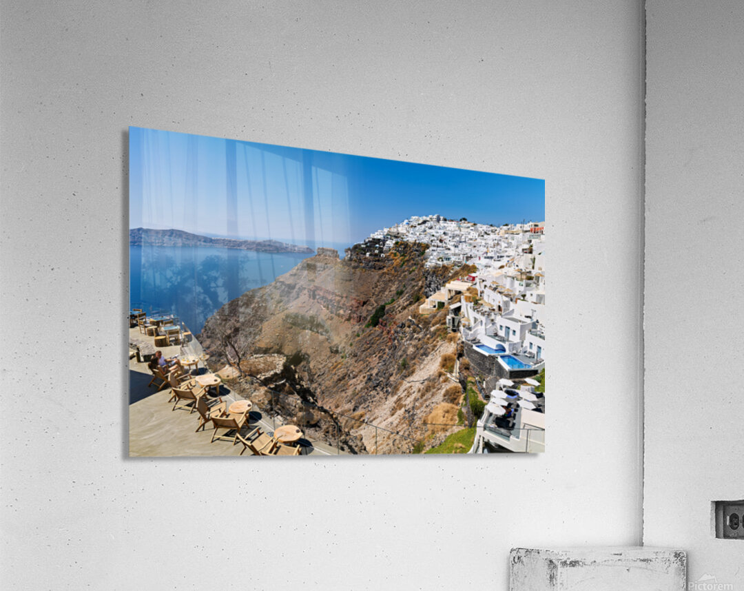 ABOUT THIS ARTWORK: SANTORINIS WHITE CLIFFSIDE VILLAGE AND CALDERA VIEW.