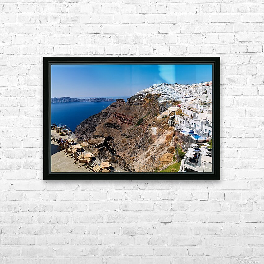 Santorinis white cliffside village and caldera view. Picture Frame Printing