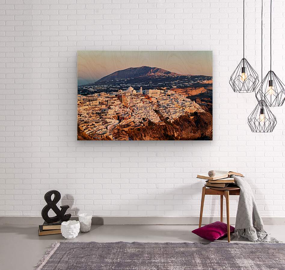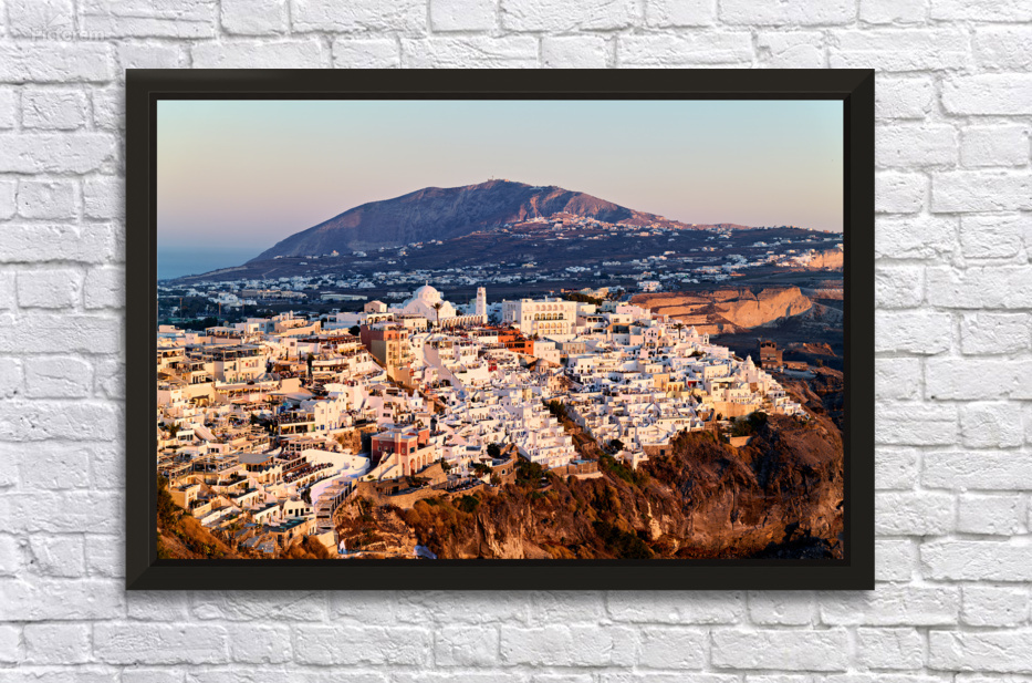 "Santorini cliffside town at sunset with mountain backdrop." in a framed print.