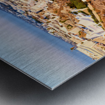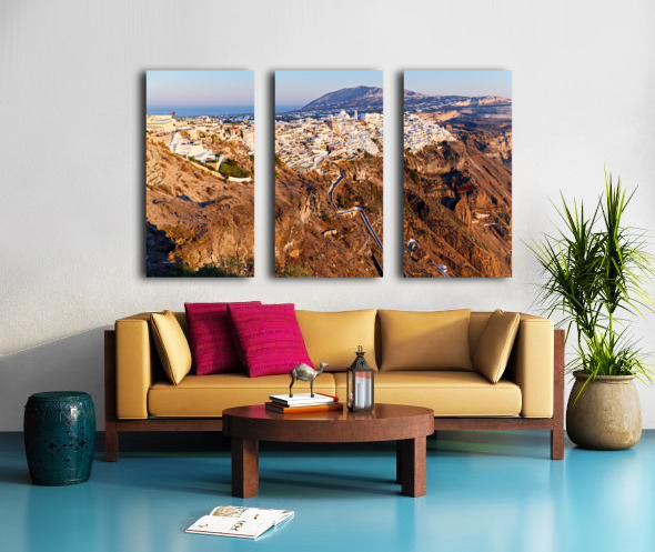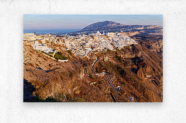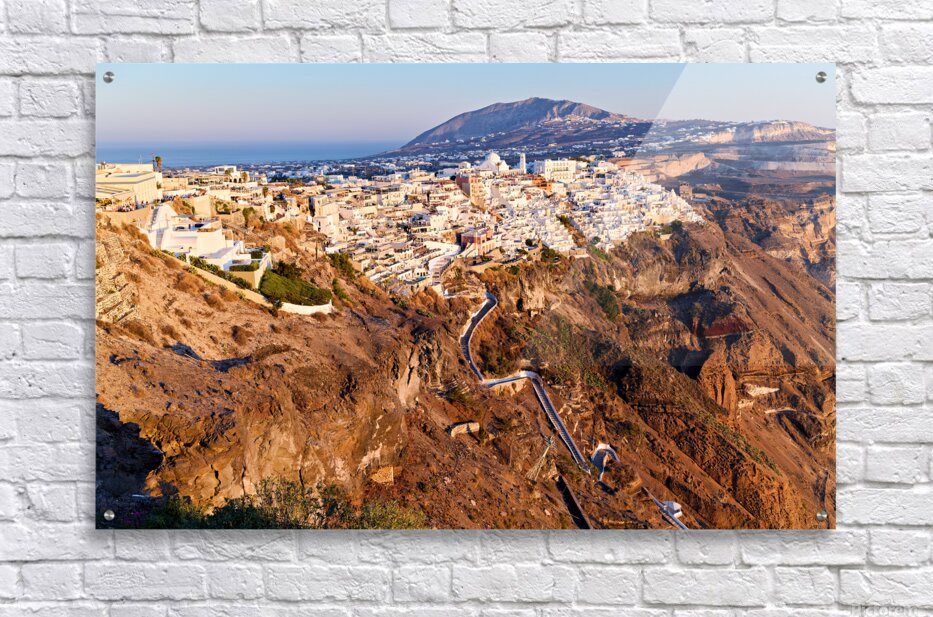 ABOUT THIS ARTWORK: SANTORINIS FIRA TOWN ON CALDERA CLIFF AT SUNSET.