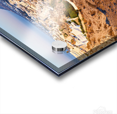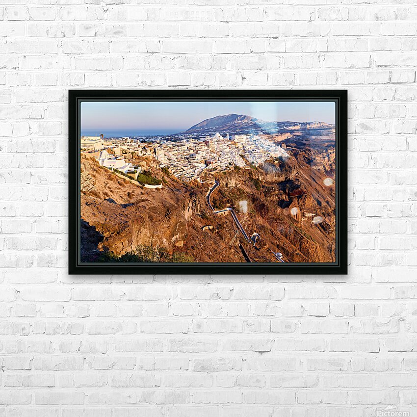 Santorinis Fira town on caldera cliff at sunset. Picture Frame Printing