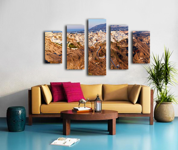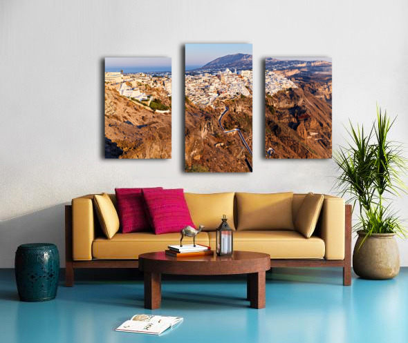 Santorinis Fira town on caldera cliff at sunset. Frame print