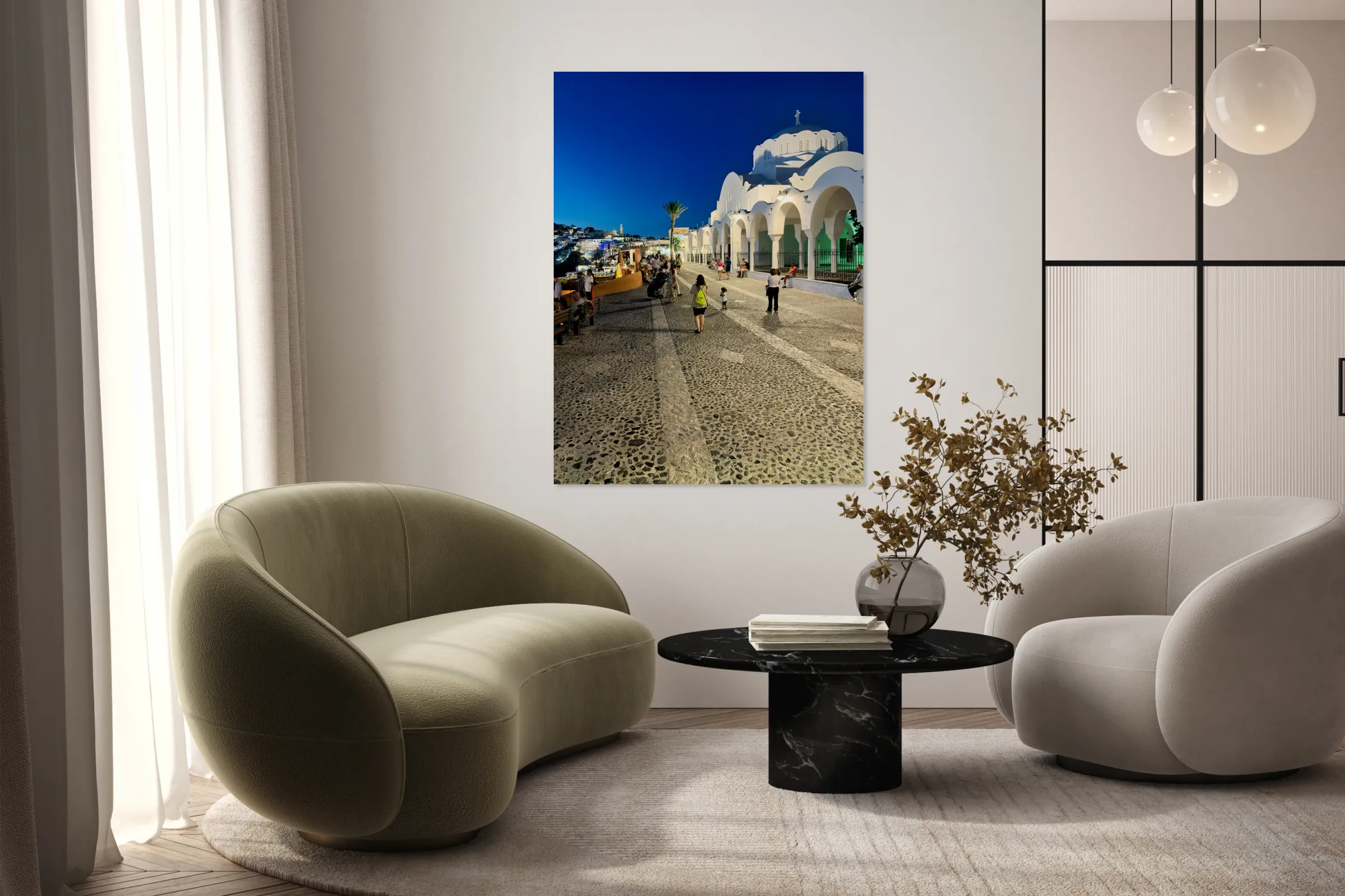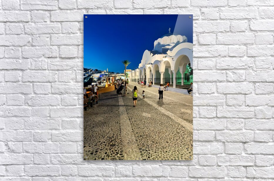 ABOUT THIS ARTWORK: SANTORINIS ICONIC WHITE CHURCH AND BUSTLING STREET AT DUSK.