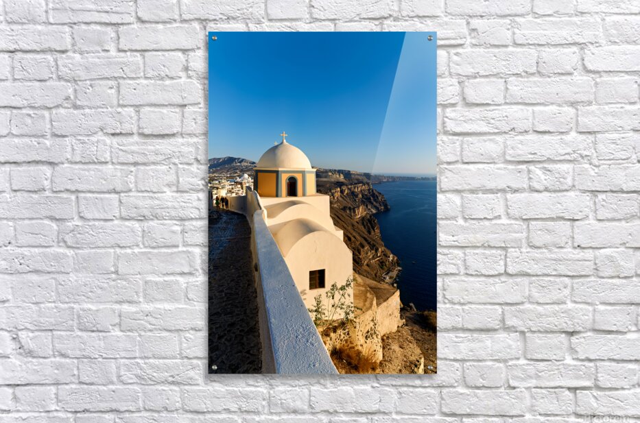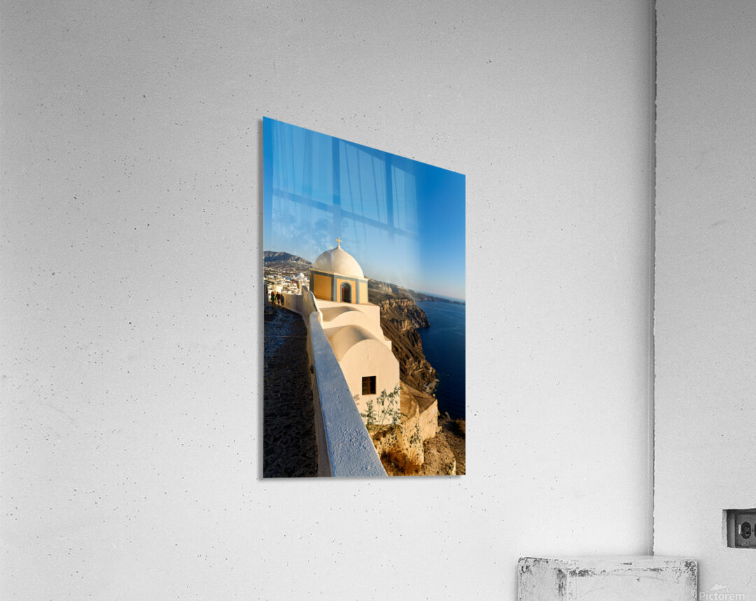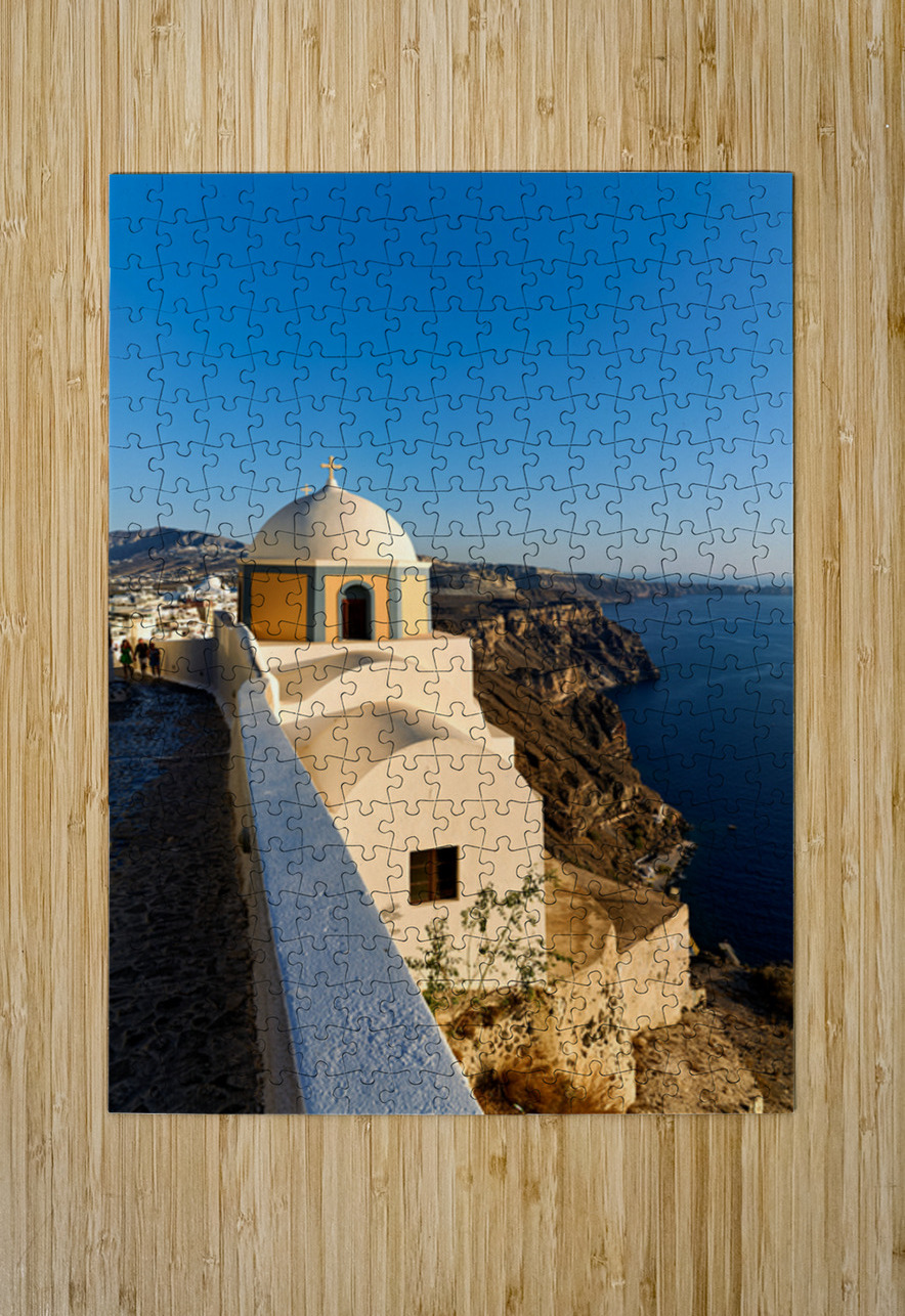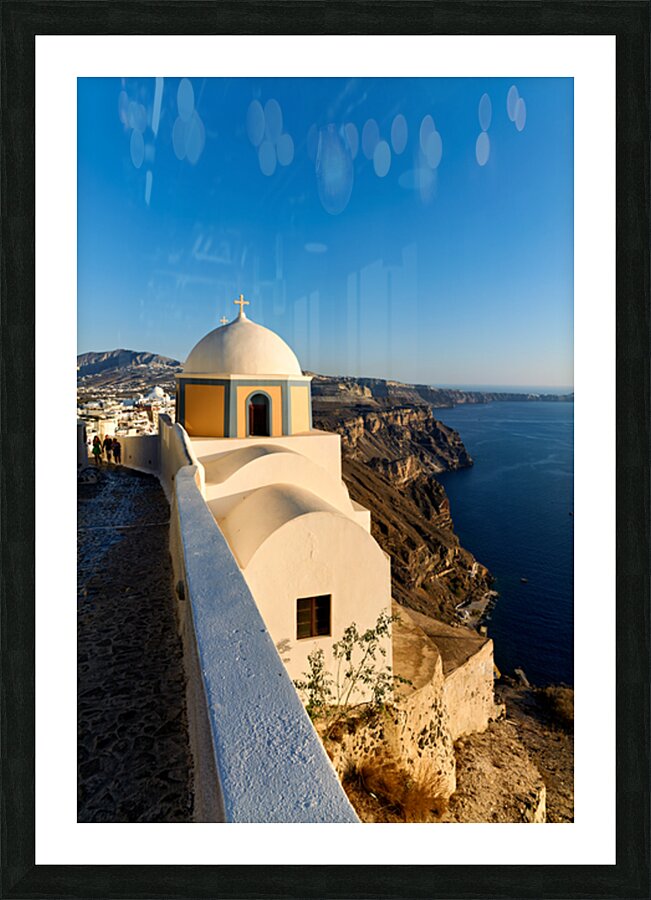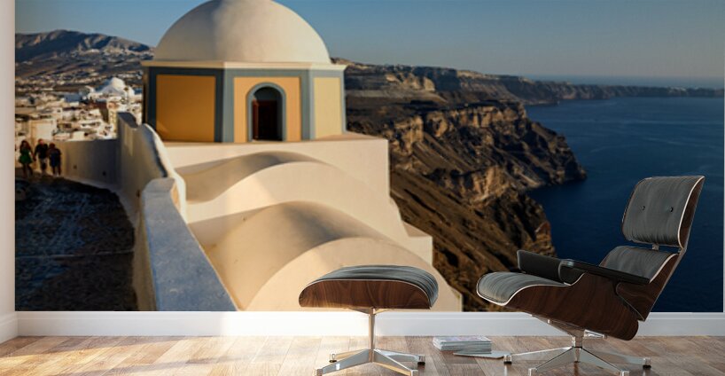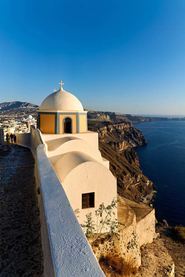 Tourists walk past a beautiful church in Santorini Greece enjoying the stunning caldera views and traditional architecture under a clear blue sky.
