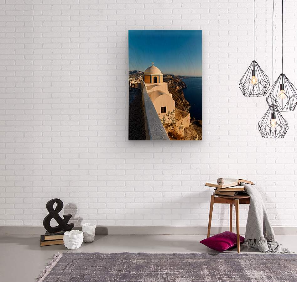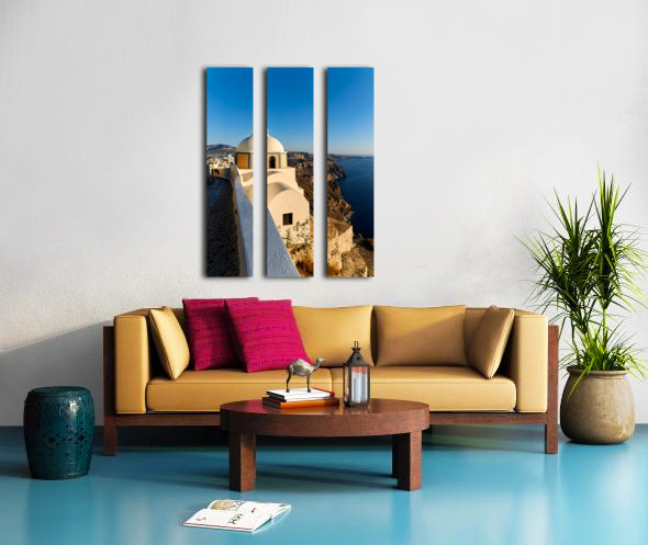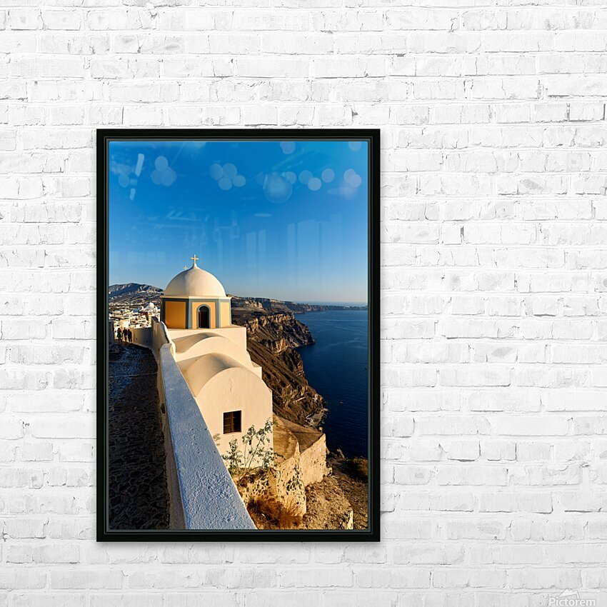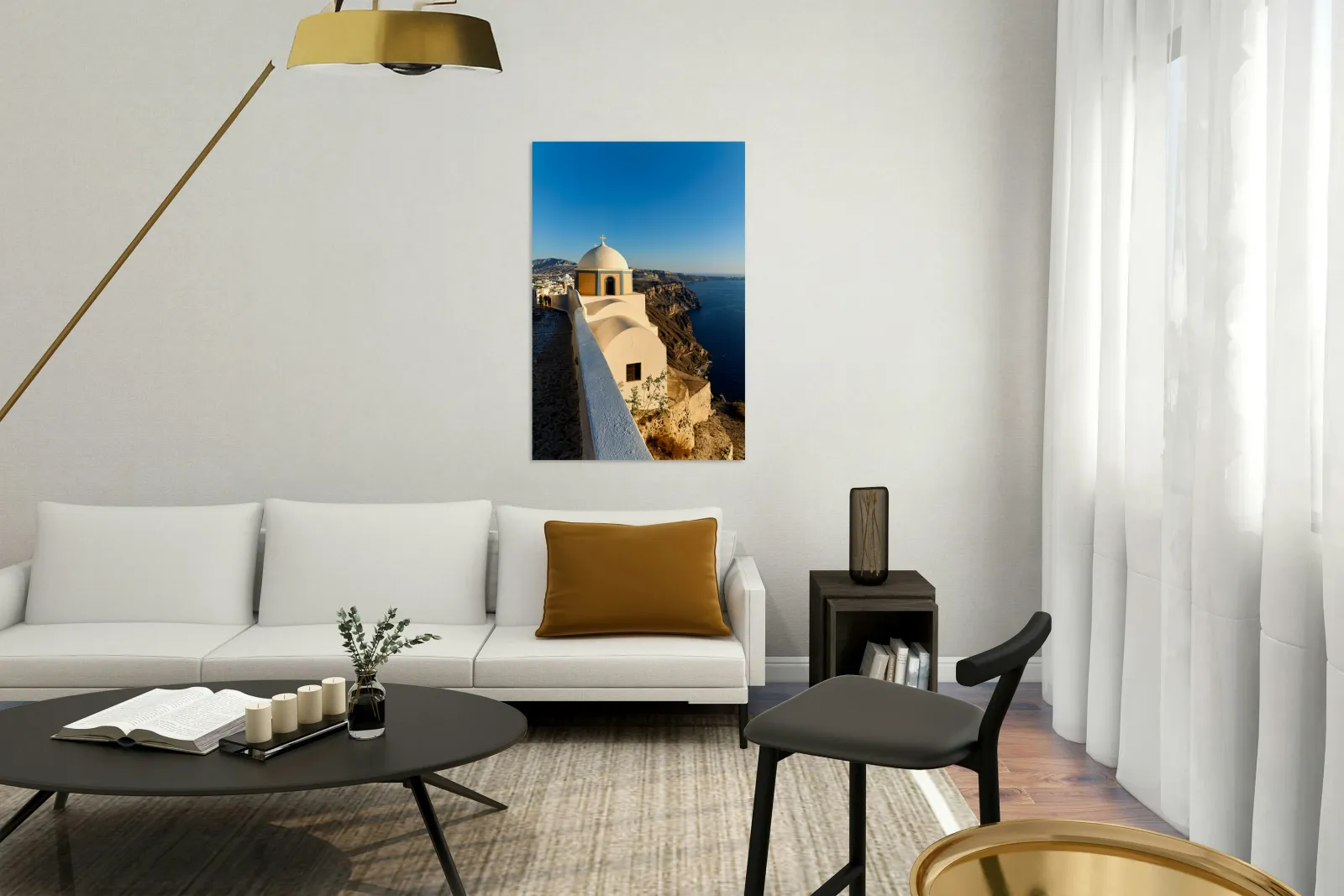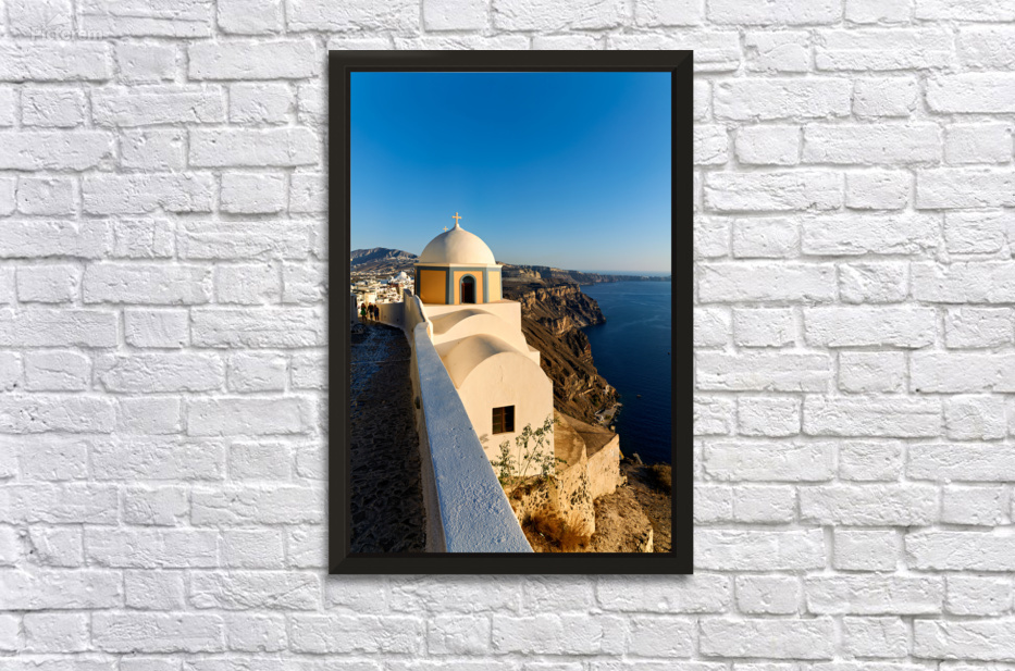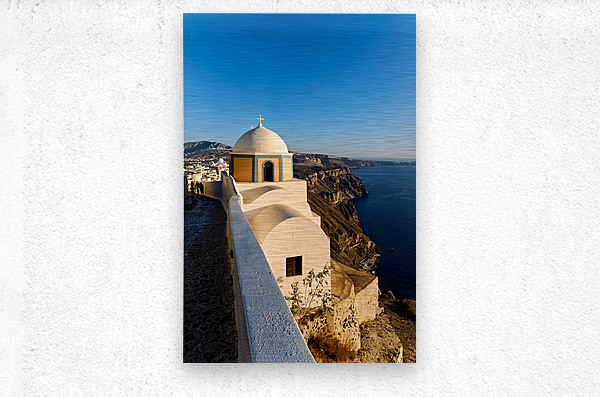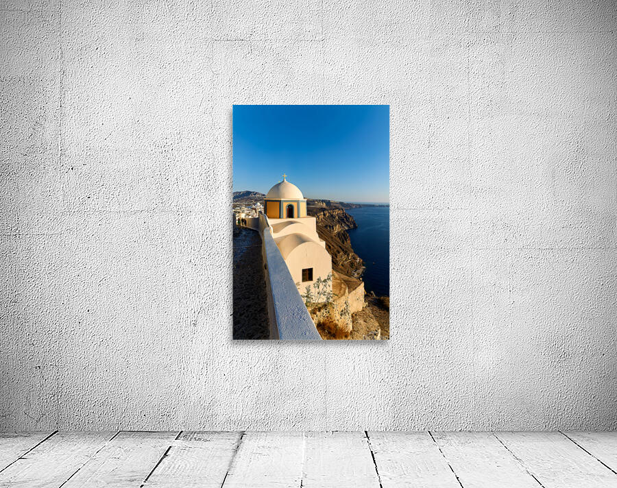 Tourists walk past a beautiful church in Santorini Greece enjoying the stunning caldera views and traditional architecture under a clear blue sky.