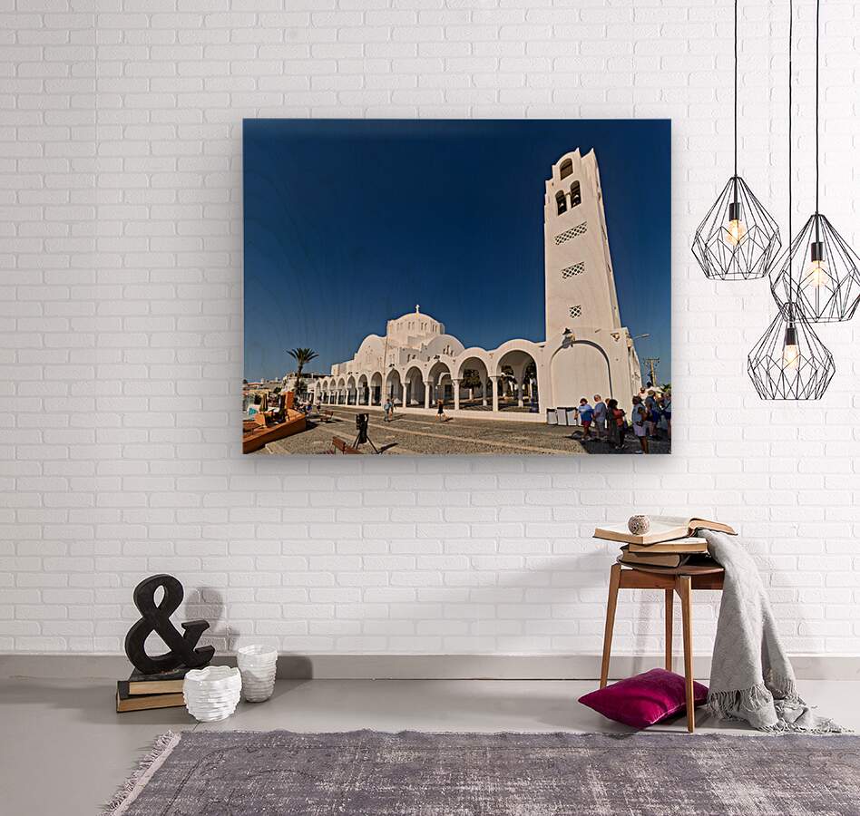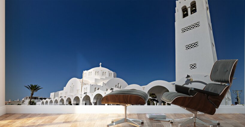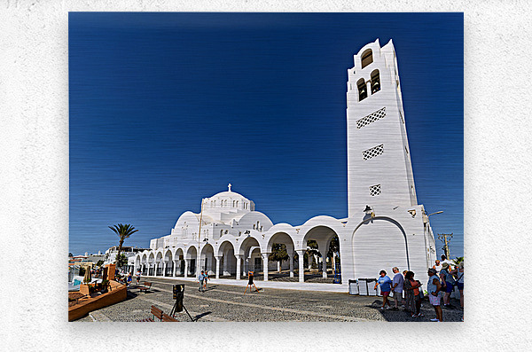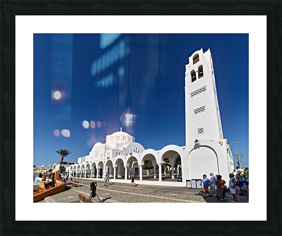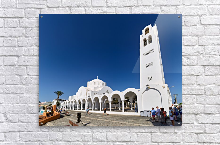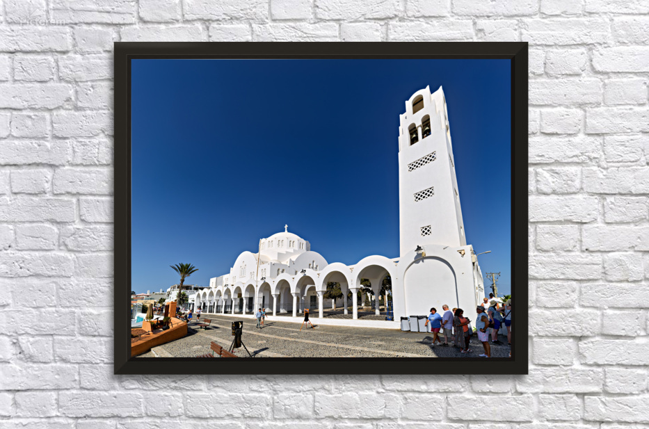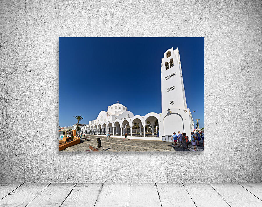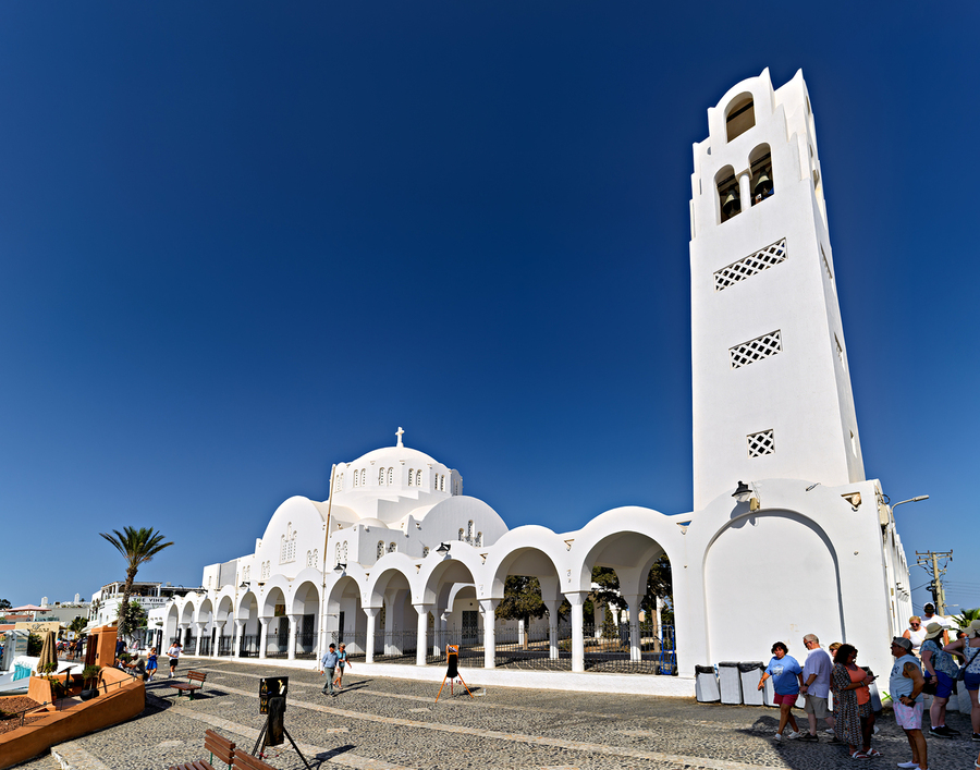 Tourists explore the beautiful white Orthodox Metropolitan Cathedral in Fira Santorini Greece enjoying the sunny day and iconic architecture.